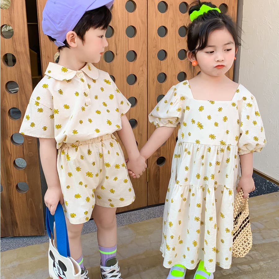 子供らしい可愛い小花の総柄シャツとショートパンツのセットアップ。