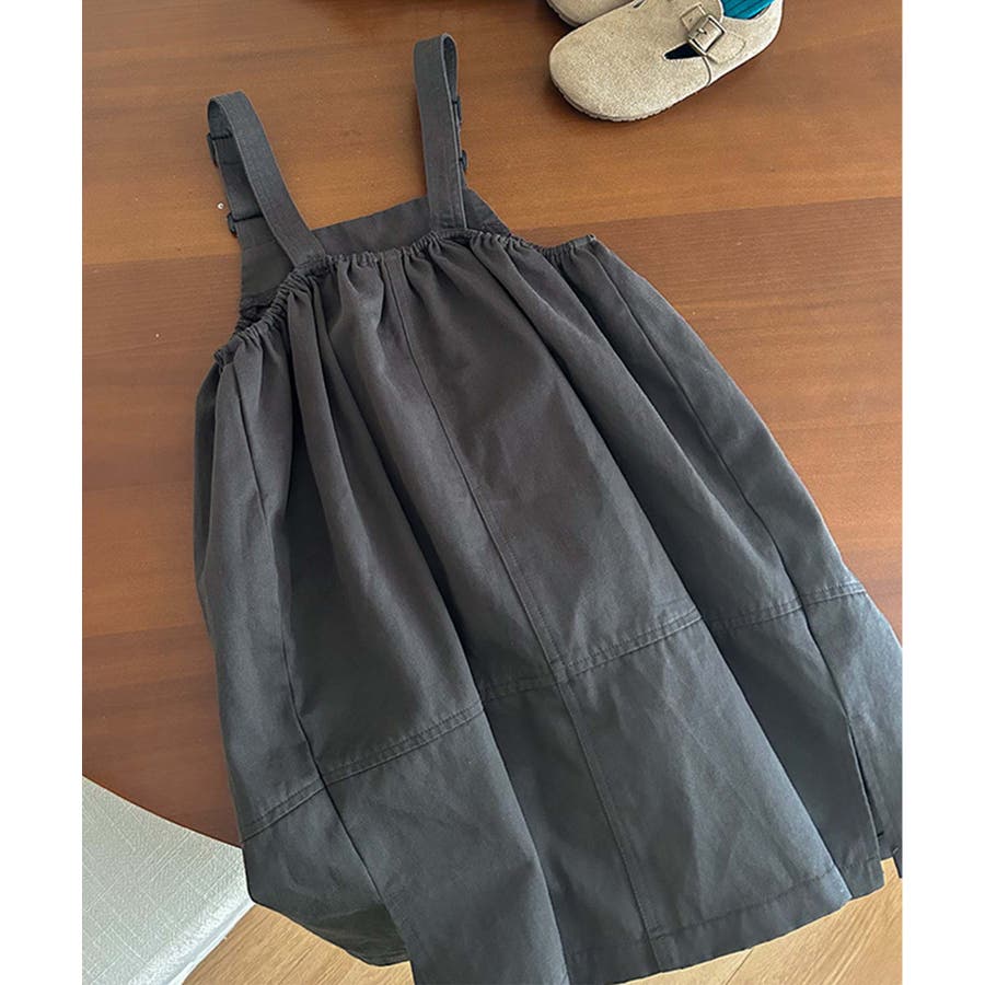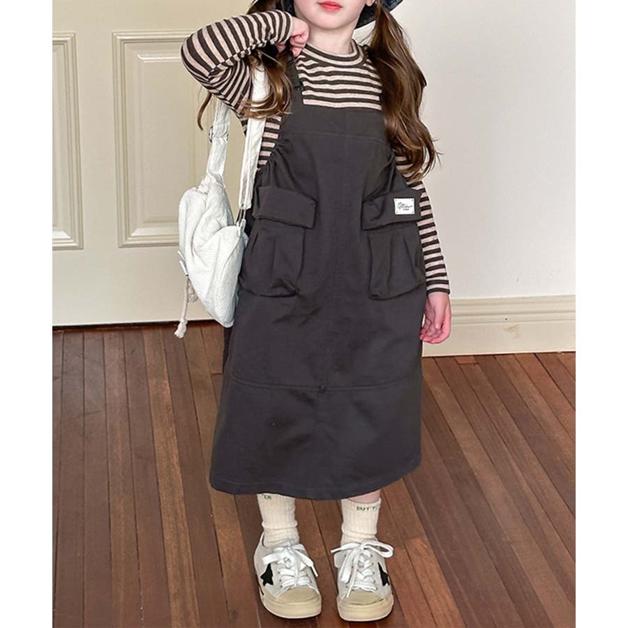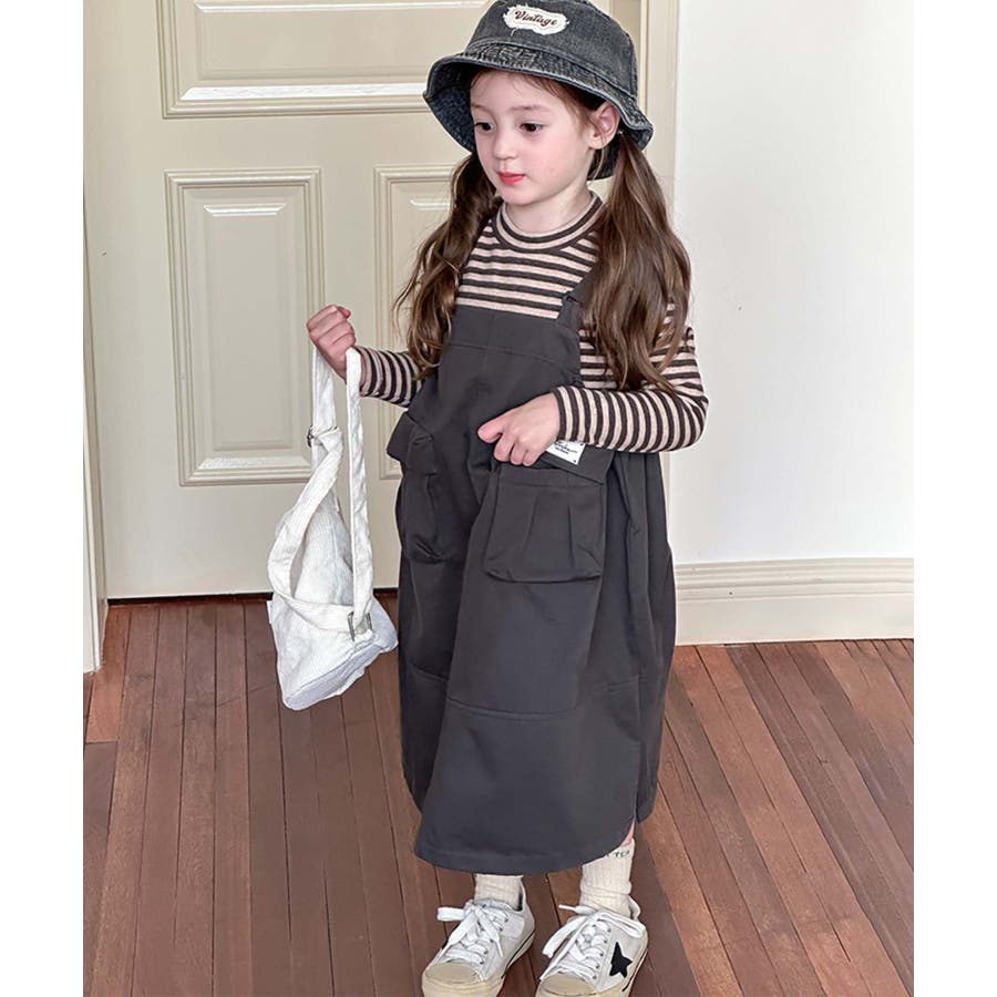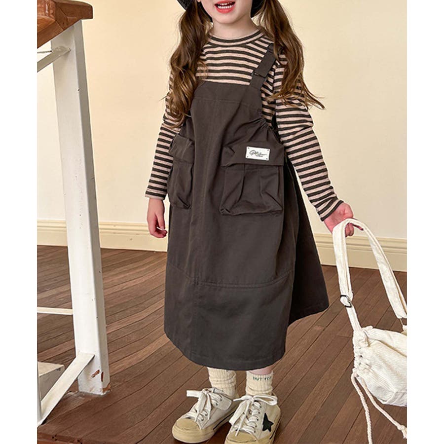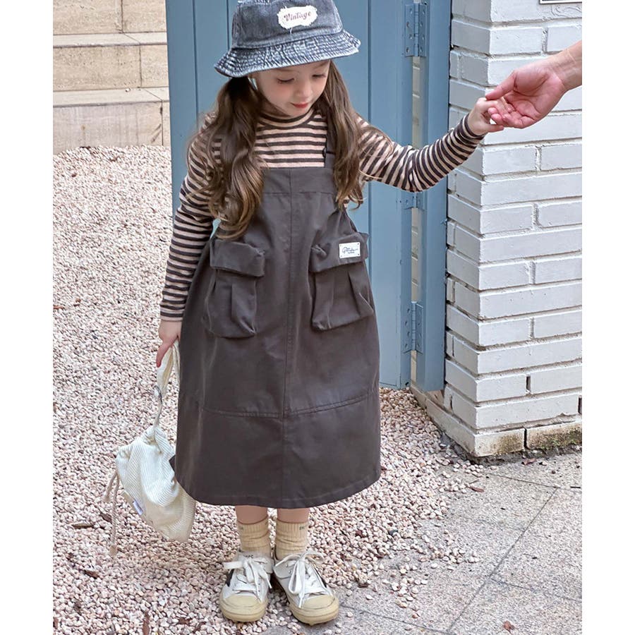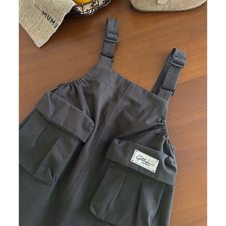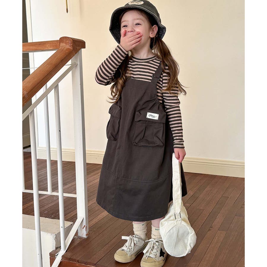 無地のダークカラーを基調としたシンプルなジャンパースカートで、ヴィンテージ感のある大人っぽい印象を与えます。大きなポケットがデザインのアクセントとなりながら実用性をプラス。ストラップ部分で調整可能。成長期の子供でも長く着用できます。