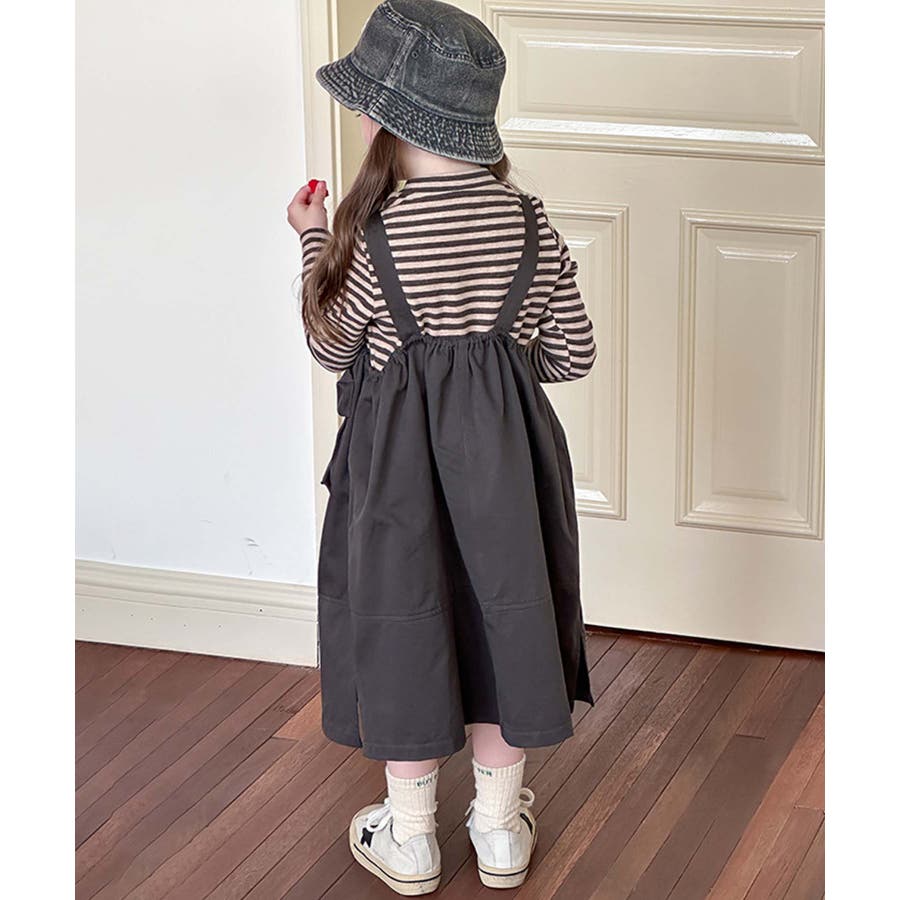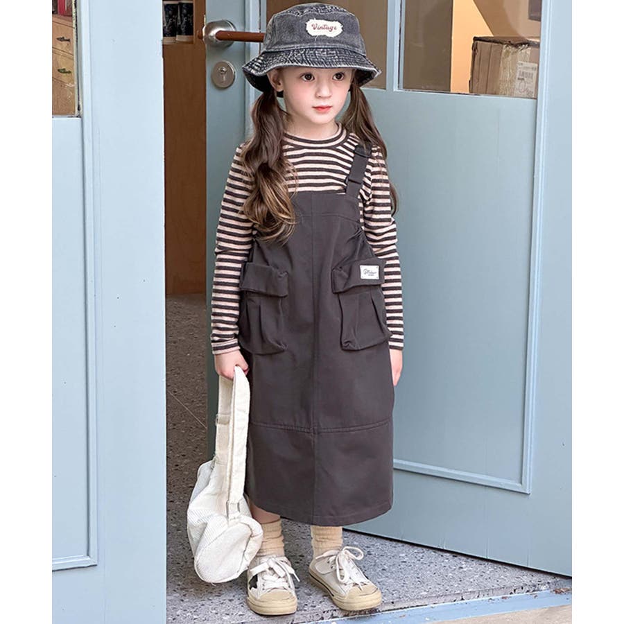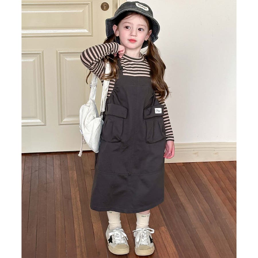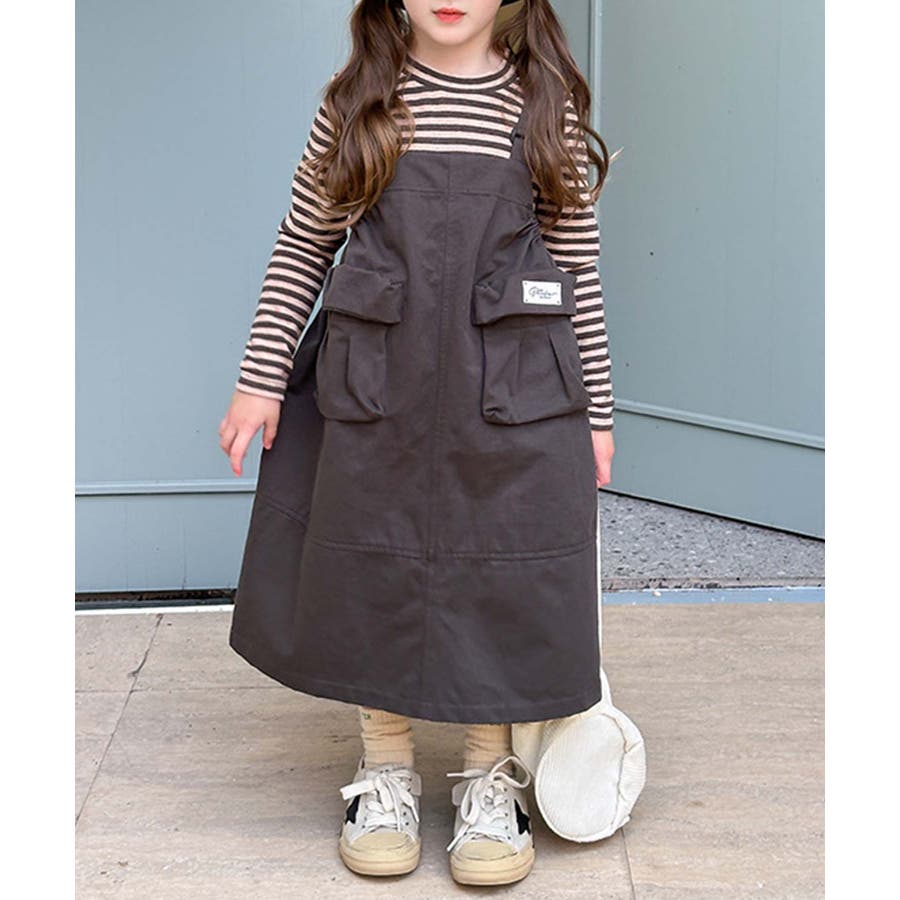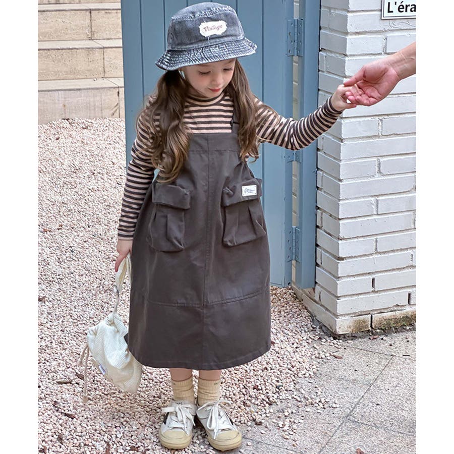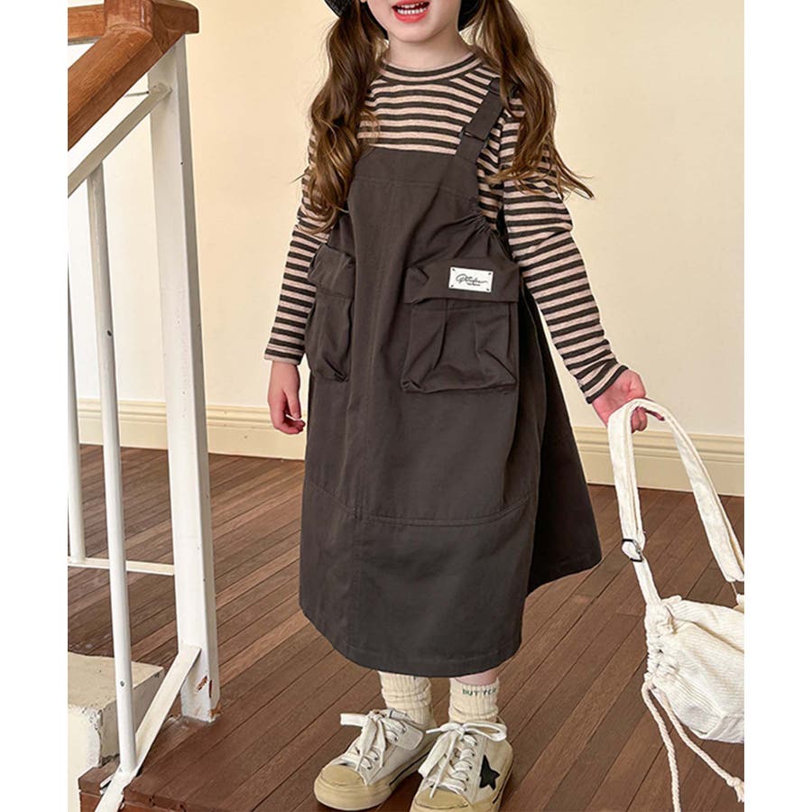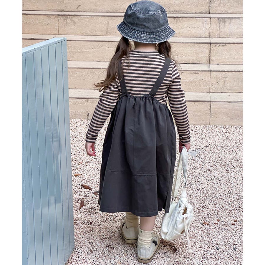 無地のダークカラーを基調としたシンプルなジャンパースカートで、ヴィンテージ感のある大人っぽい印象を与えます。大きなポケットがデザインのアクセントとなりながら実用性をプラス。ストラップ部分で調整可能。成長期の子供でも長く着用できます。