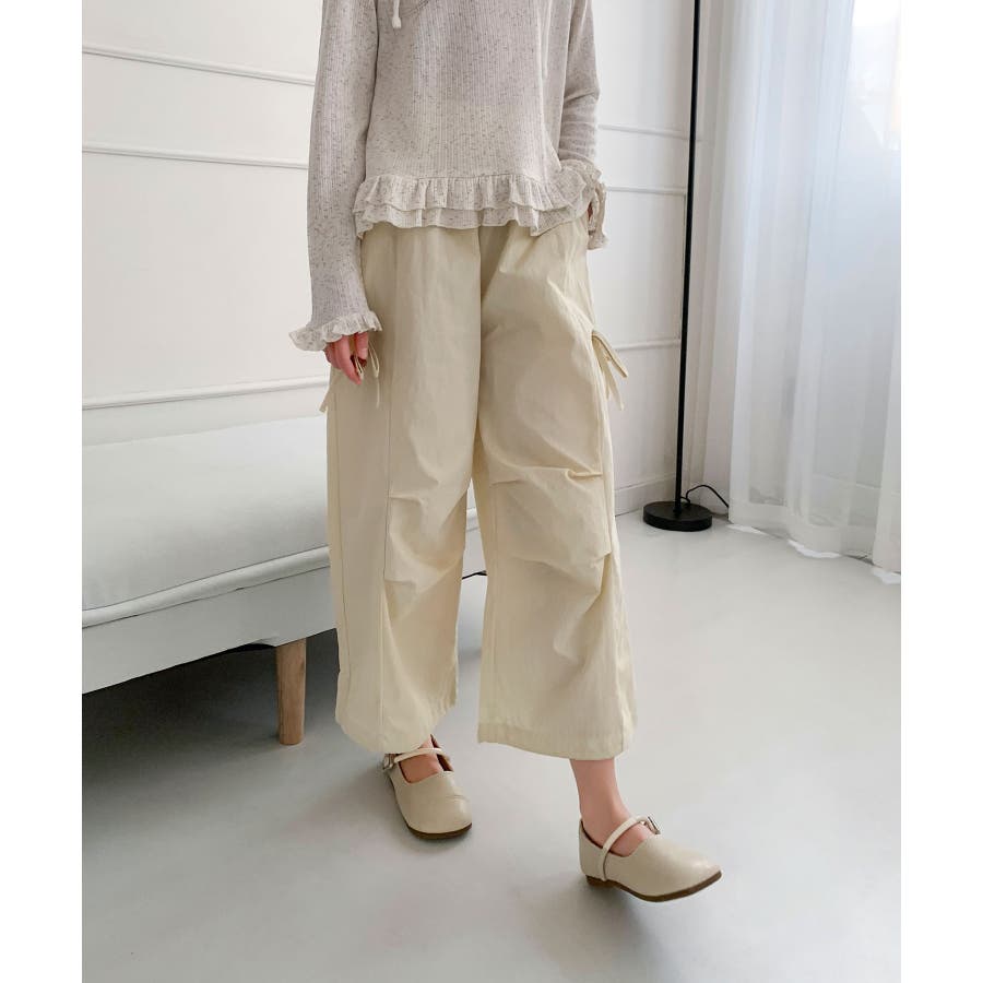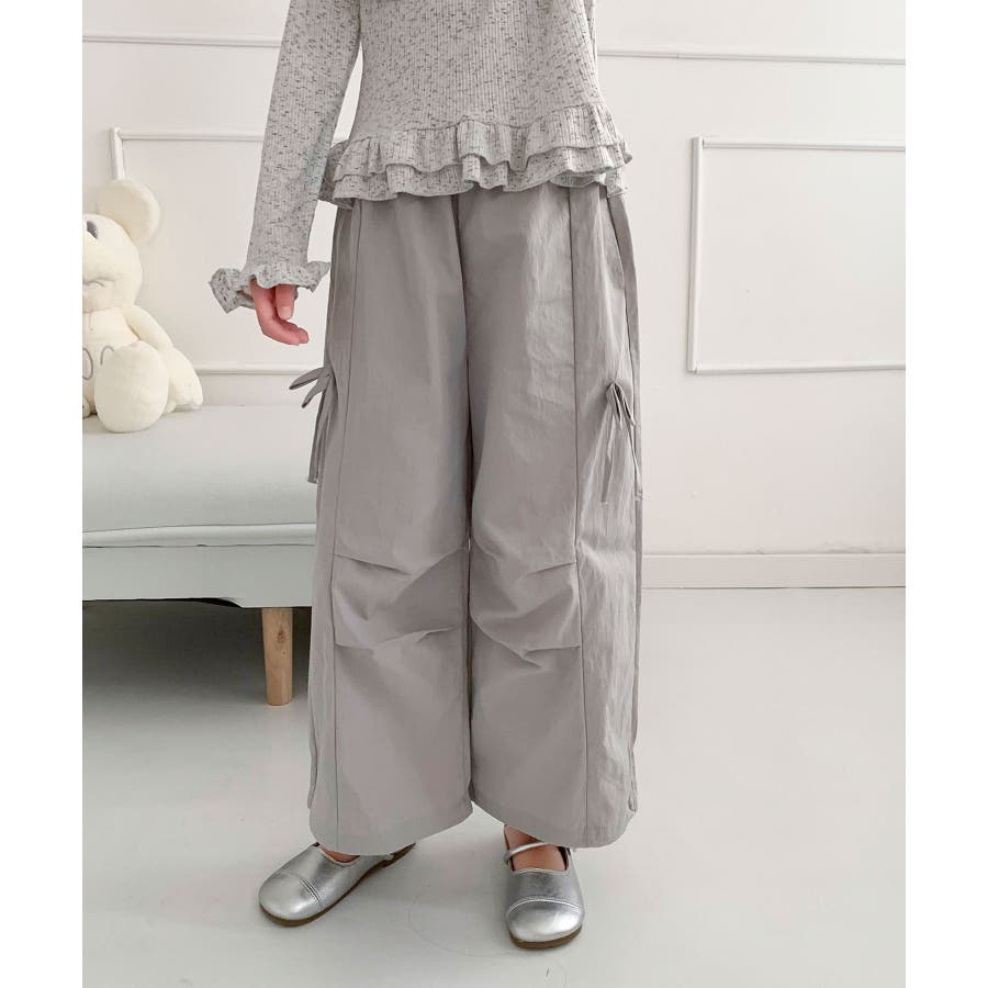 立体感のあるティアード切り替えと、サイドリボンが可愛いワイドパンツ。