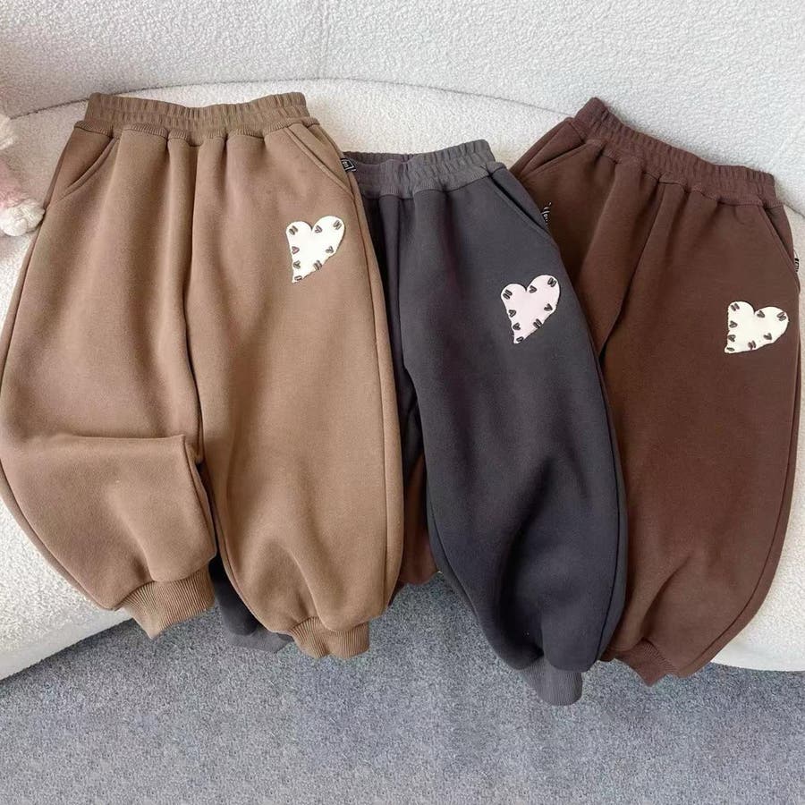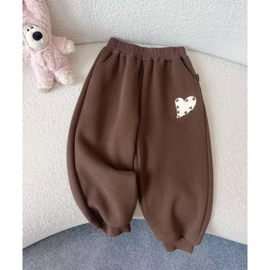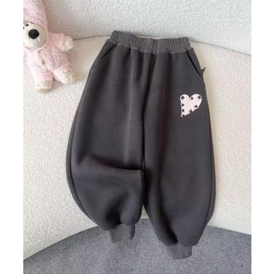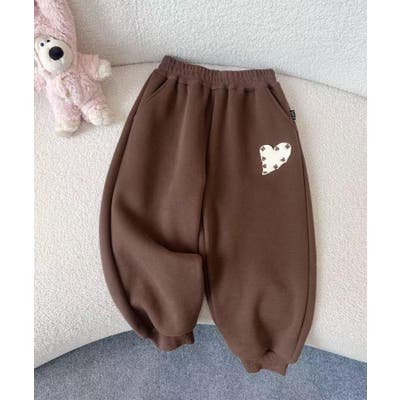 ハート形のパッチワークデザインが可愛いアクセントになったスウェットパンツ。同色のスウェットとセットアップ可能です。裾がリブデザインになっていることにより、綺麗なふくらみのあるシルエットに仕上がります。ウエストはゴム仕様なので、長時間着用できるストレスフリーな履き心地。動きやすいので、通園通学にもおすすめです◎