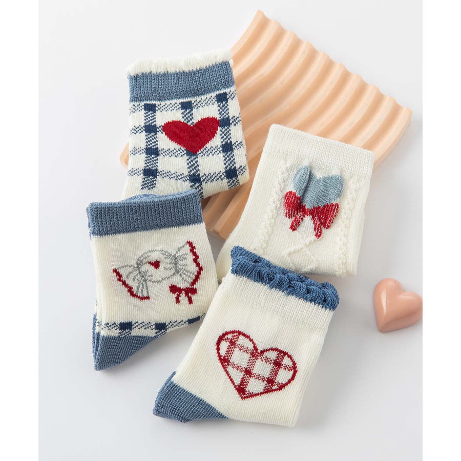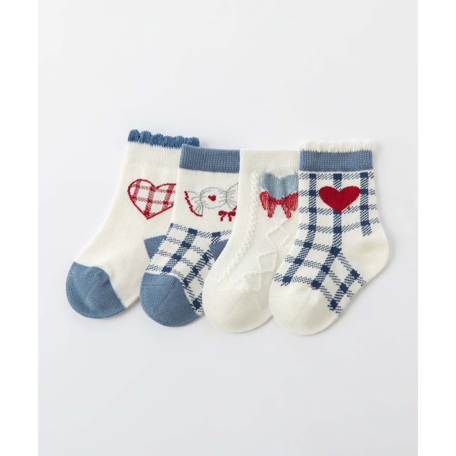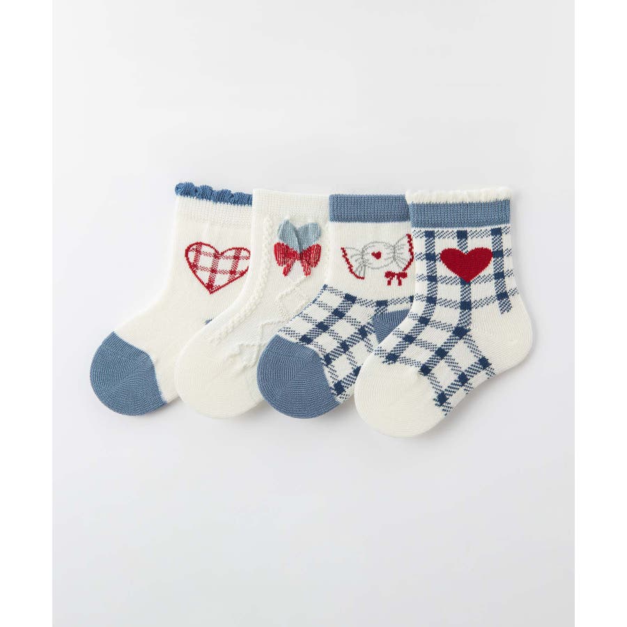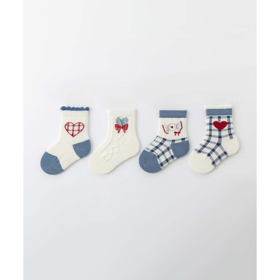 ハートやリボンのデザインがかわいいブルーのキッズソックス4足セット。Sサイズは0-6ヶ月に適しています。Mサイズは6-12ヶ月に適しています。Lサイズは1-3歳に適しています。XLサイズは3~5歳用に適しています。