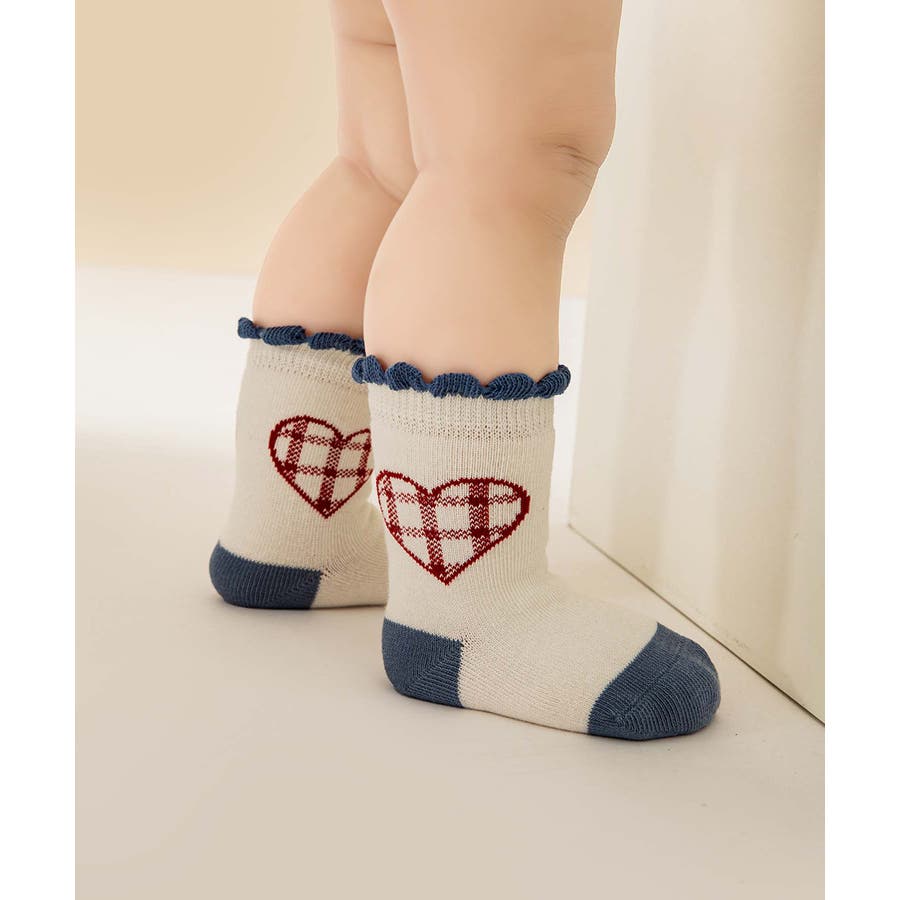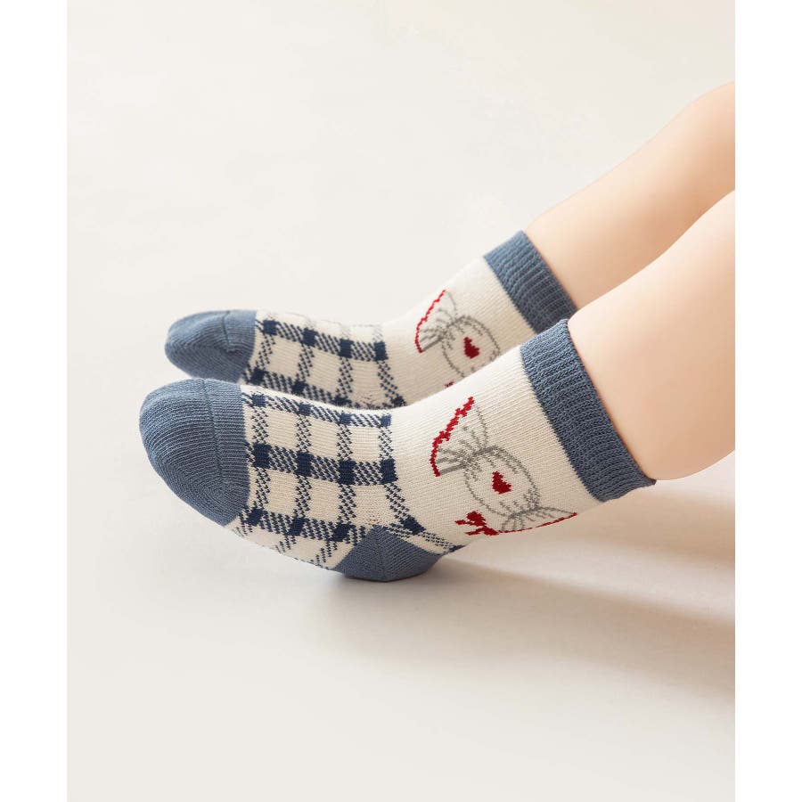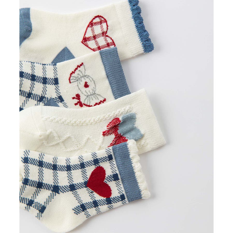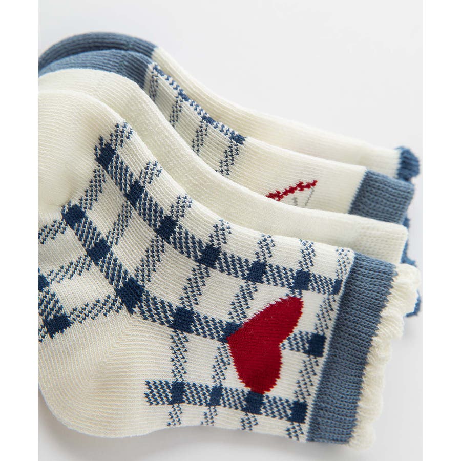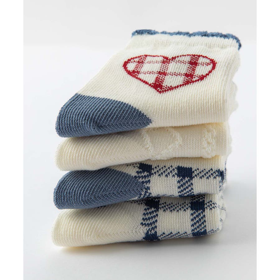 ハートやリボンのデザインがかわいいブルーのキッズソックス4足セット。Sサイズは0-6ヶ月に適しています。Mサイズは6-12ヶ月に適しています。Lサイズは1-3歳に適しています。XLサイズは3~5歳用に適しています。