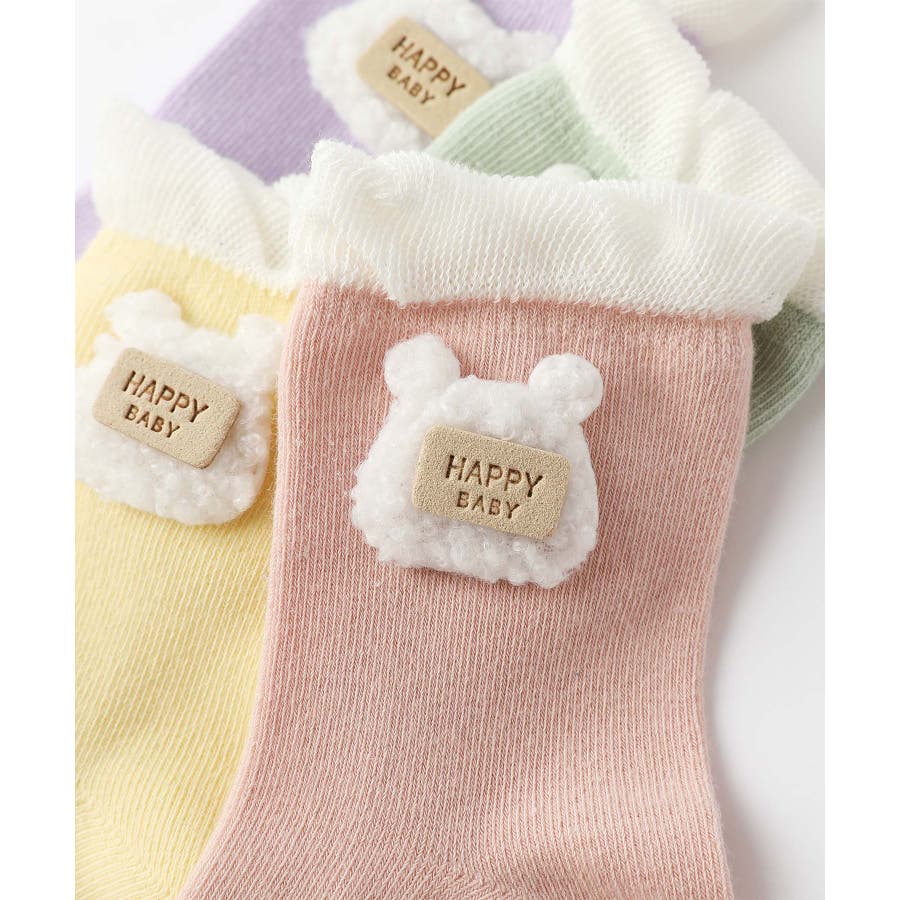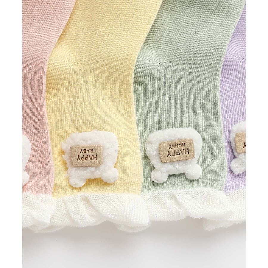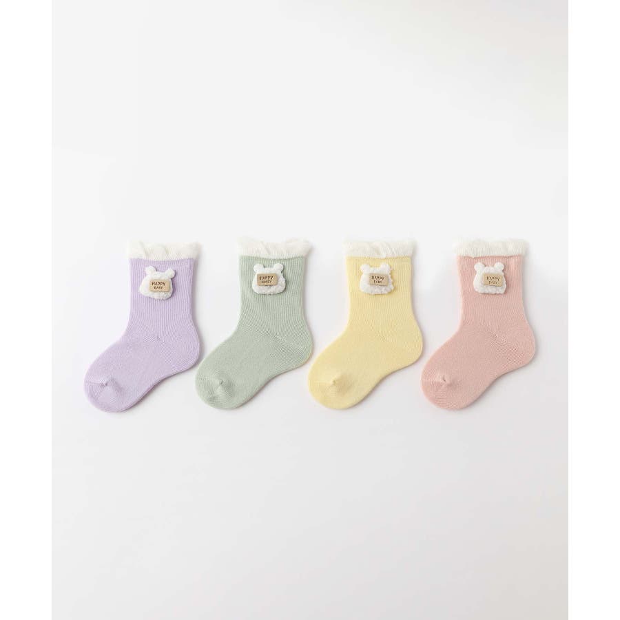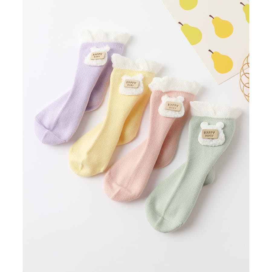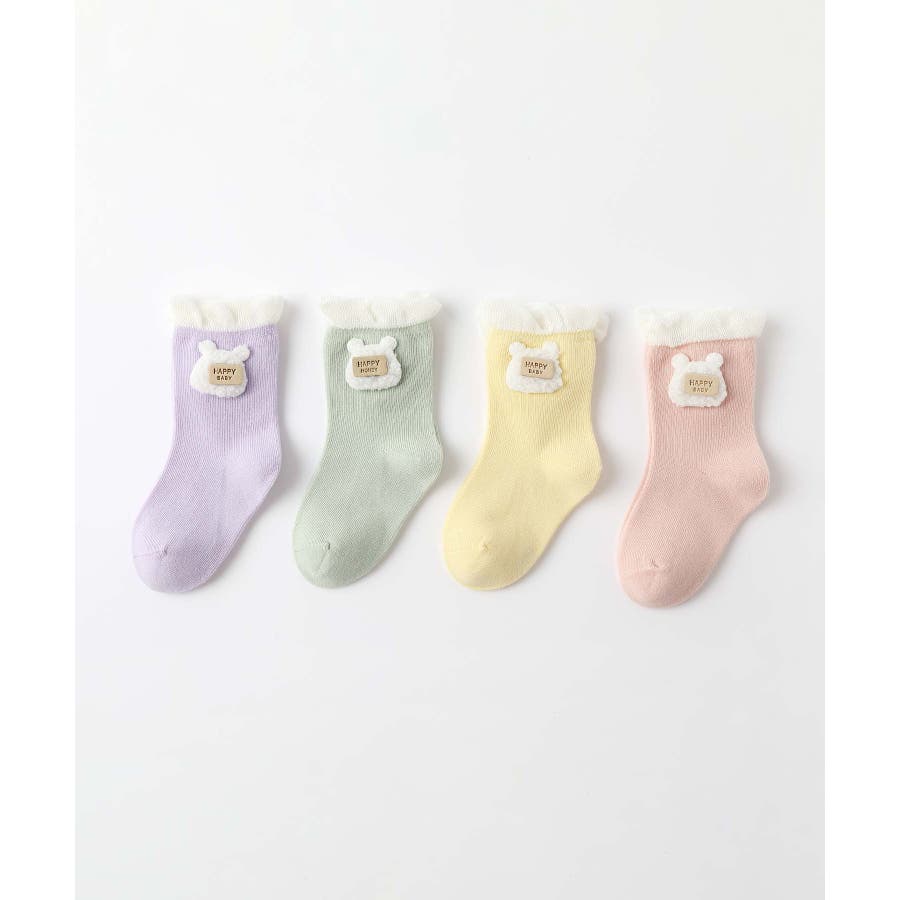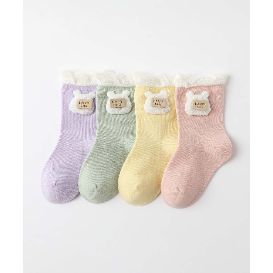 くまさんのデザインがかわいいキッズソックス4足セット。英字「HAPPY HONEY」。Sサイズ0-6ヶ月、Mサイズ6-12ヶ月、Lサイズ1-3歳、 XLサイズは3?5歳向けです。