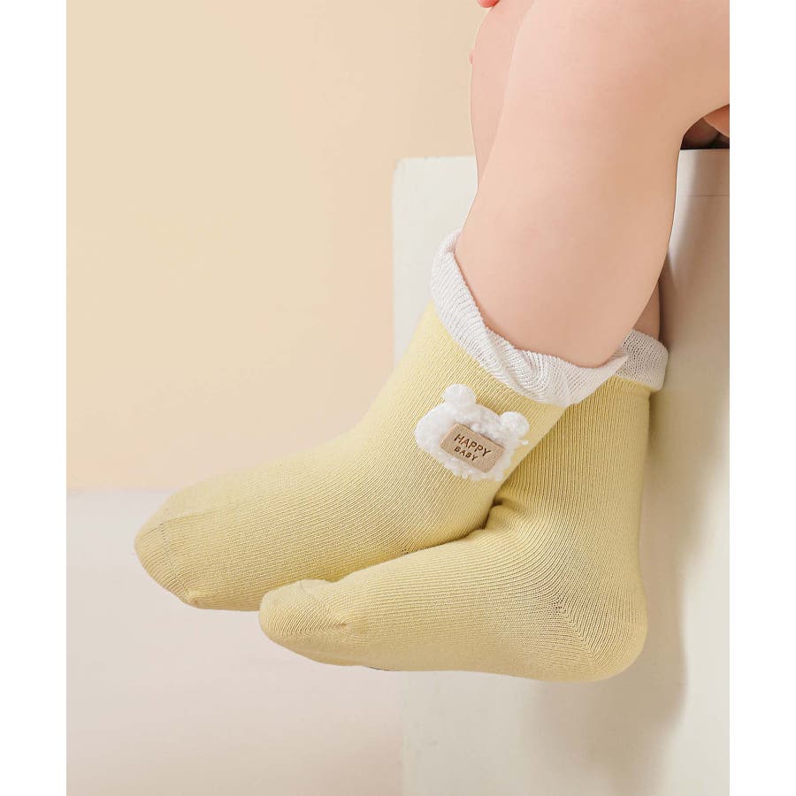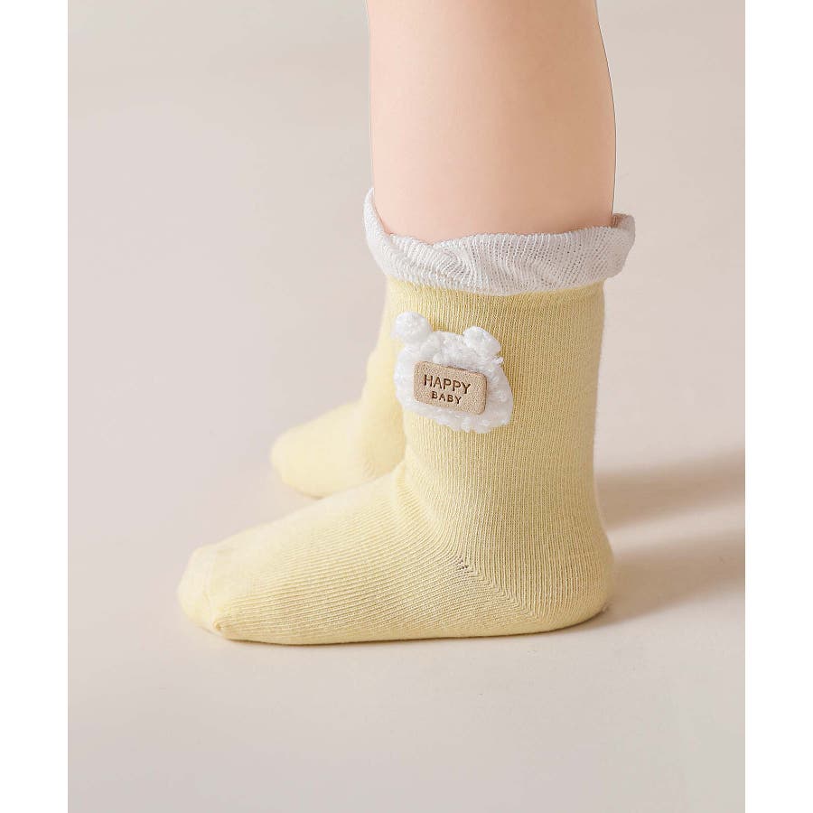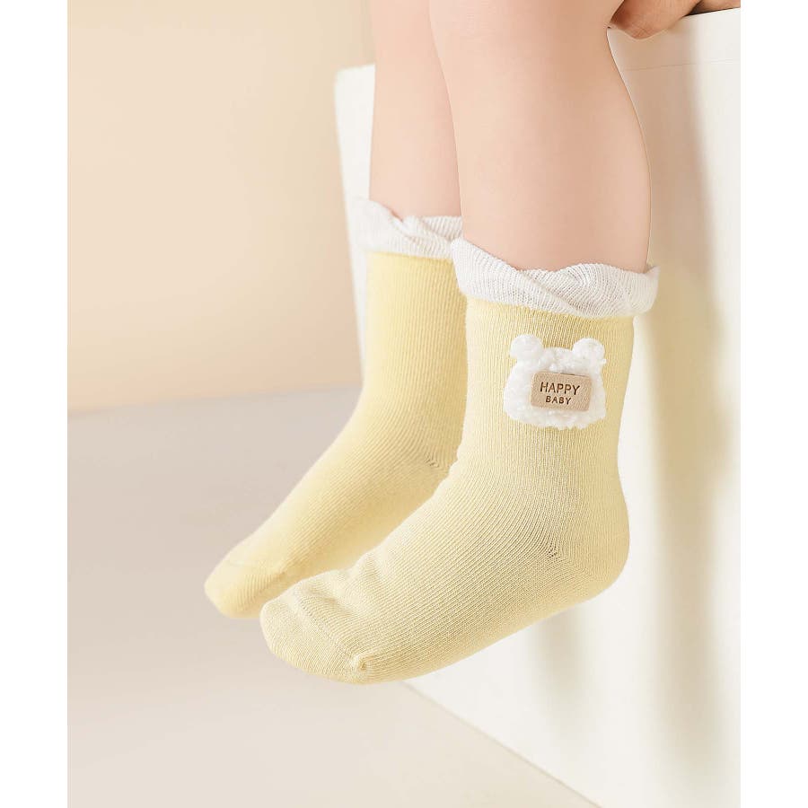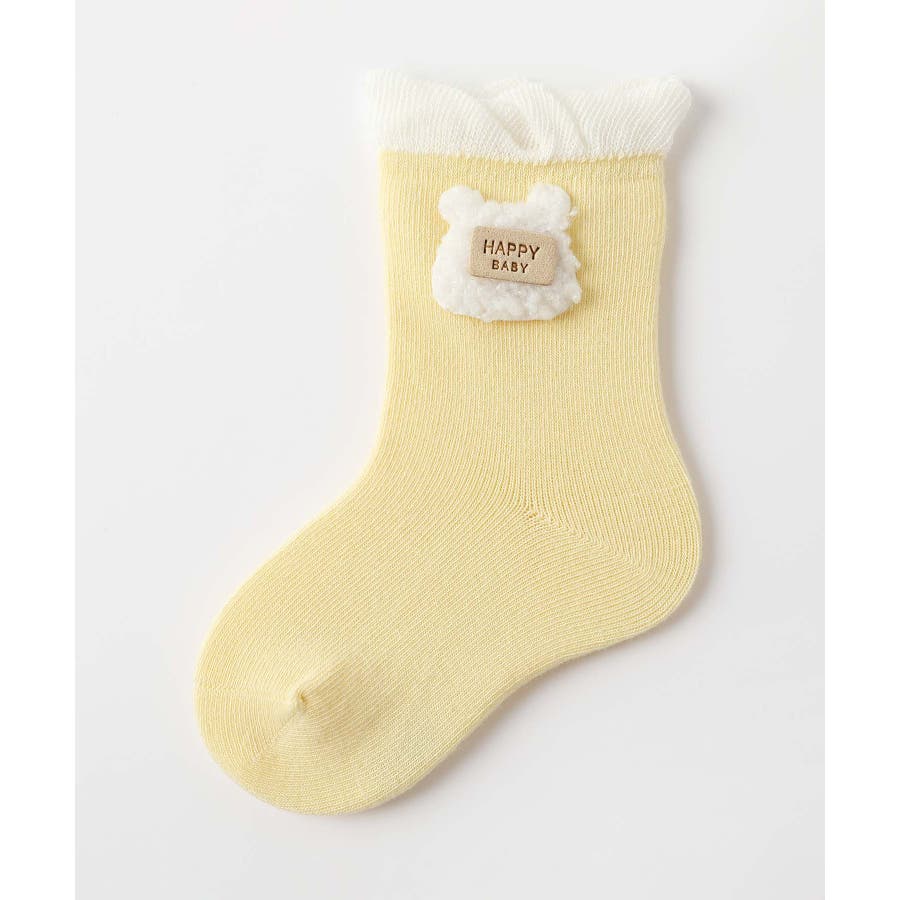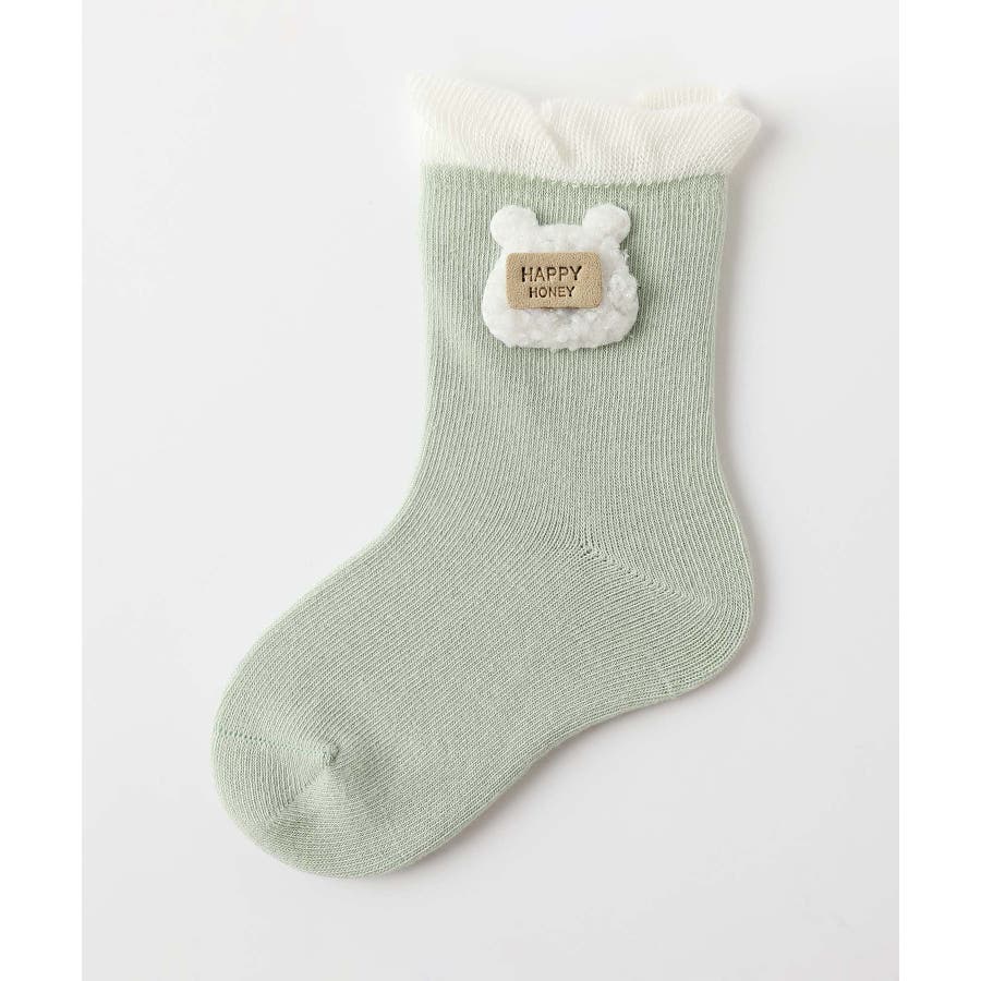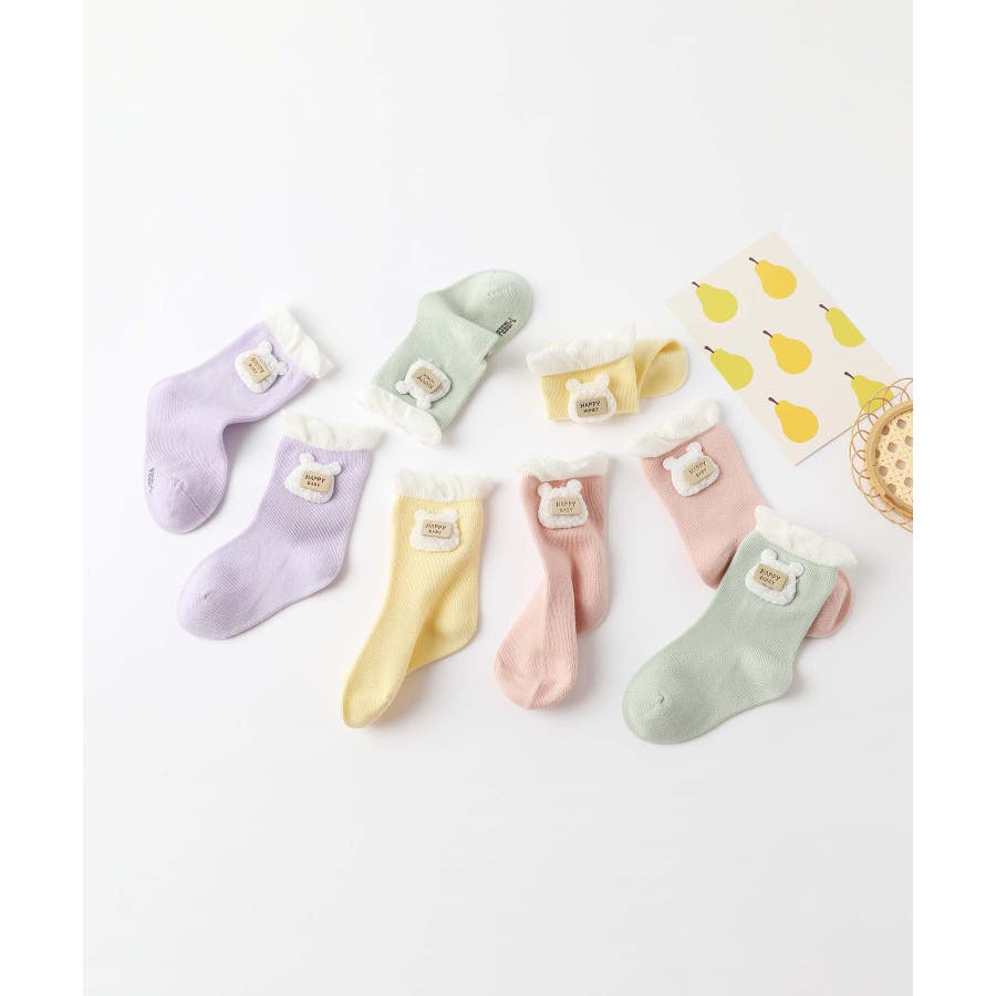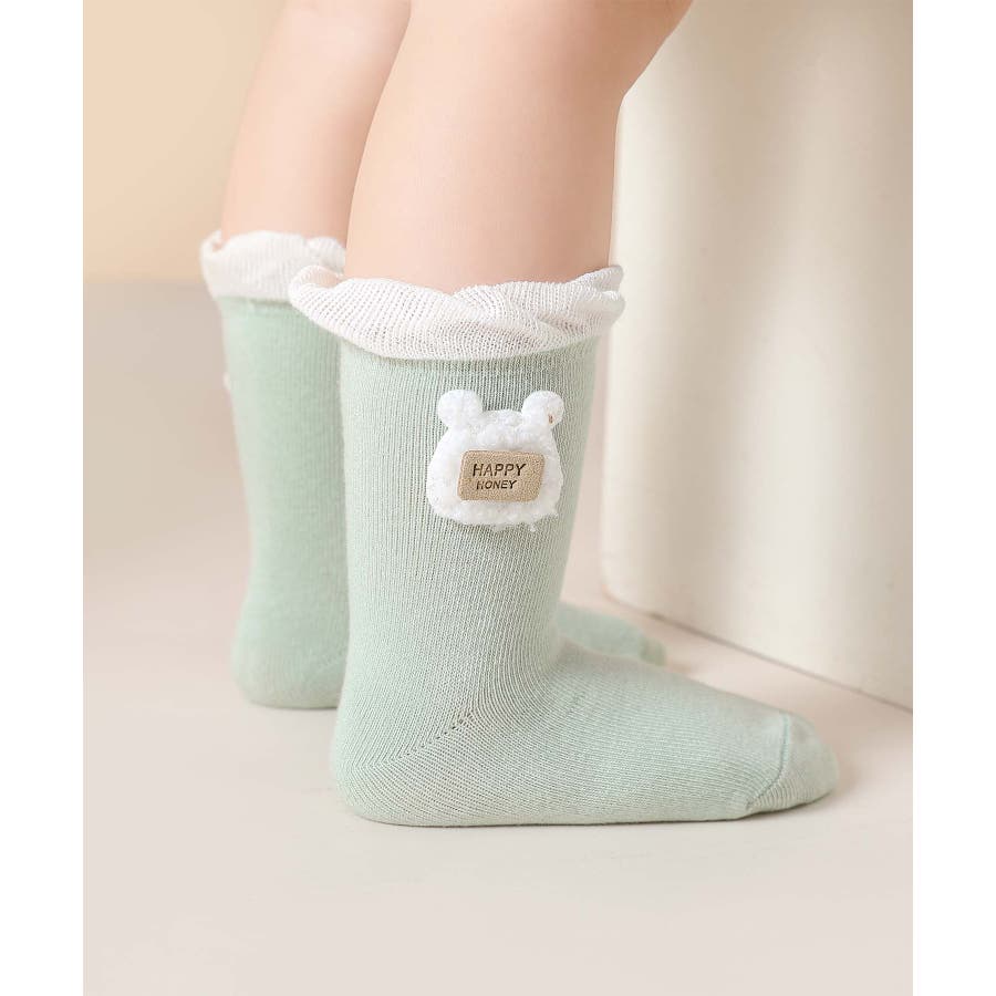 くまさんのデザインがかわいいキッズソックス4足セット。英字「HAPPY HONEY」。Sサイズ0-6ヶ月、Mサイズ6-12ヶ月、Lサイズ1-3歳、 XLサイズは3?5歳向けです。