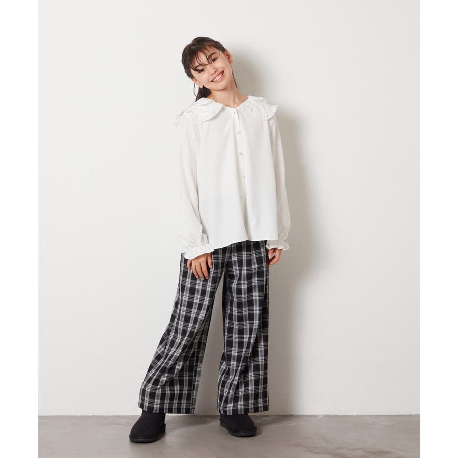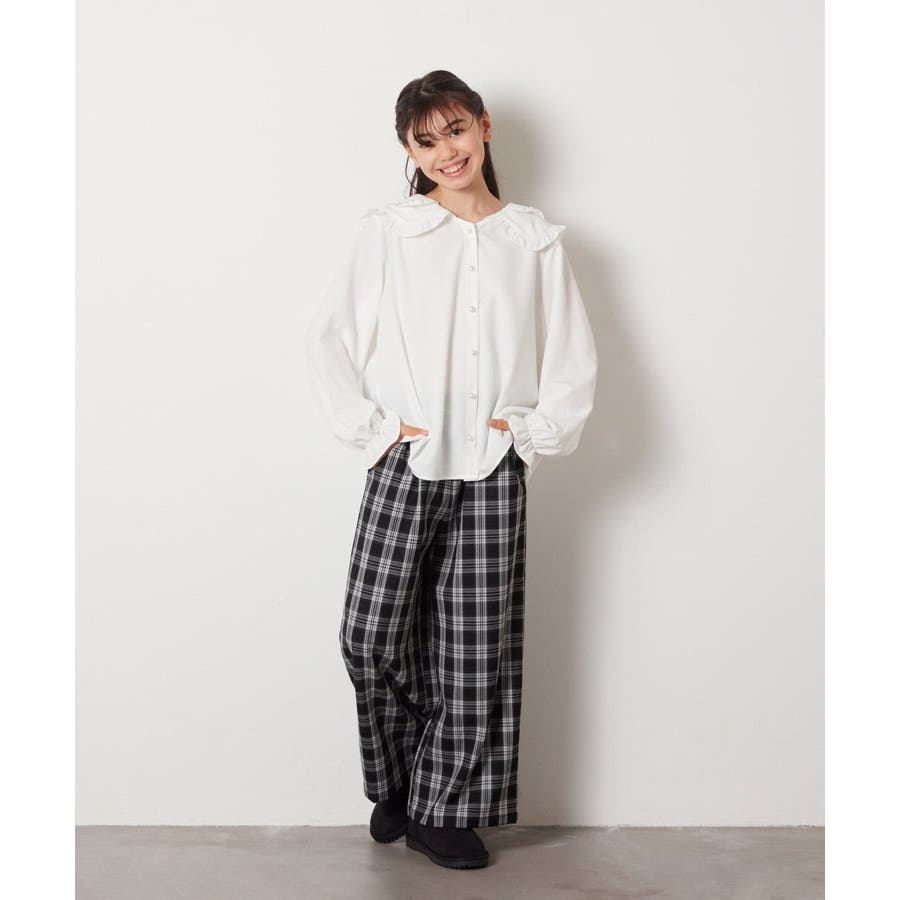 ・大きなフリル衿を活かしてガーリーコーデで可愛さ引き立つコーデ。