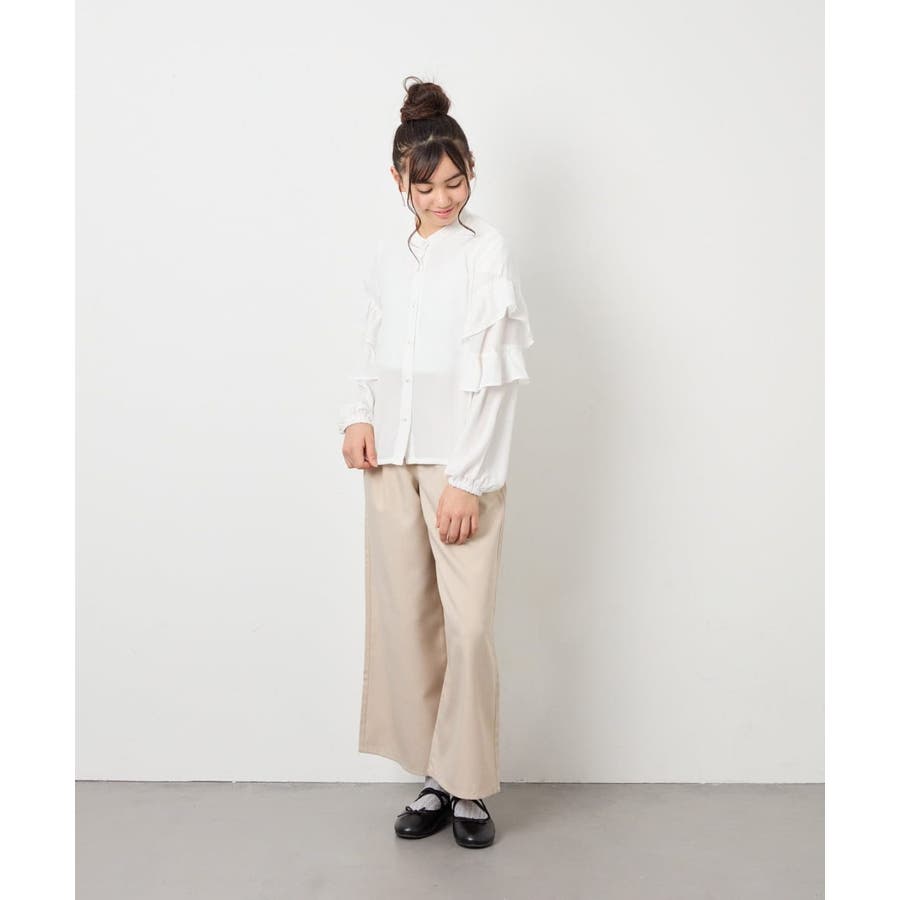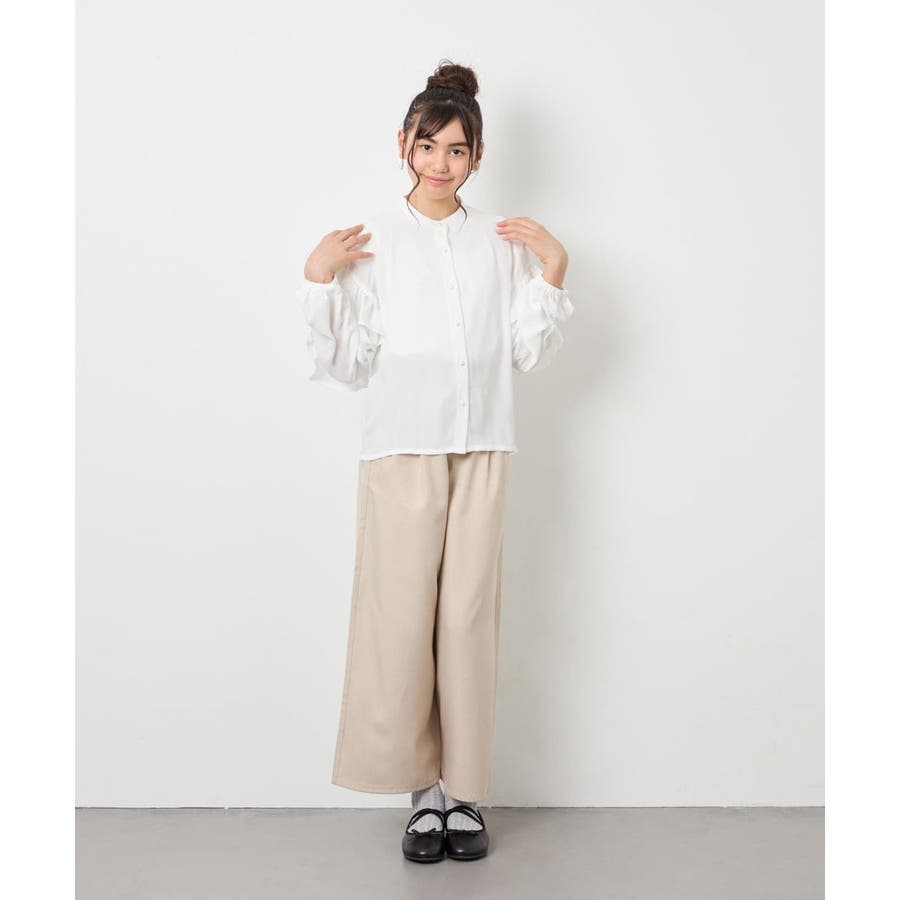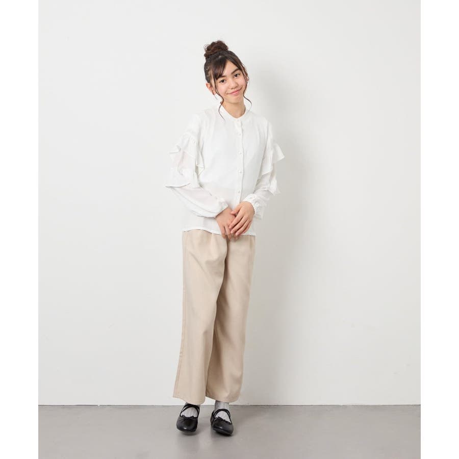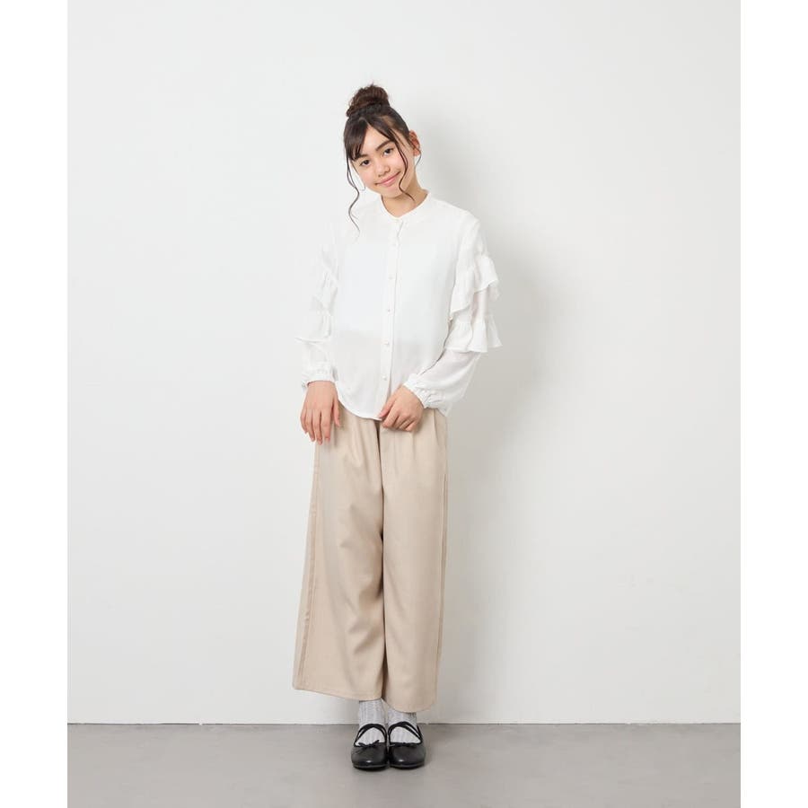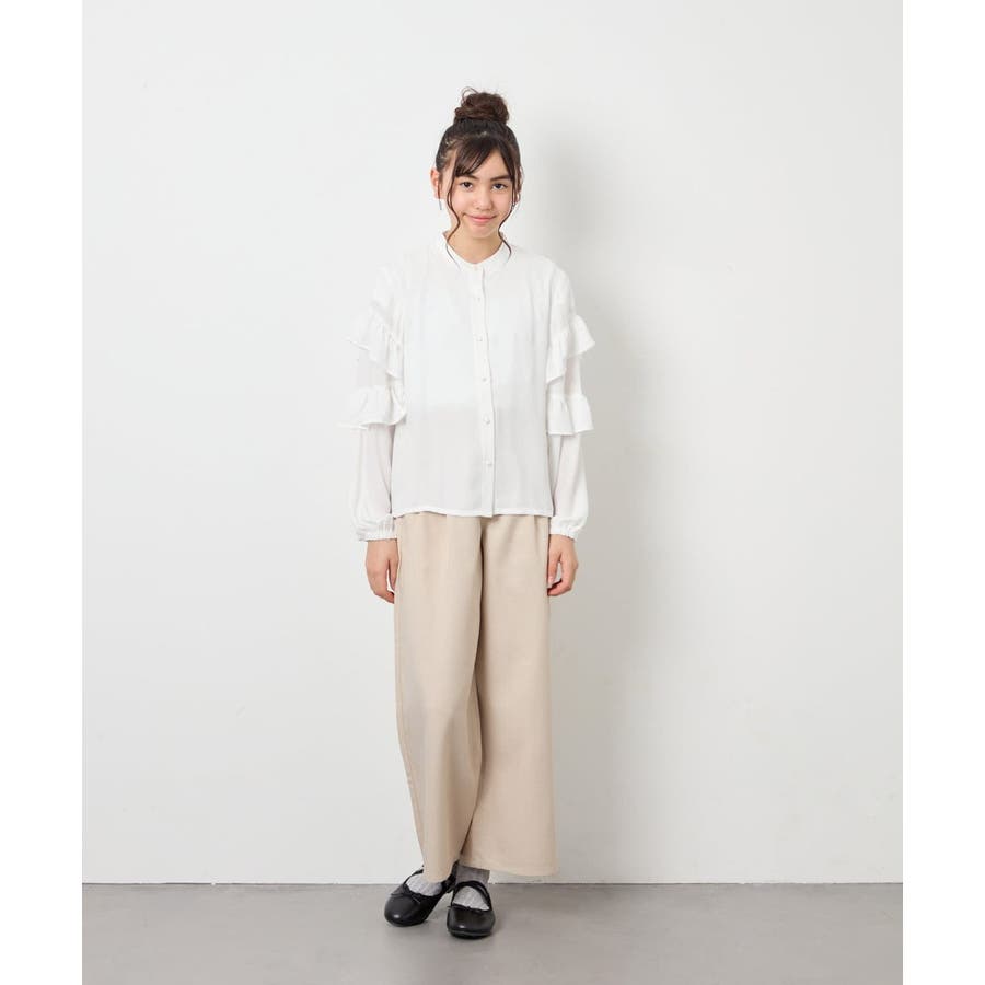 ・ワイドパンツと合わせると、フリルとのバランスが取れた抜け感のあるコーデに。