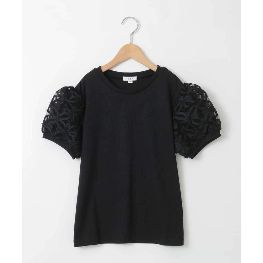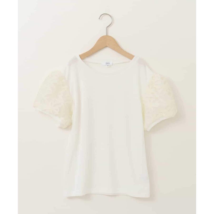 ・身頃はよく伸びるテレコ素材を使用し、ふんわりとした袖にはテープ刺繍がポイントのシアースリーブカットソー。