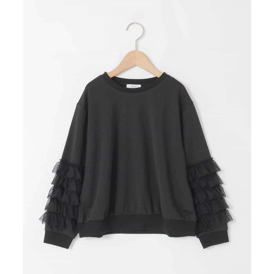 ・袖にチュールフリルがたっぷりデザインされた華やかなプルオーバートップス。
