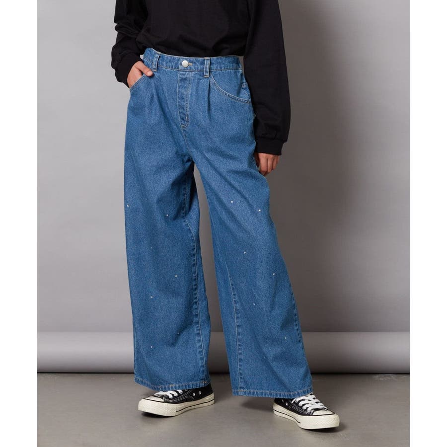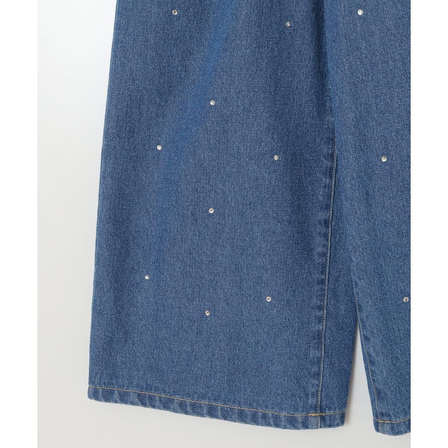 ・フロントにビジューがランダムに散りばめたデニムパンツ。