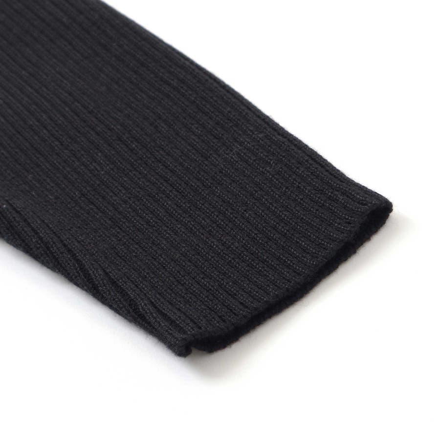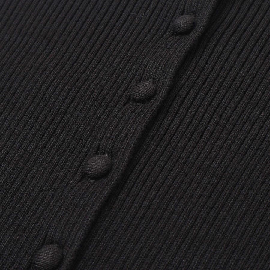 同色のニットのくるみボタンや裾についたネームがさりげないデザインポイント。