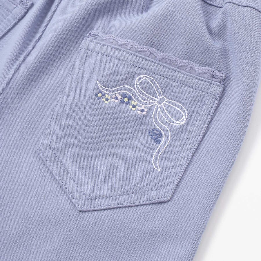 後ろポケットのリボンとお花を組み合わせた刺しゅうが女の子らしいデザイン。