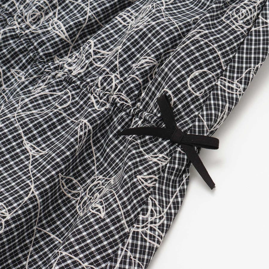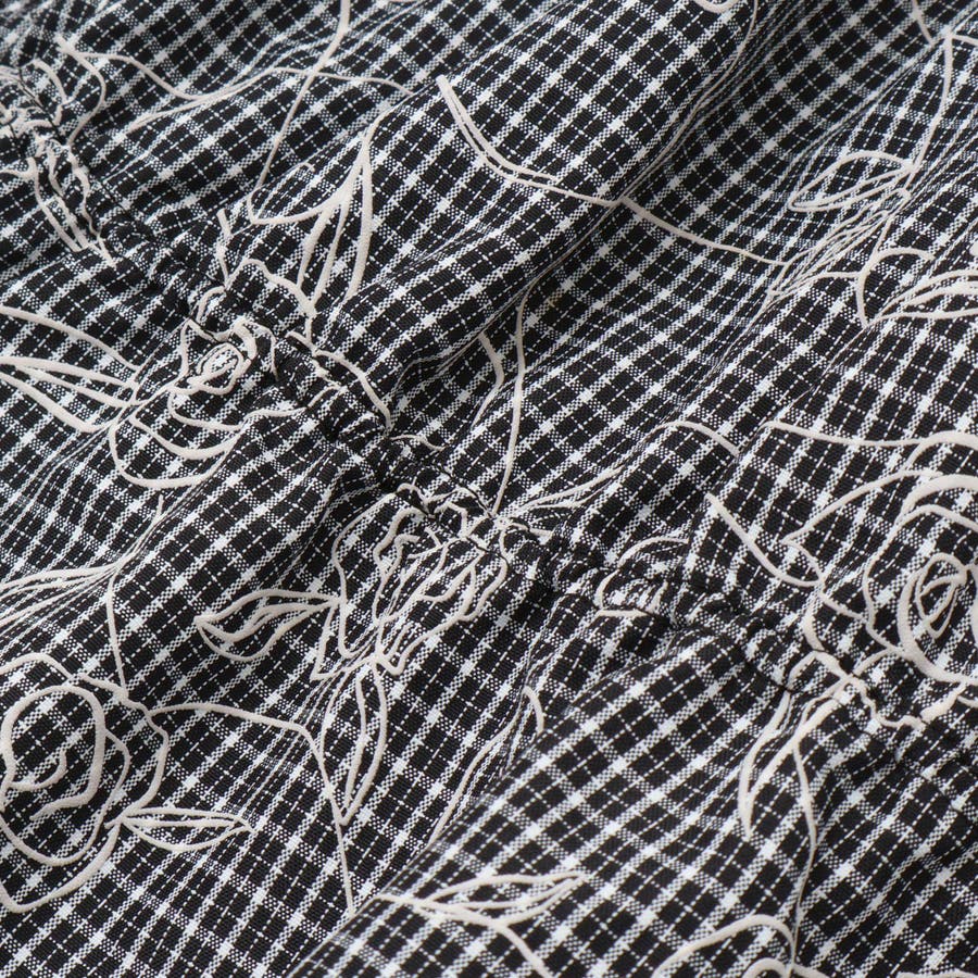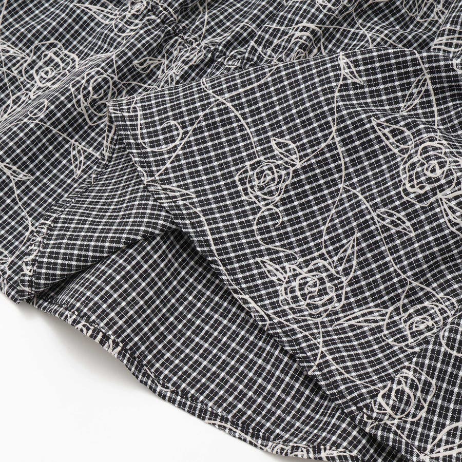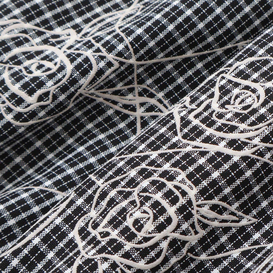 モノトーンの先染めチェックの生地の上にオリジナルのローズ柄をプリントしています。