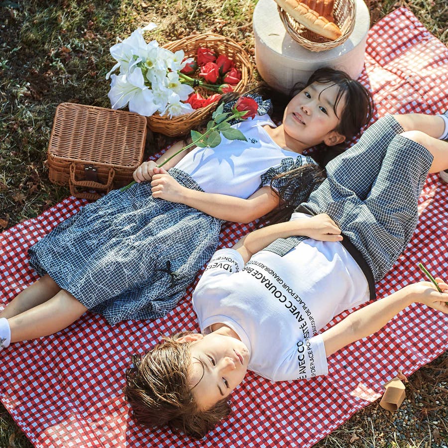 男の子ではプリントなしのチェックの生地でTシャツ(1110-72552)とハーフパンツ(1115-72580)を展開。男女でのリンクも可能です。