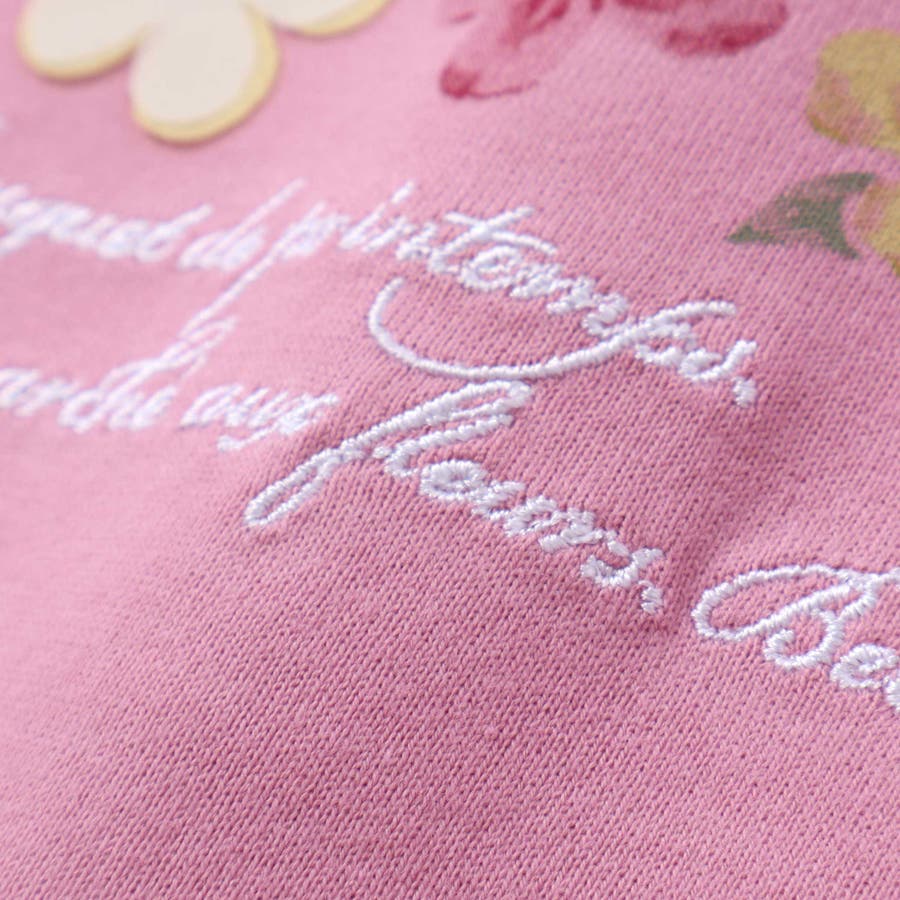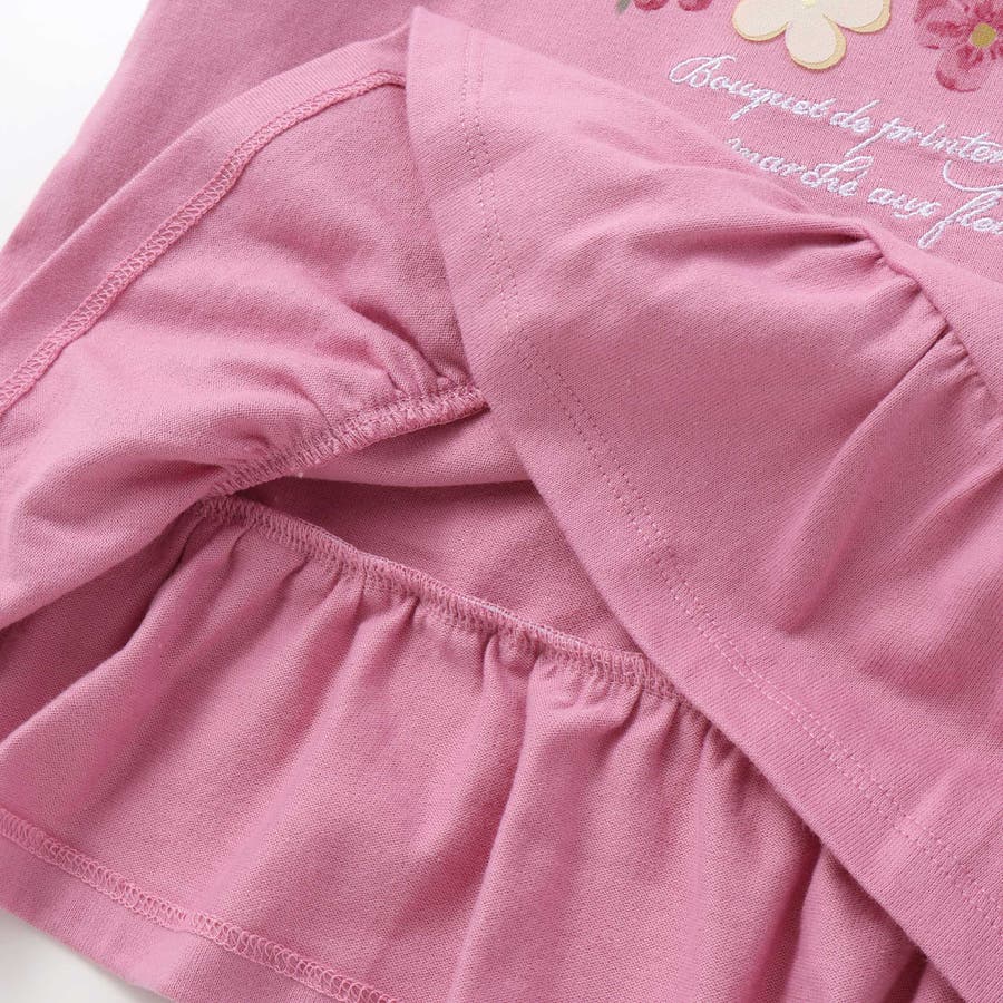 お花の水彩プリントと裾のフリルが華やかな長袖Tシャツ。