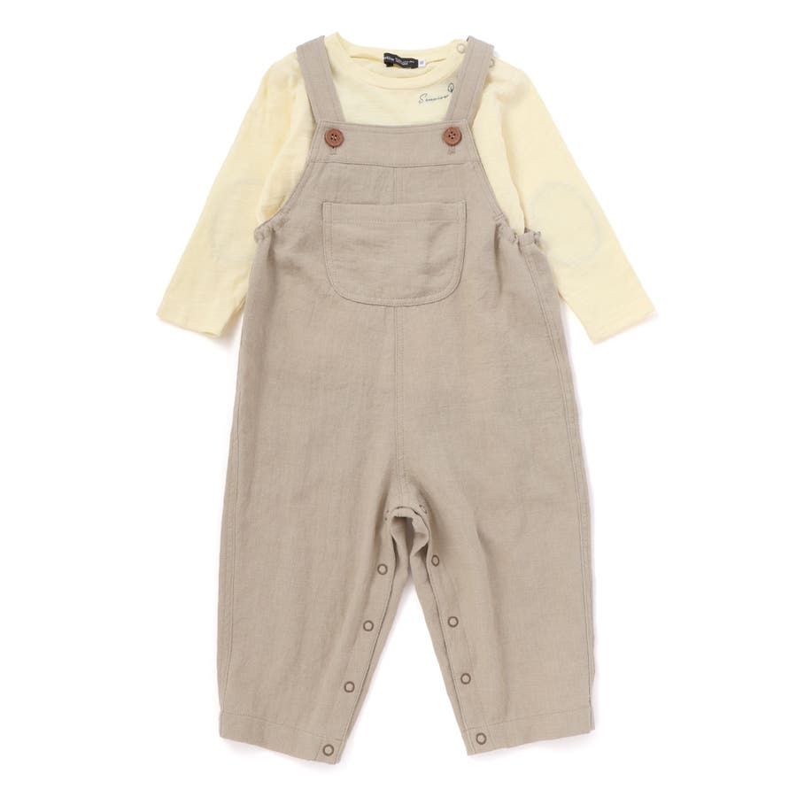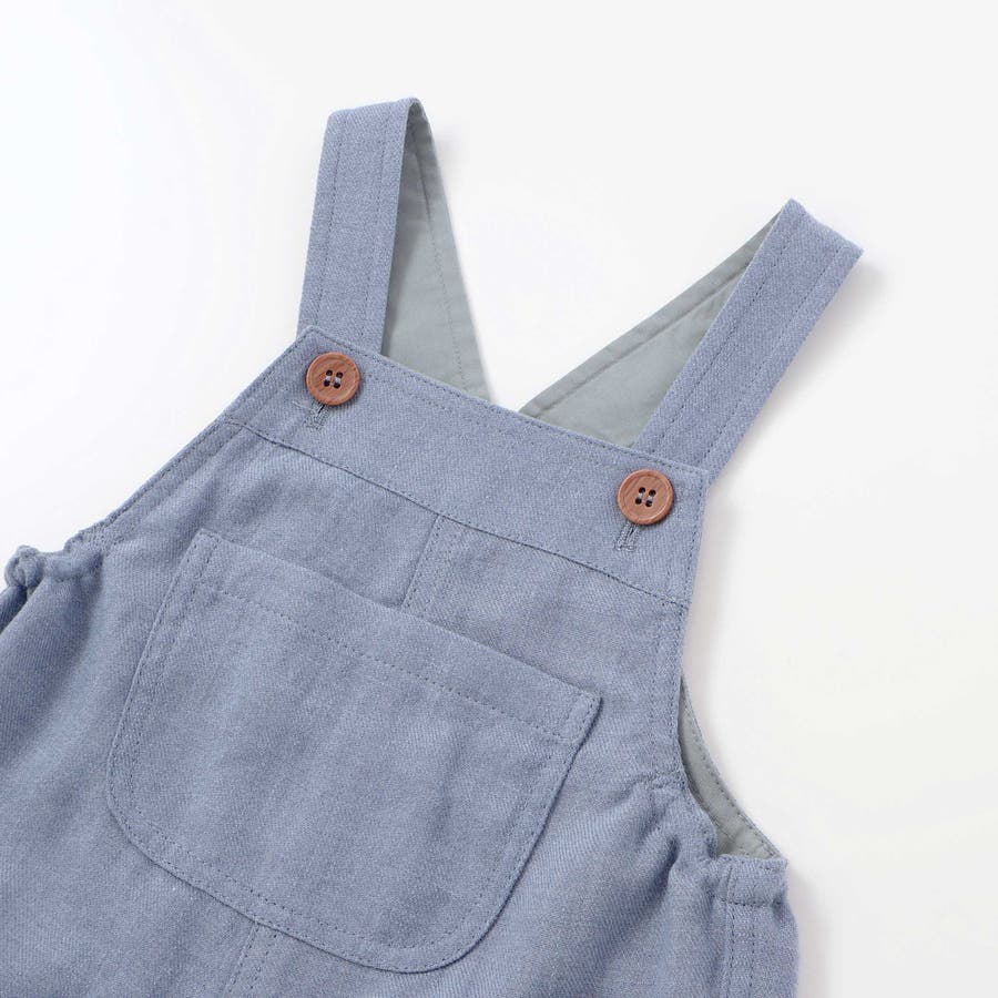 スラブガーゼ素材の落ち着いた発色のオーバーオールはナチュラルかわいいアイテム。