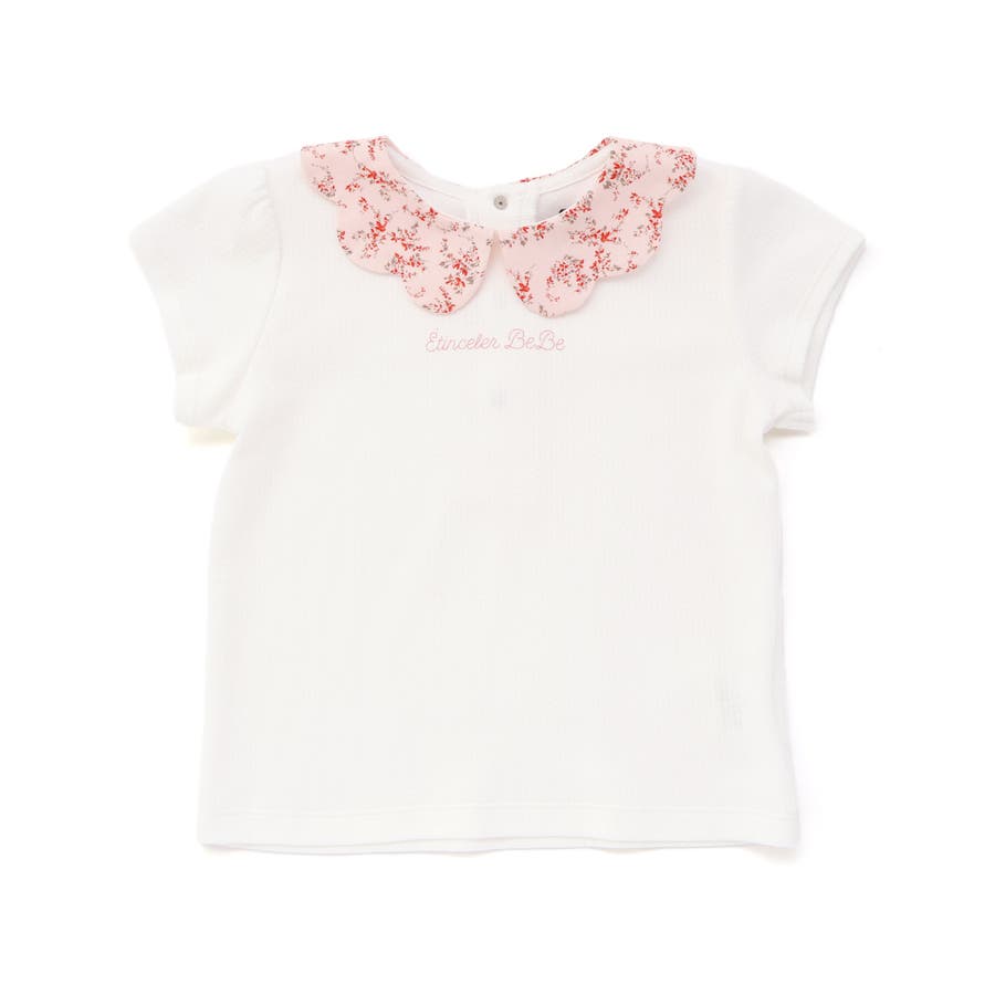 落ち着いたニュアンスカラーの小花柄の襟がポイントになった半袖Tシャツ。