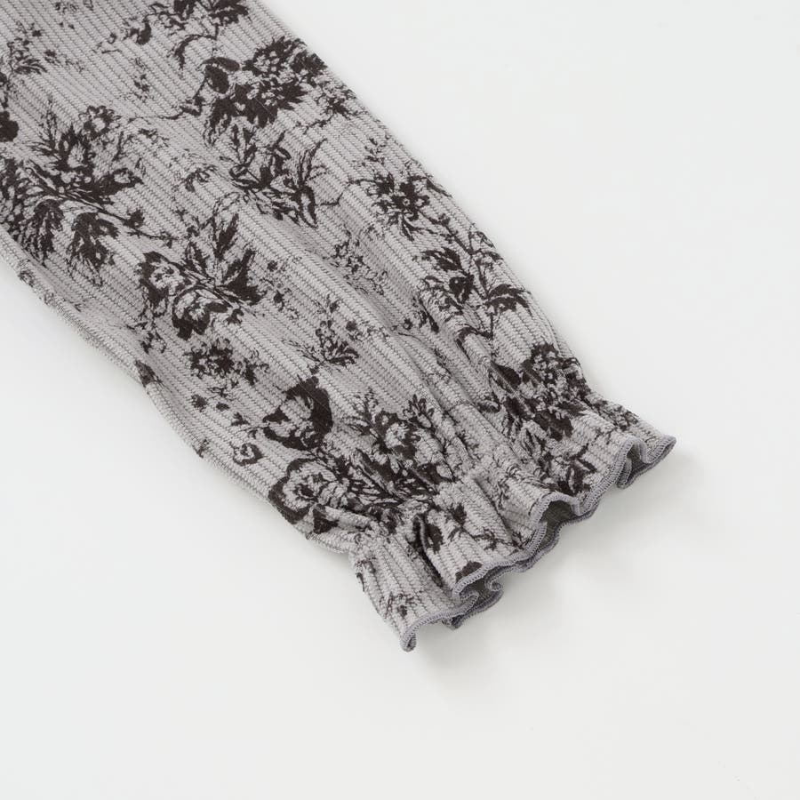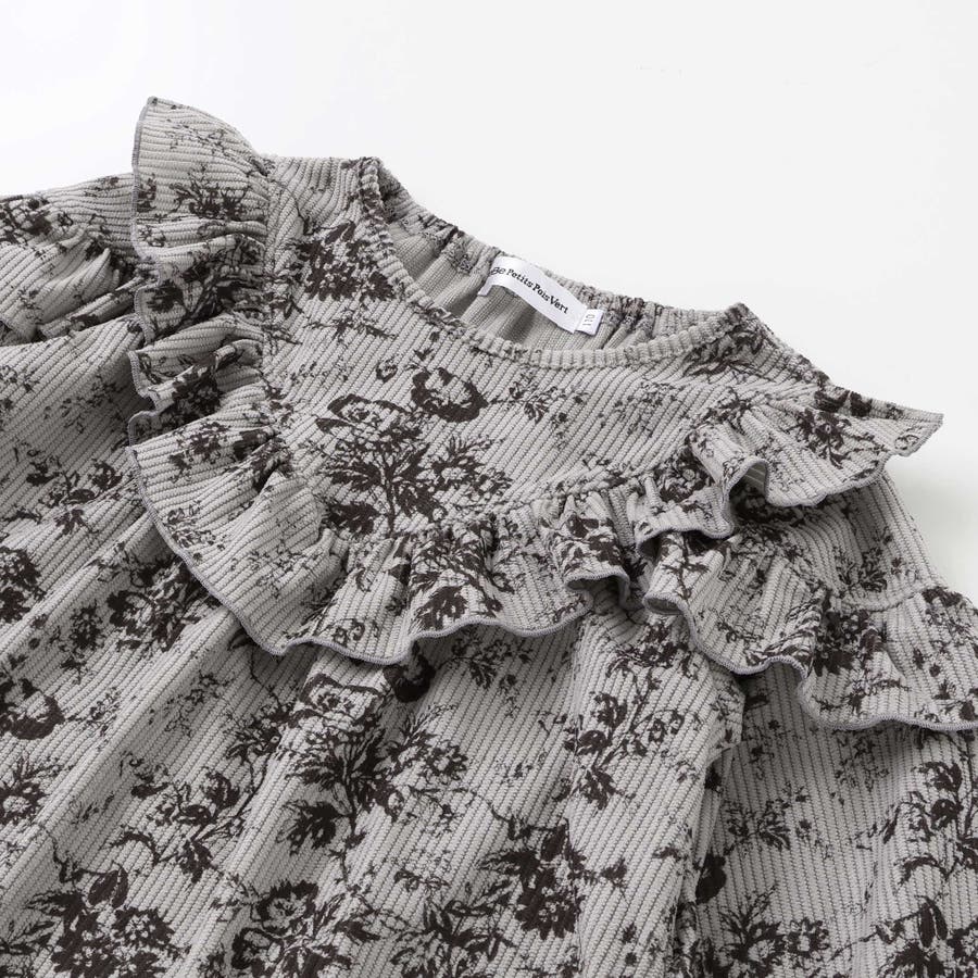 胸元のフリル下にはギャザーを寄せて、ふんわりとした動きのあるシルエットに。