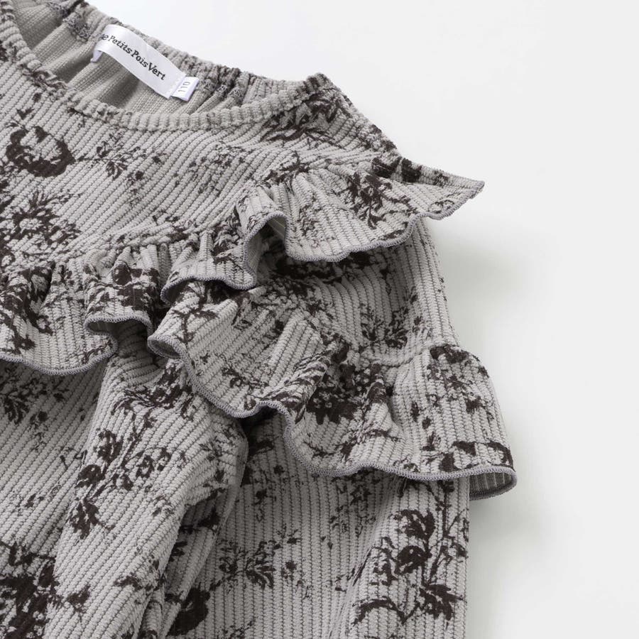 前ヨークと袖ぐりにフリルをあしらった、女の子らしい華やかなデザイン。