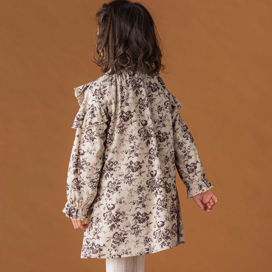 秋のお出かけにぴったりな、花柄コールテンのフリル付き長袖ワンピース
