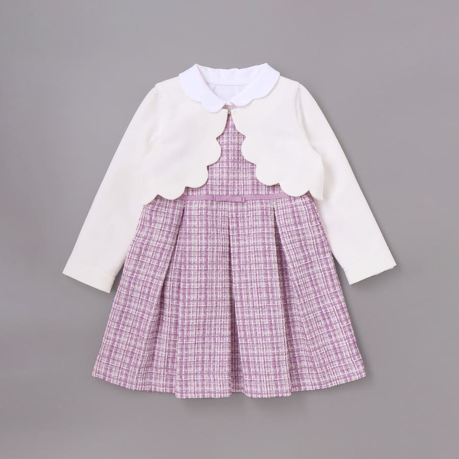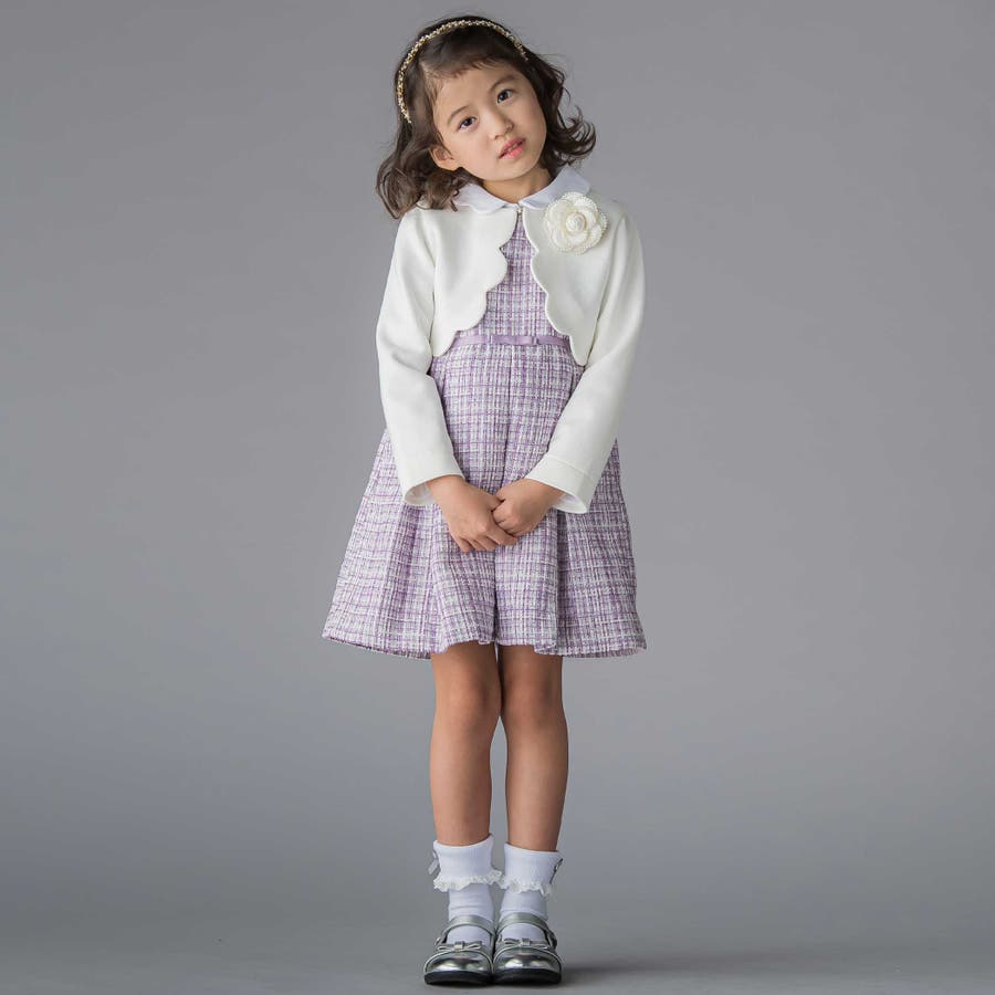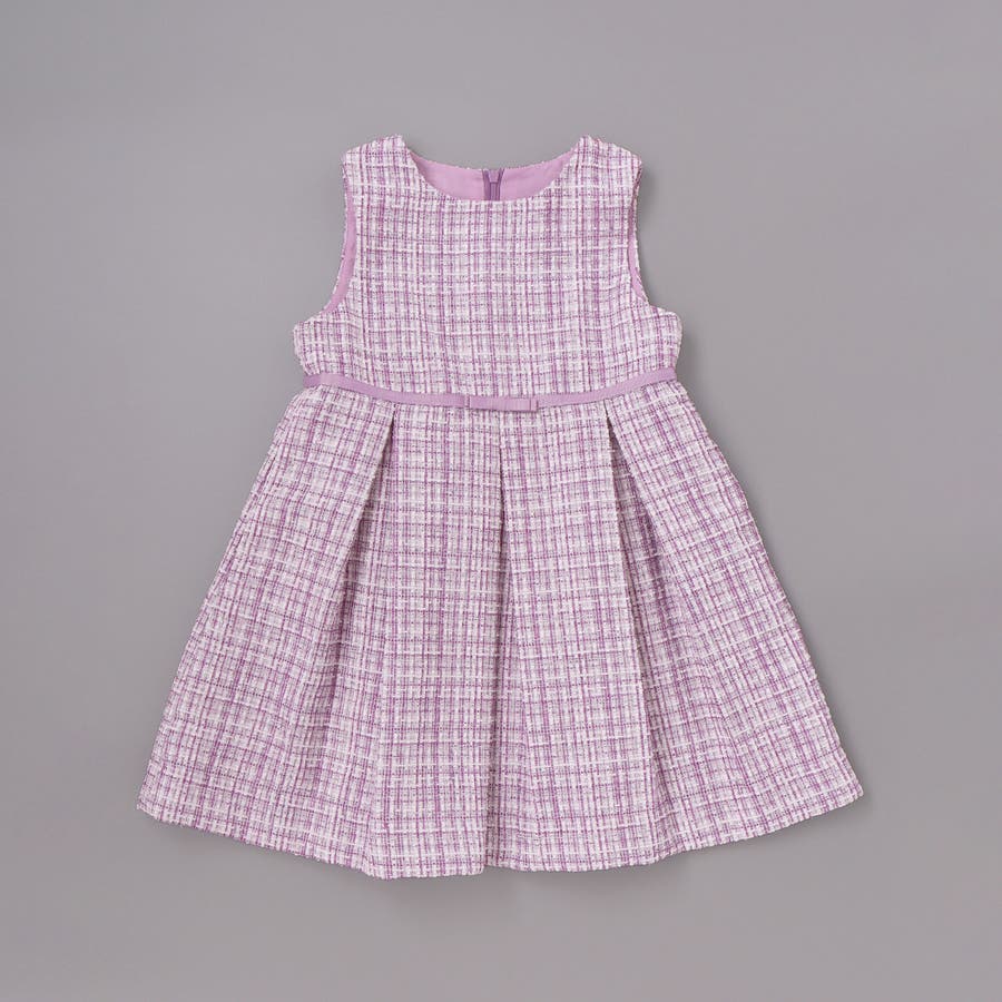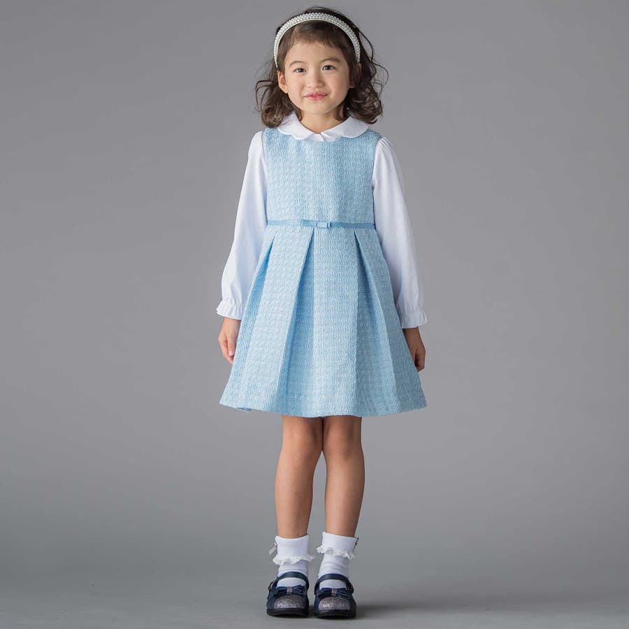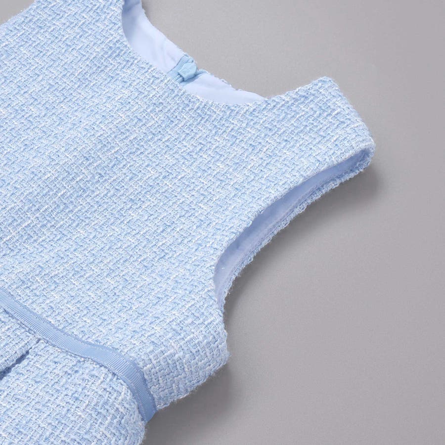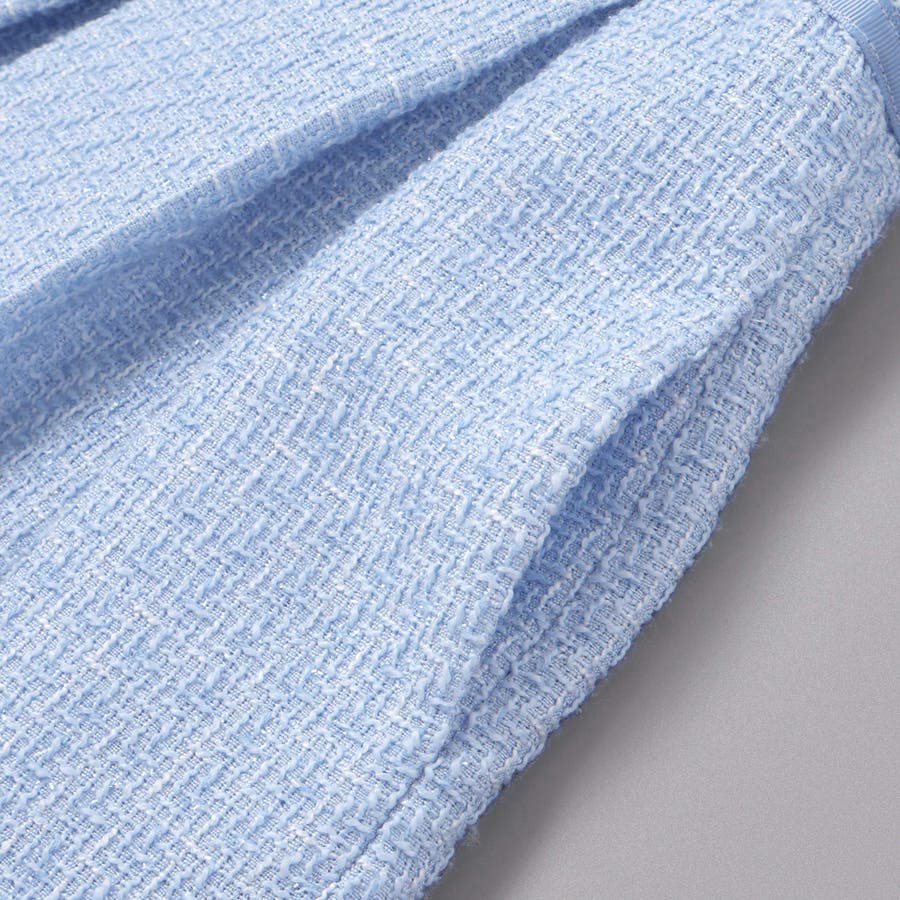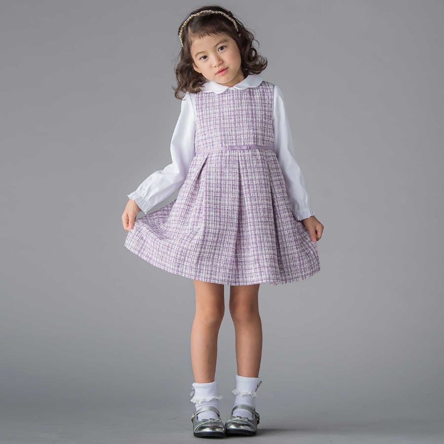 ジャンパースカートにはラメツイード生地を採用。Tシャツやシンプルなニットと合わせれば、普段のお出かけ着としても活躍します。
