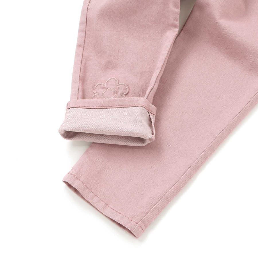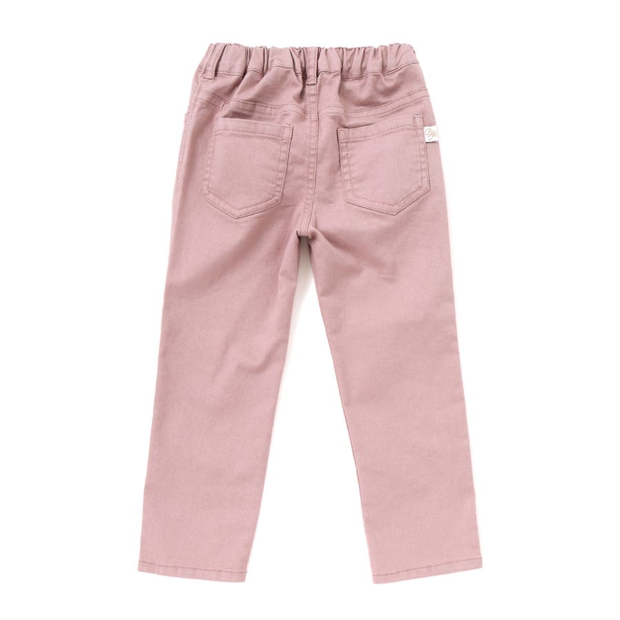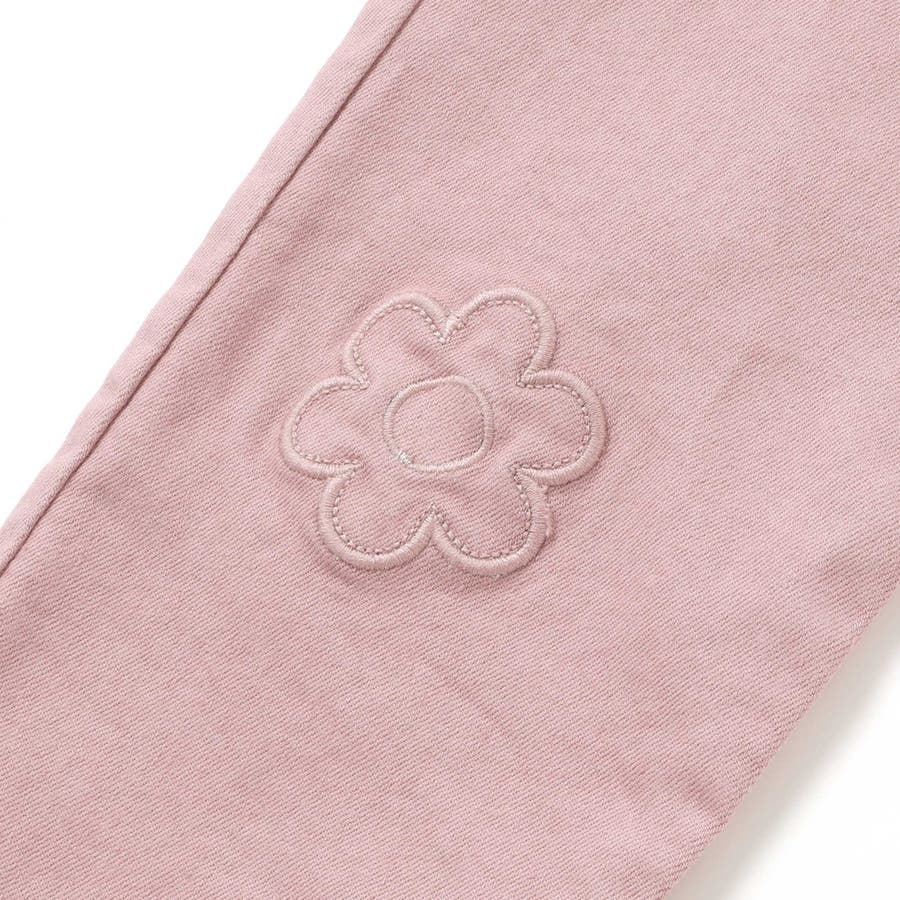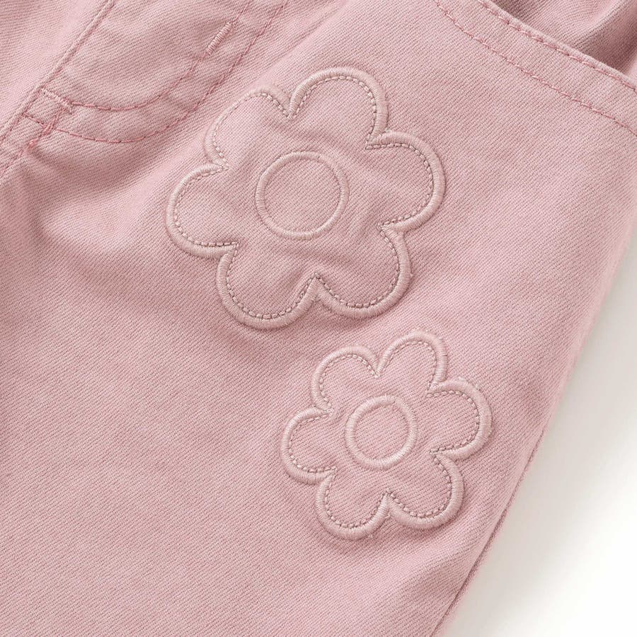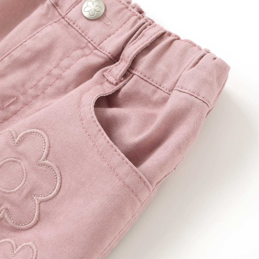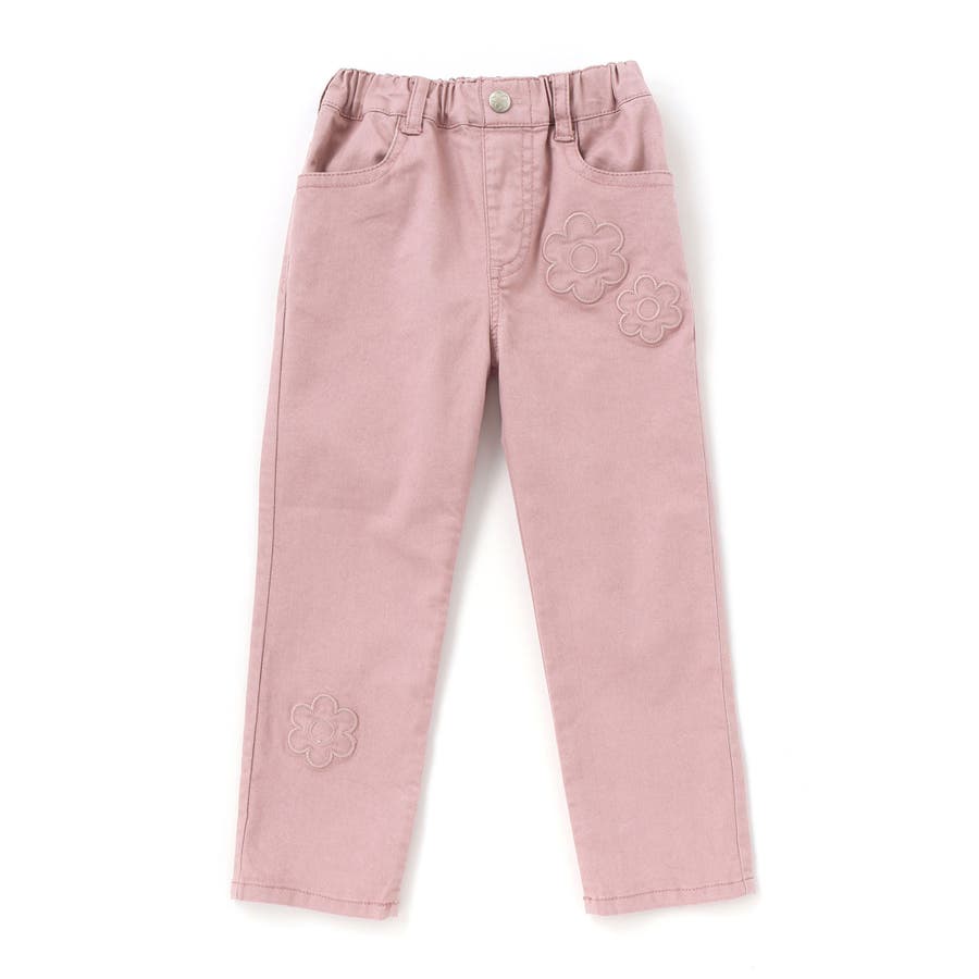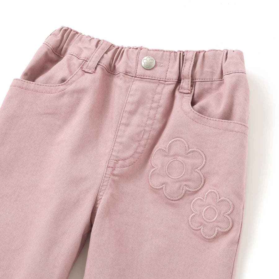 さりげないお花のパッチワークがポイント。動きやすくて可愛い女の子用カラーデニムパンツ。