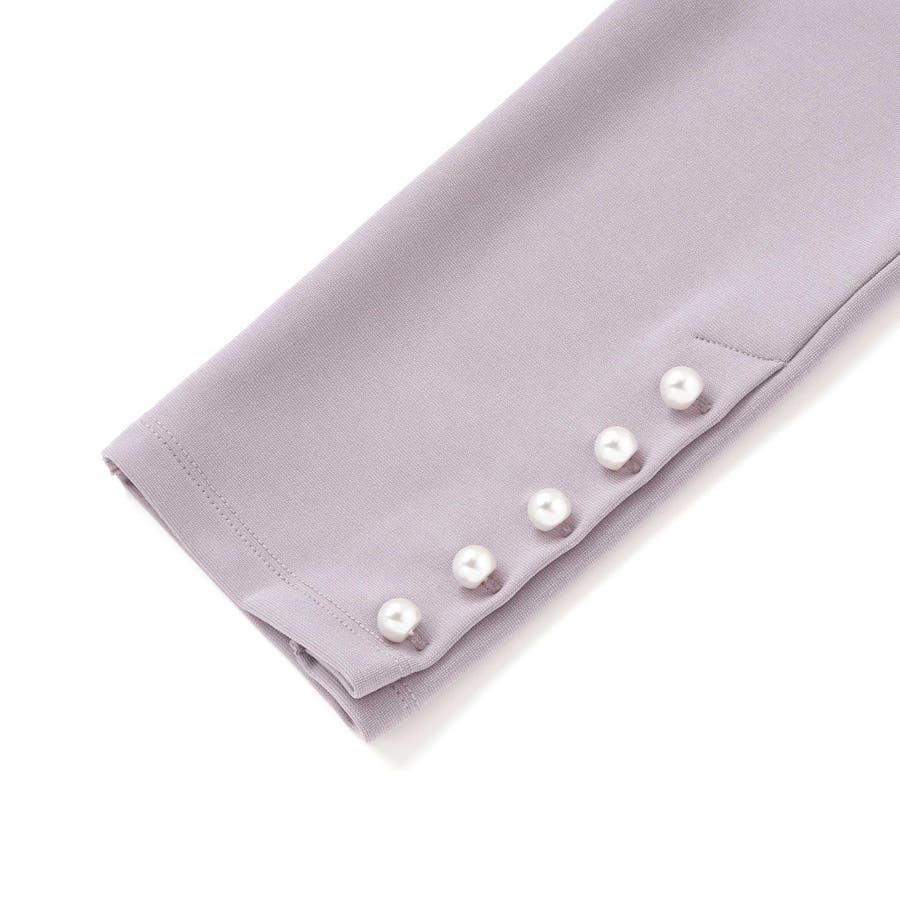 裾の外側に並んだパール調ボタンが、シンプルなシルエットに華やかさを添えるアクセント。