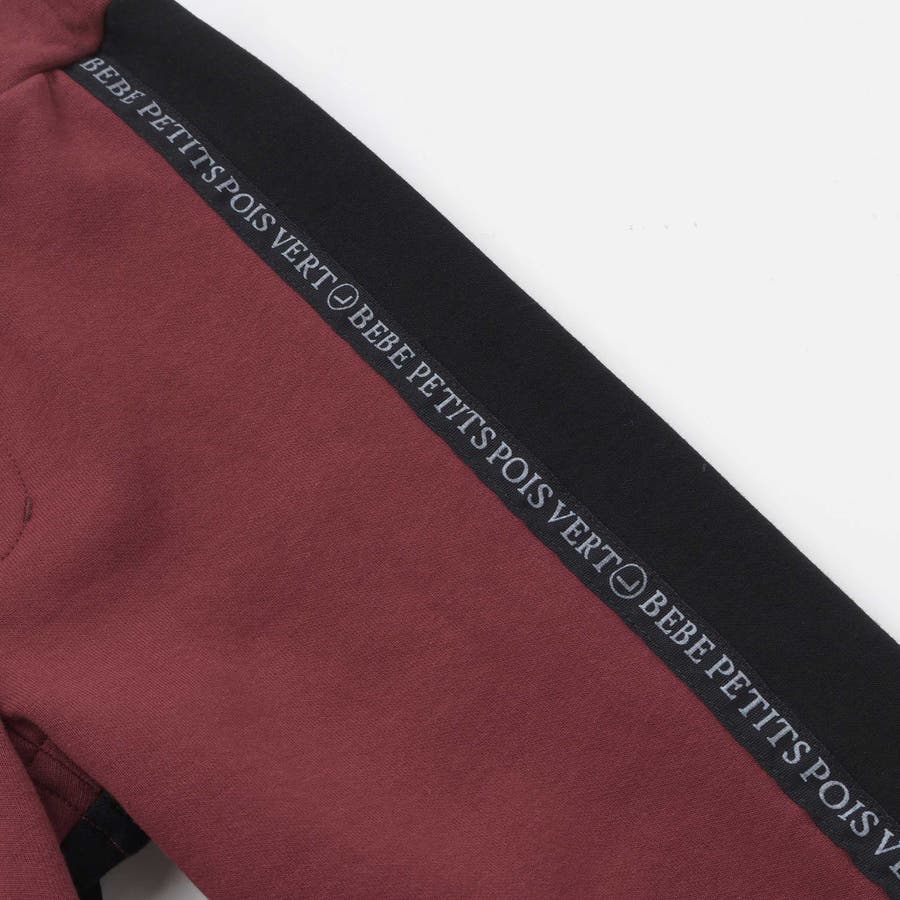 前後のカラー切り替えとロゴラインが目を引くデザインの男の子用ロングパンツ。
