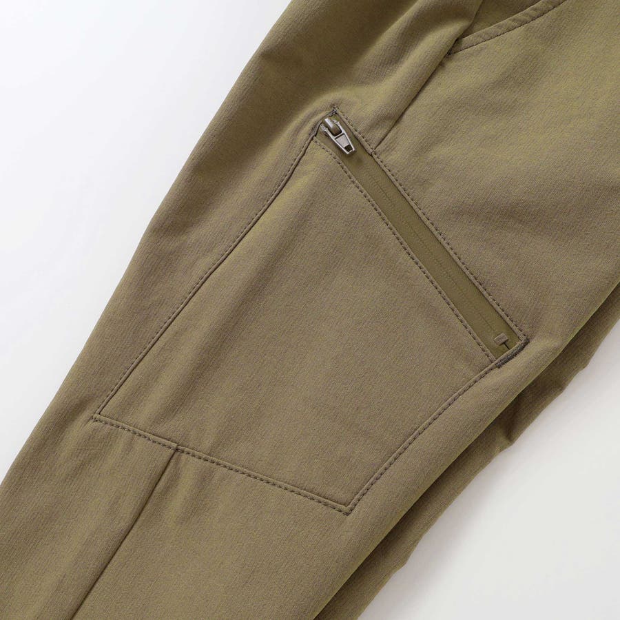 斜めに配置したジップ付き腰ポケットで、アクティブな印象と実用性を両立。