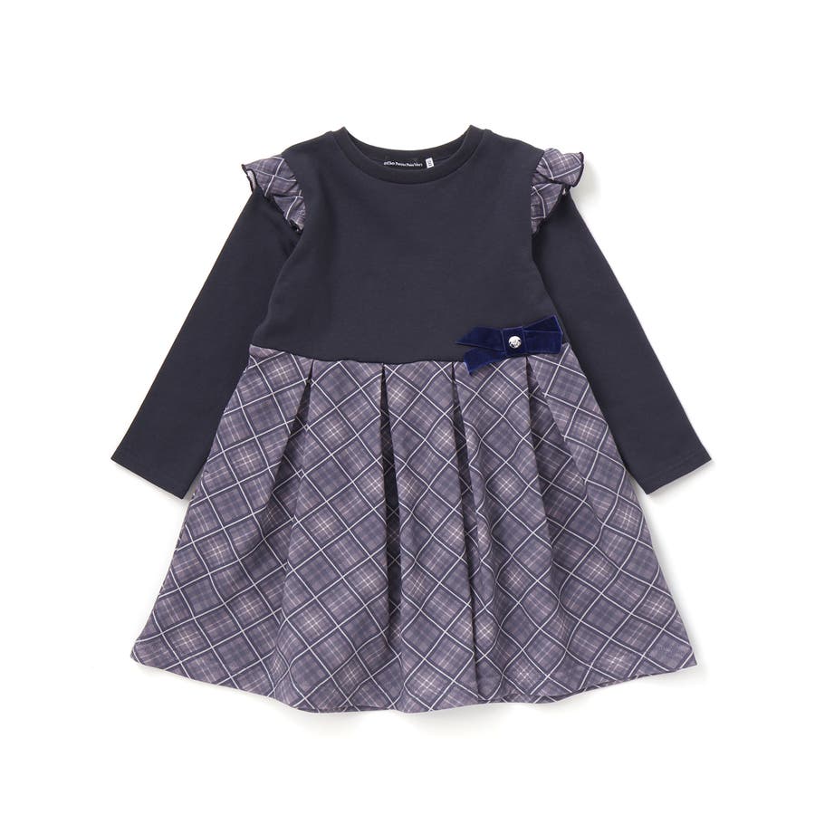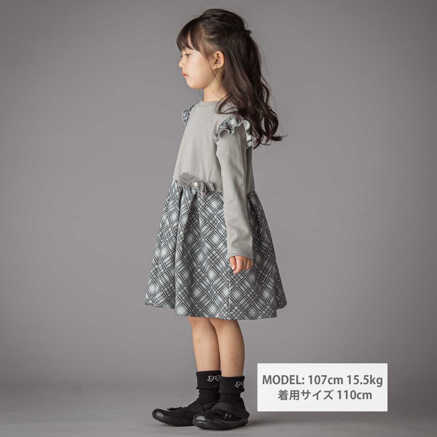 【お揃い】チェック柄裏毛ベロアリボンタックワンピース(95~150cm)