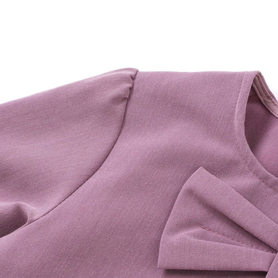 胸元のリボンとウエストのフリルがアクセントの女の子用ワンピース。