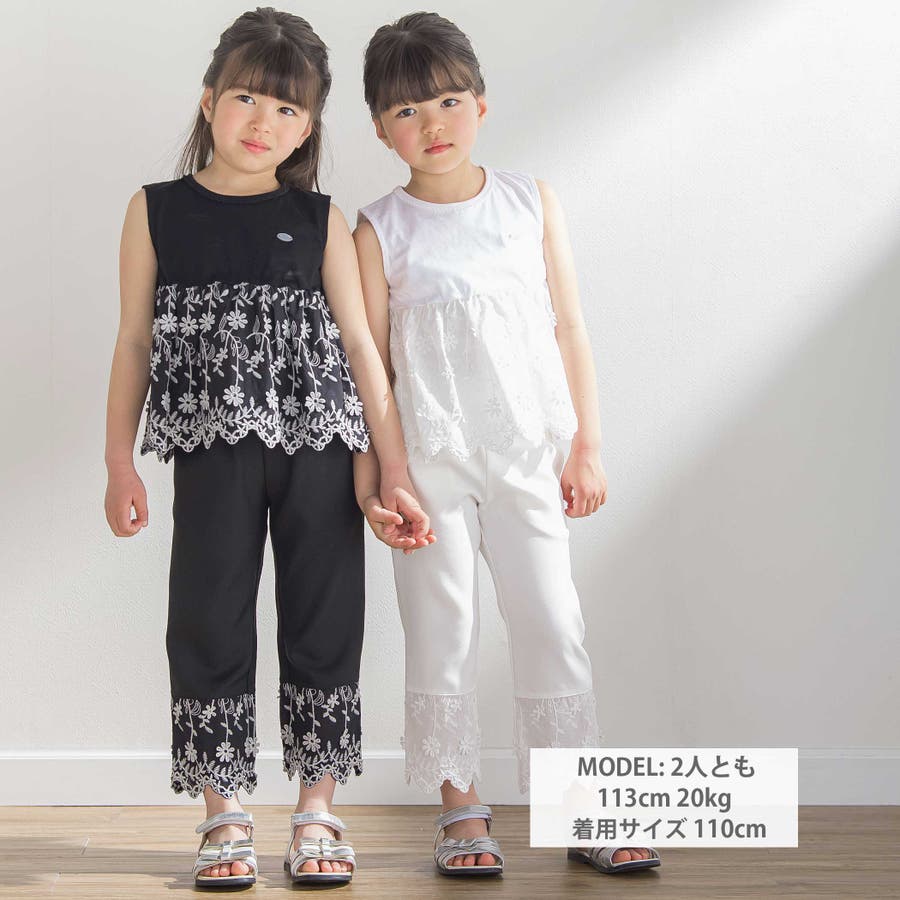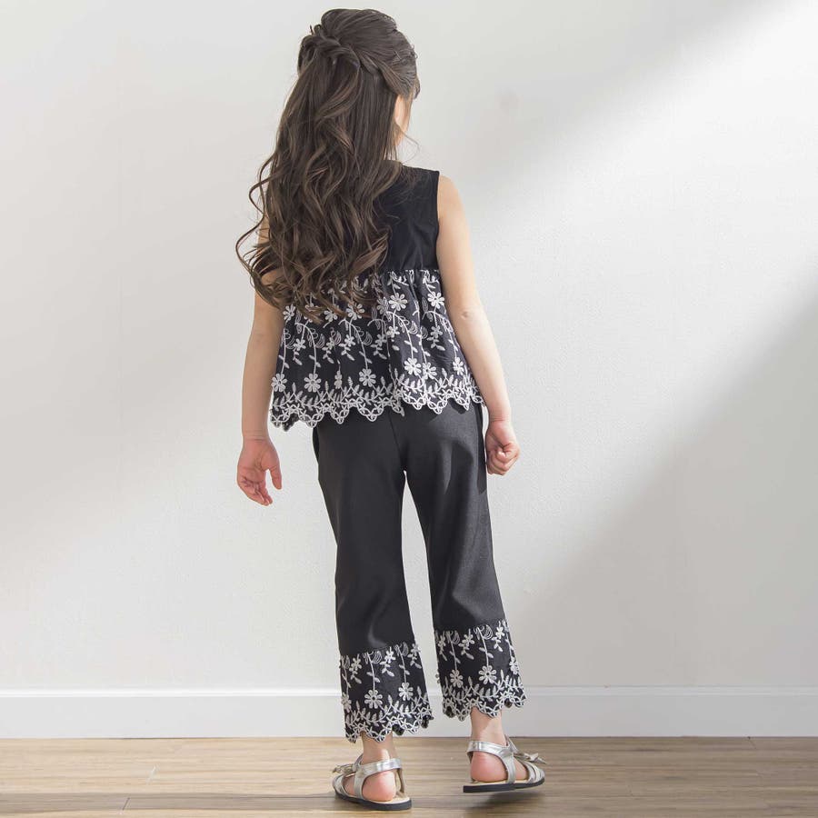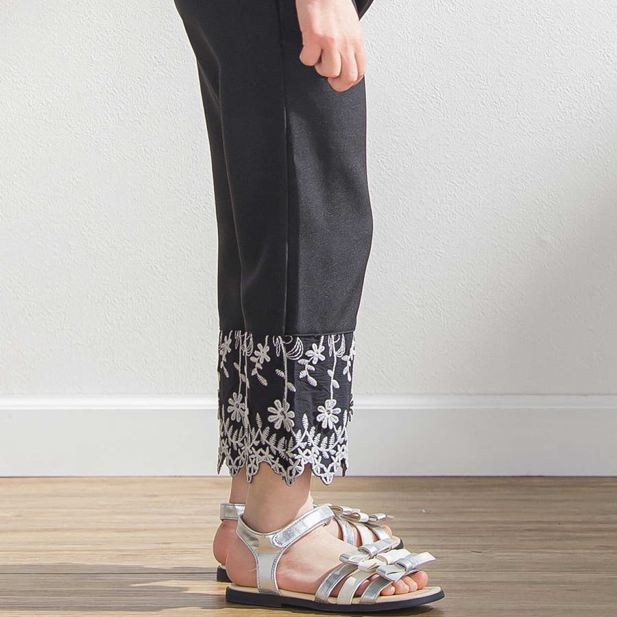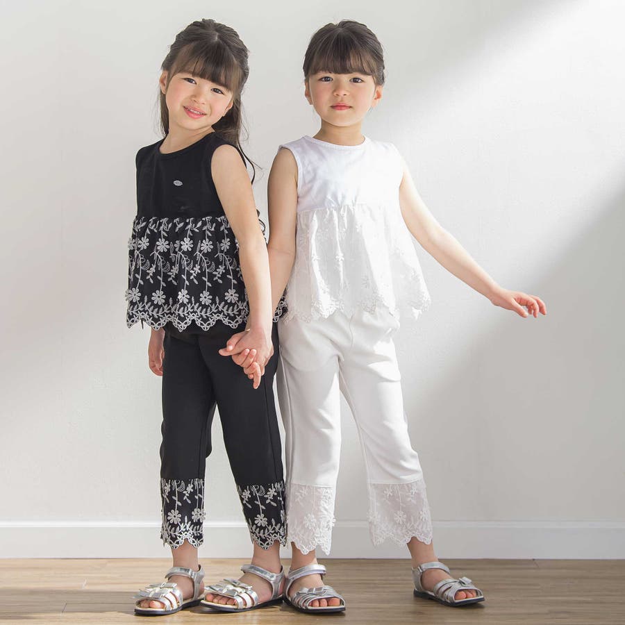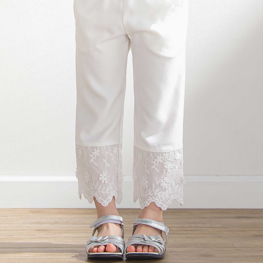 トップス・ボトムス共に、裾口に向かって刺しゅうレースデザインをほどこしているので甘すぎない少しお姉さんな着こなしに。