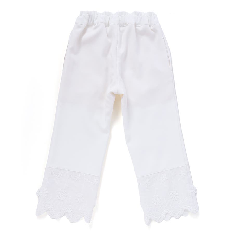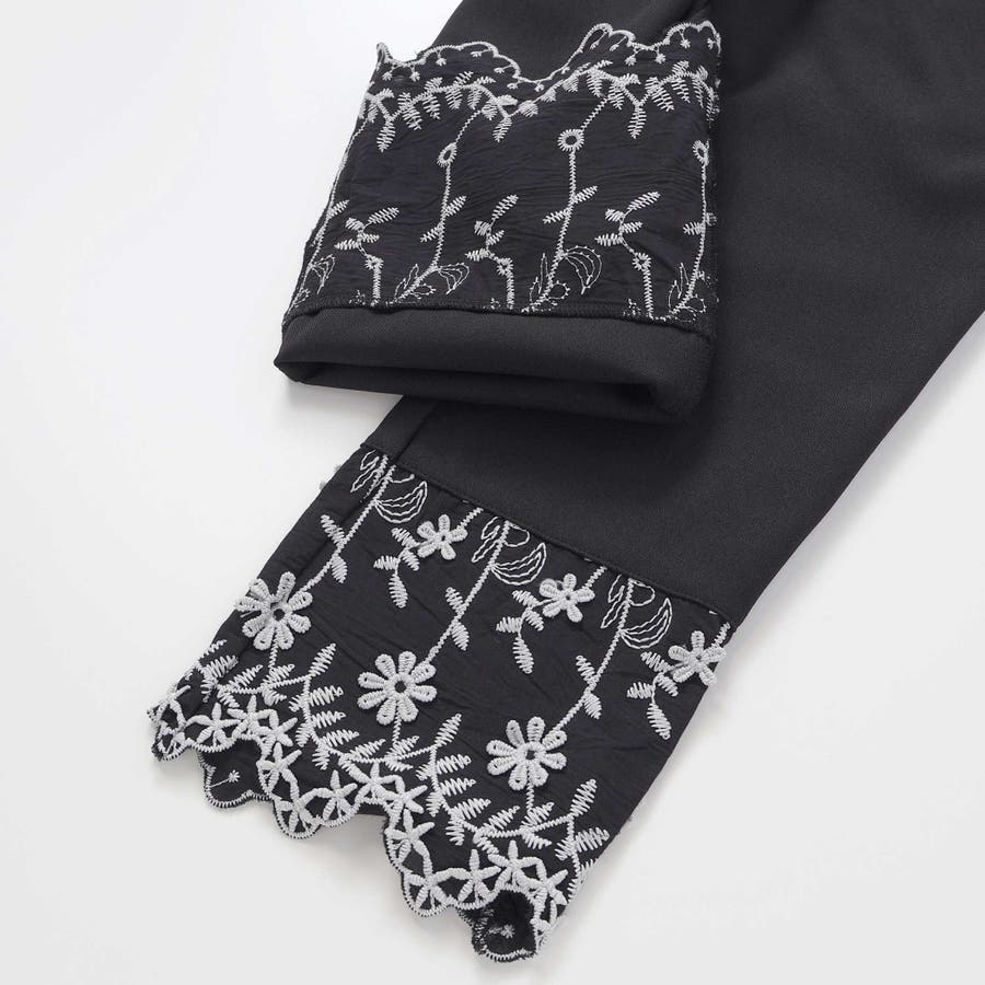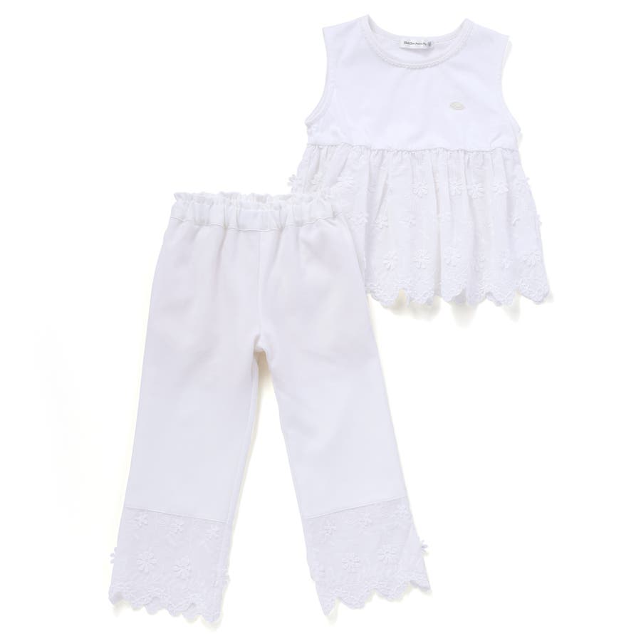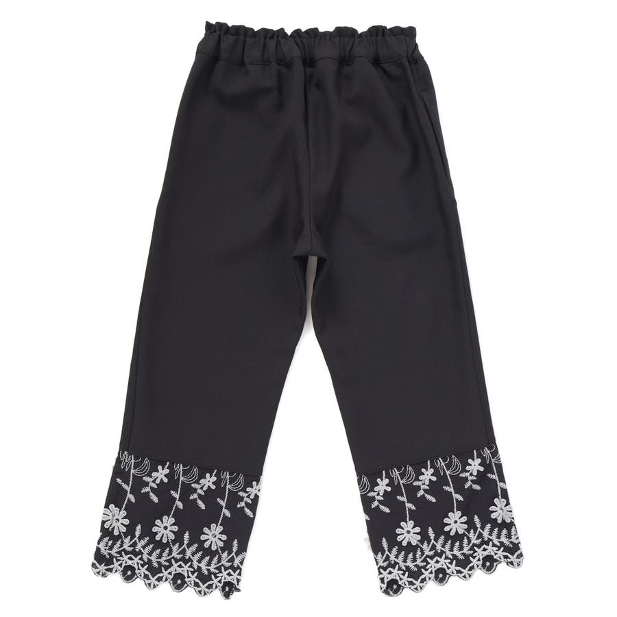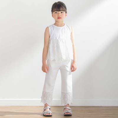 トップス・ボトムス共に、裾口に向かって刺しゅうレースデザインをほどこしているので甘すぎない少しお姉さんな着こなしに。