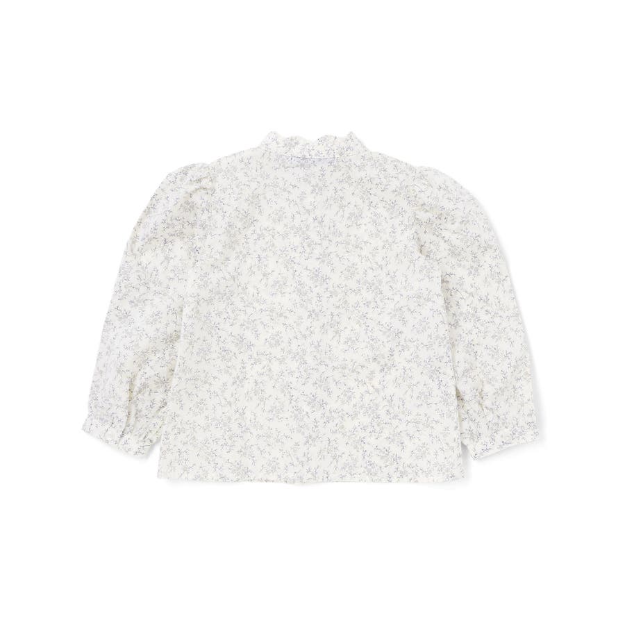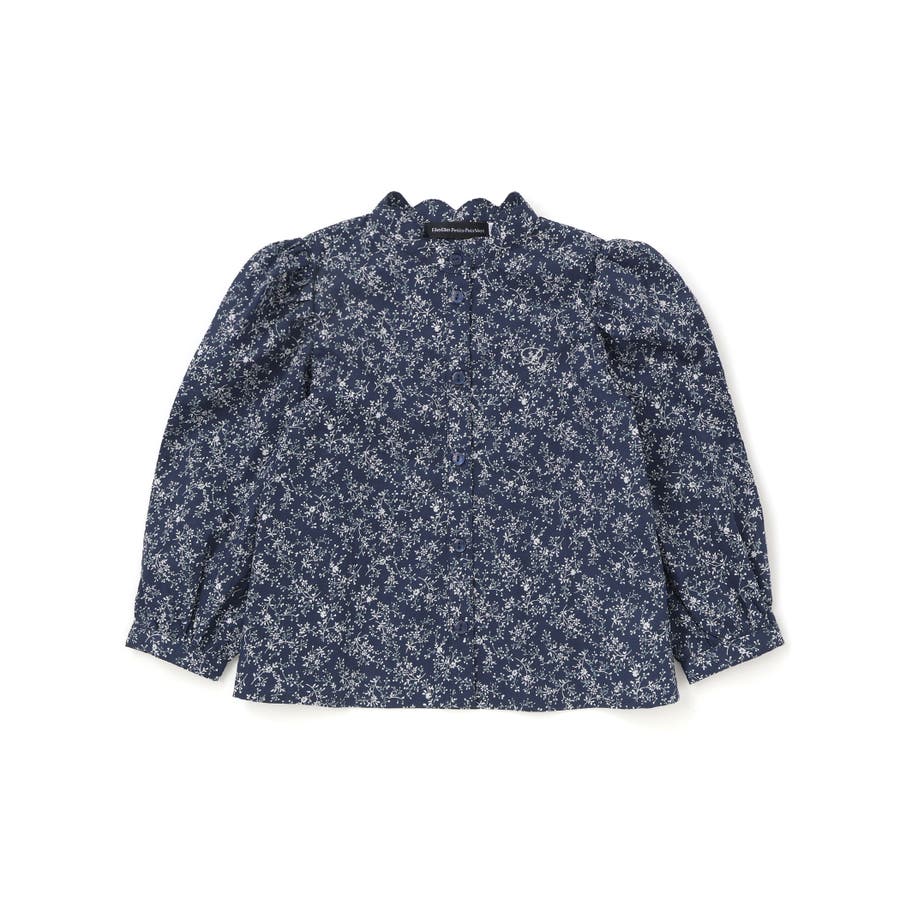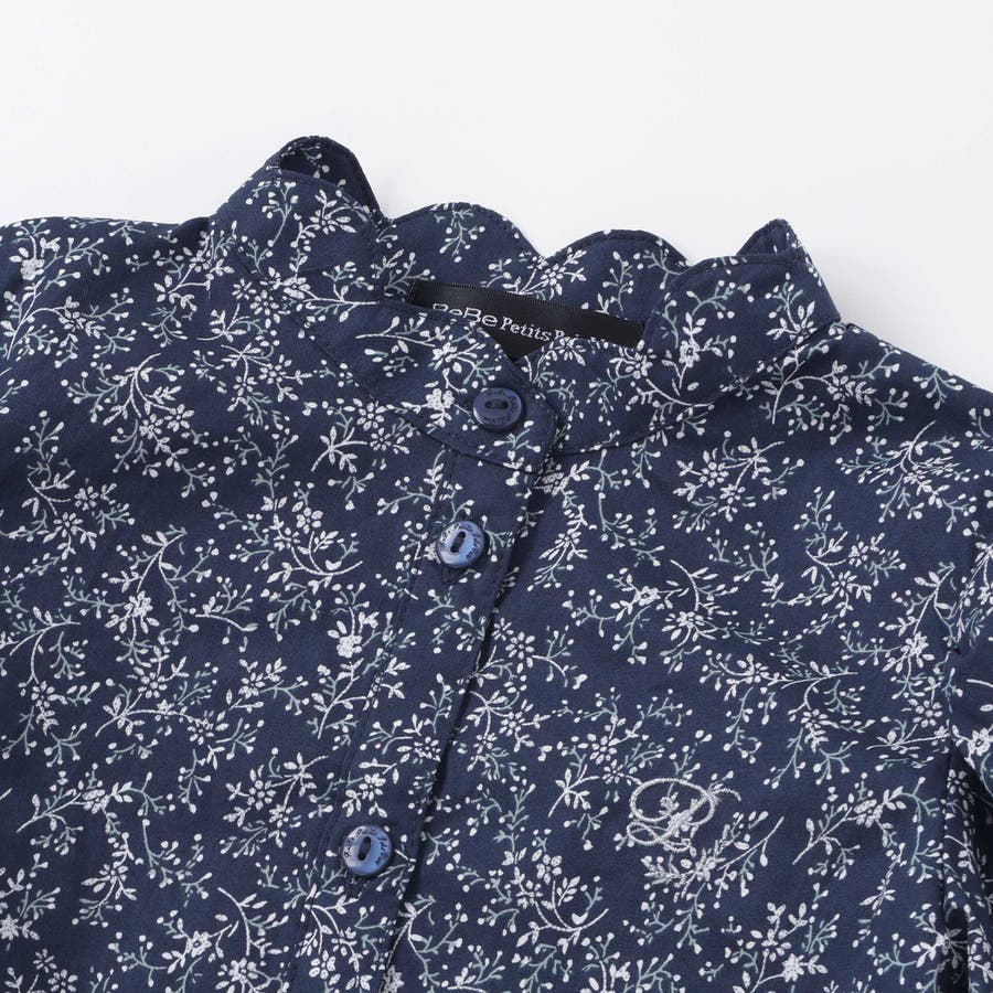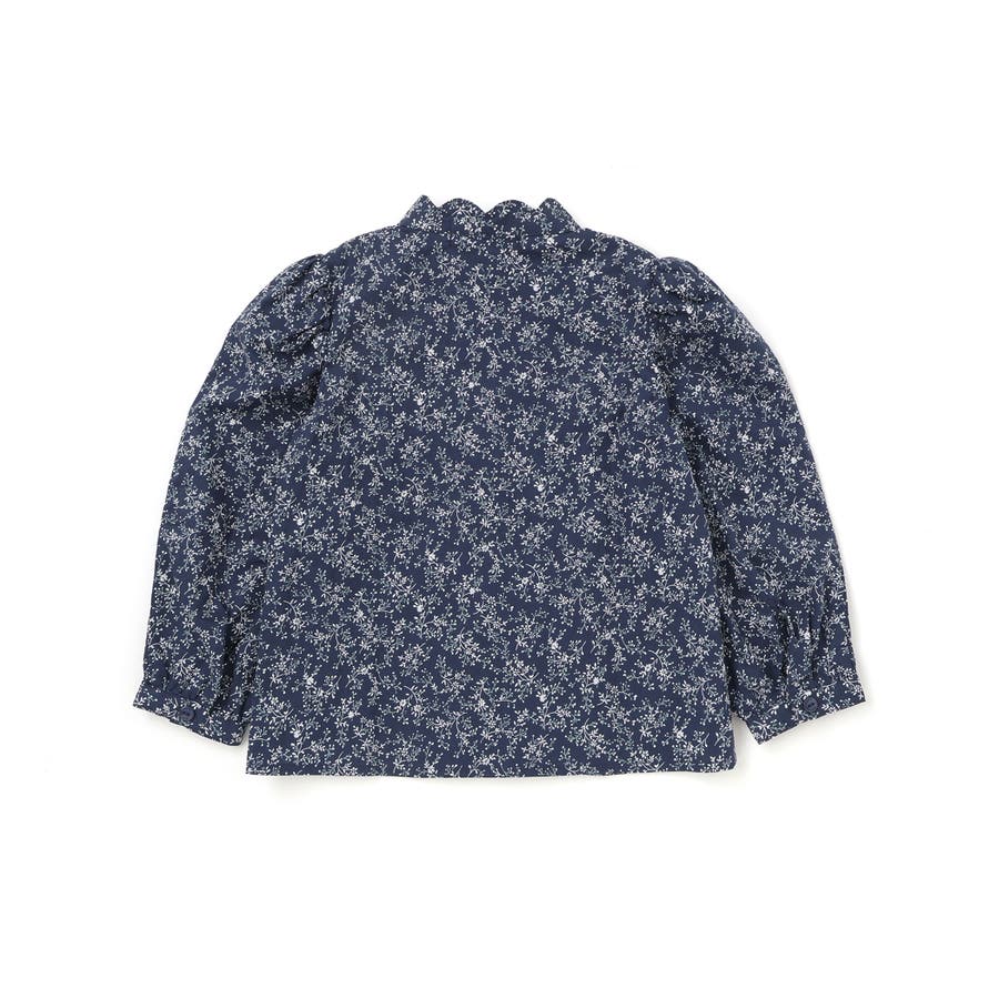 スカラップデザインのスタンドカラーが女の子らしい花柄シャツ。