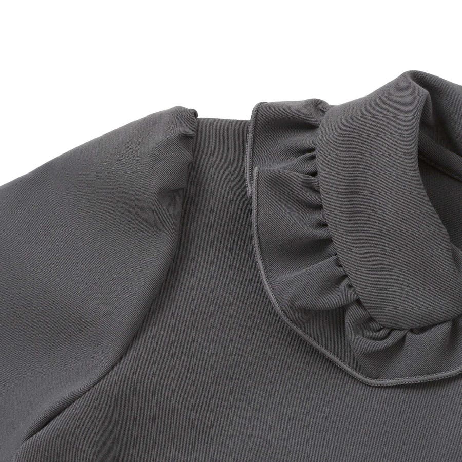 襟のフリルが上品な布帛素材のシャツです。