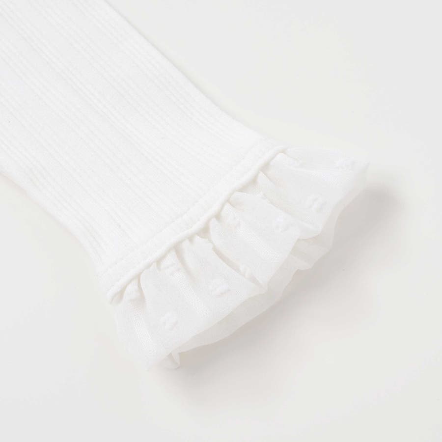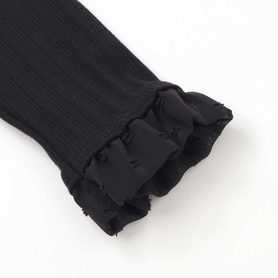袖口にカットジャガードの水玉柄が可愛いシフォン生地のフリルが付いたシンプルなロンTです。