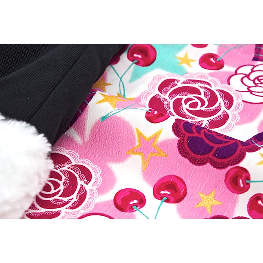 着物は色とりどりの薔薇やフルーツなどの模様がデザインされています。