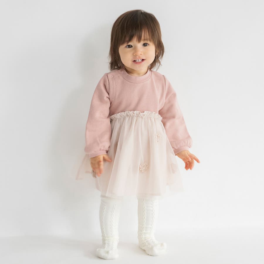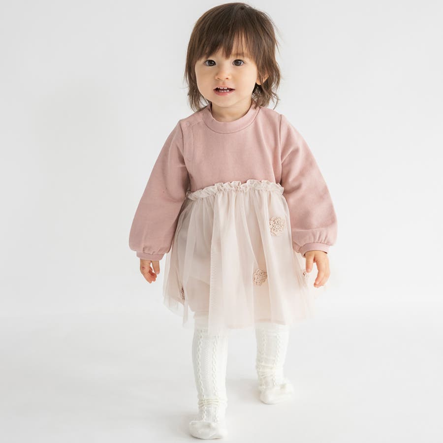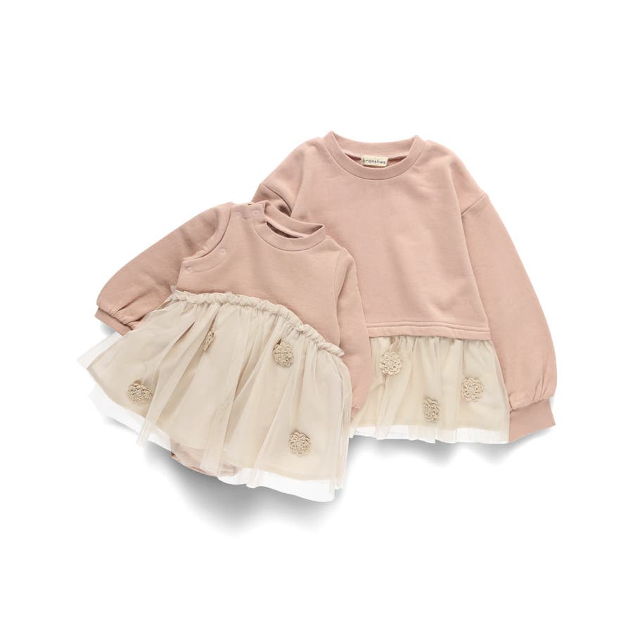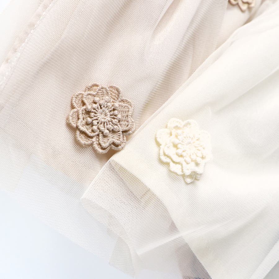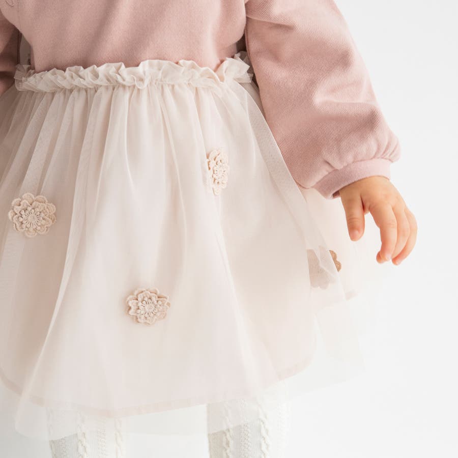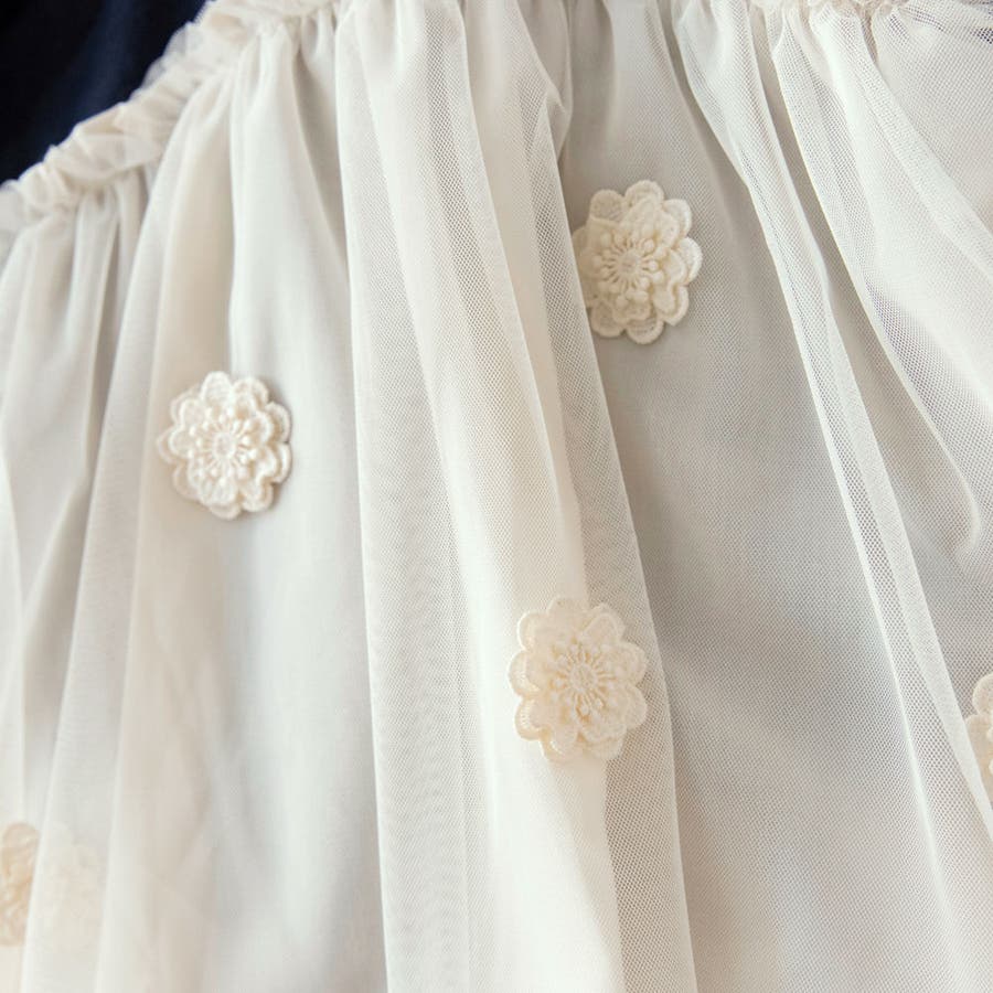 素材 | 本体:綿100% チュール部分:ポリエステル100% 布帛部分:ポリエステル80% 綿20% モチーフ:ポリエステル100% リブ部分:綿95% ポリウレタン5% |