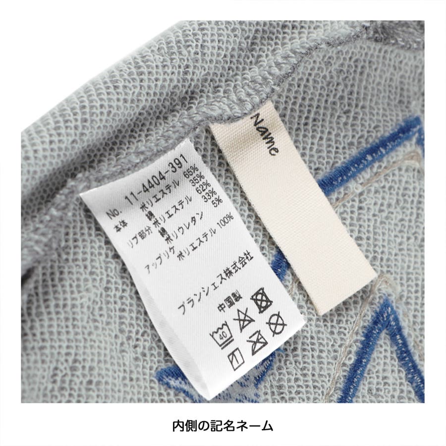 | 素材 | 本体:ポリエステル65% 綿35% リブ部分:ポリエステル62% 綿33% ポリウレタン5% アップリケ:ポリエステル100% |