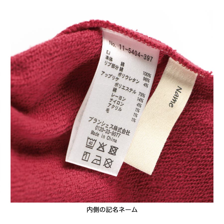 | 素材 | 本体:綿100% リブ部分:綿96% ポリウレタン4% アップリケ:ポリエステル79% 綿14% レーヨン4% ナイロン1% アクリル1% 毛1% |