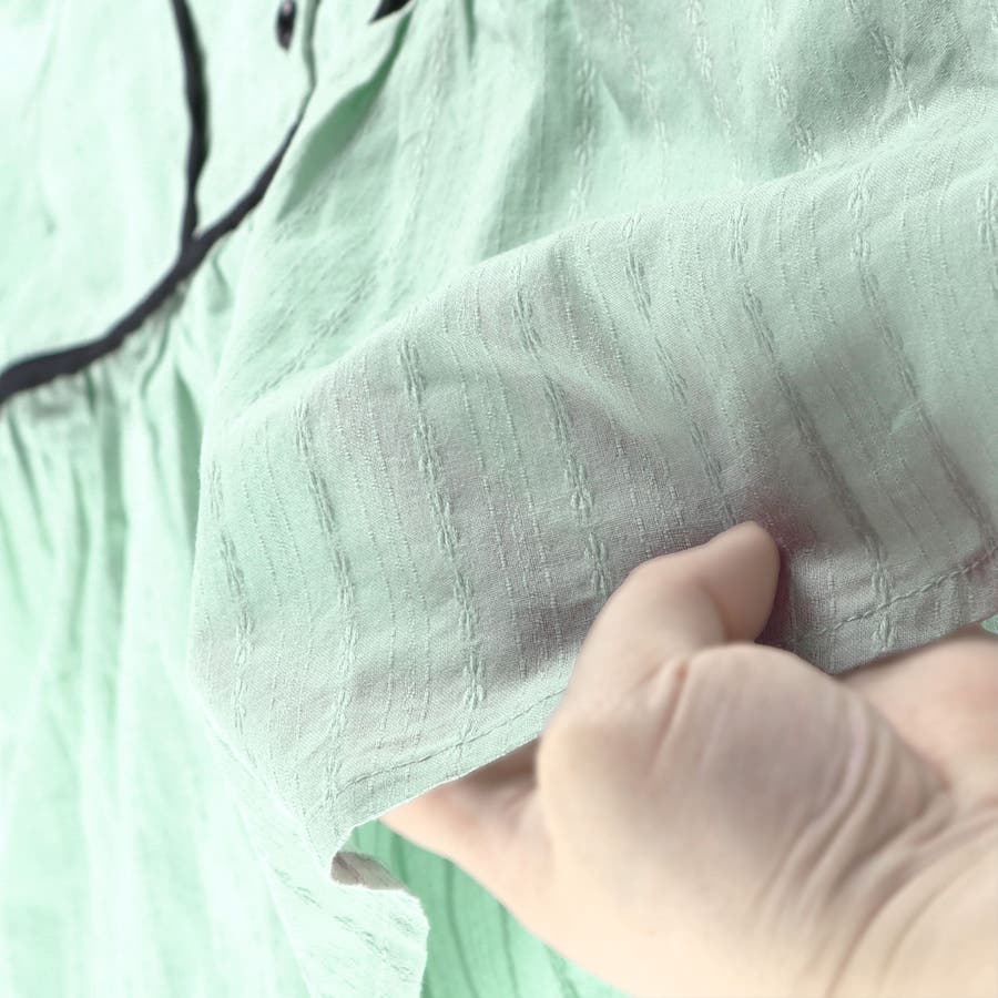 大人っぽい黒のパイピングと、たっぷりギャザーが入ったボリューム袖で、