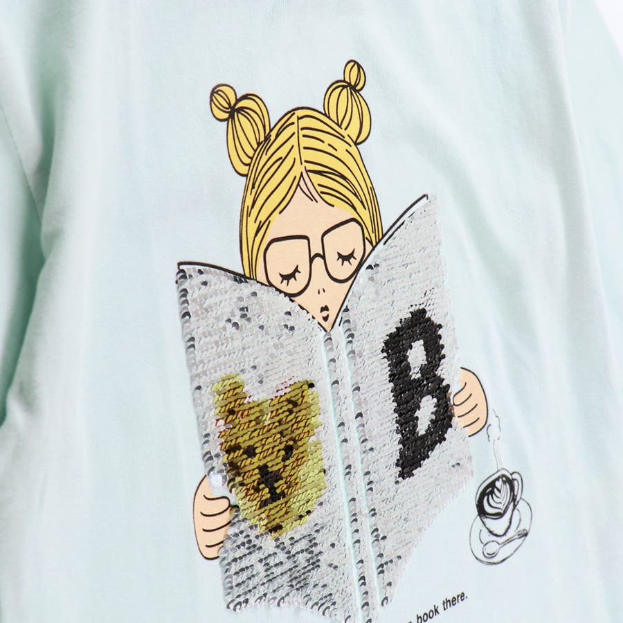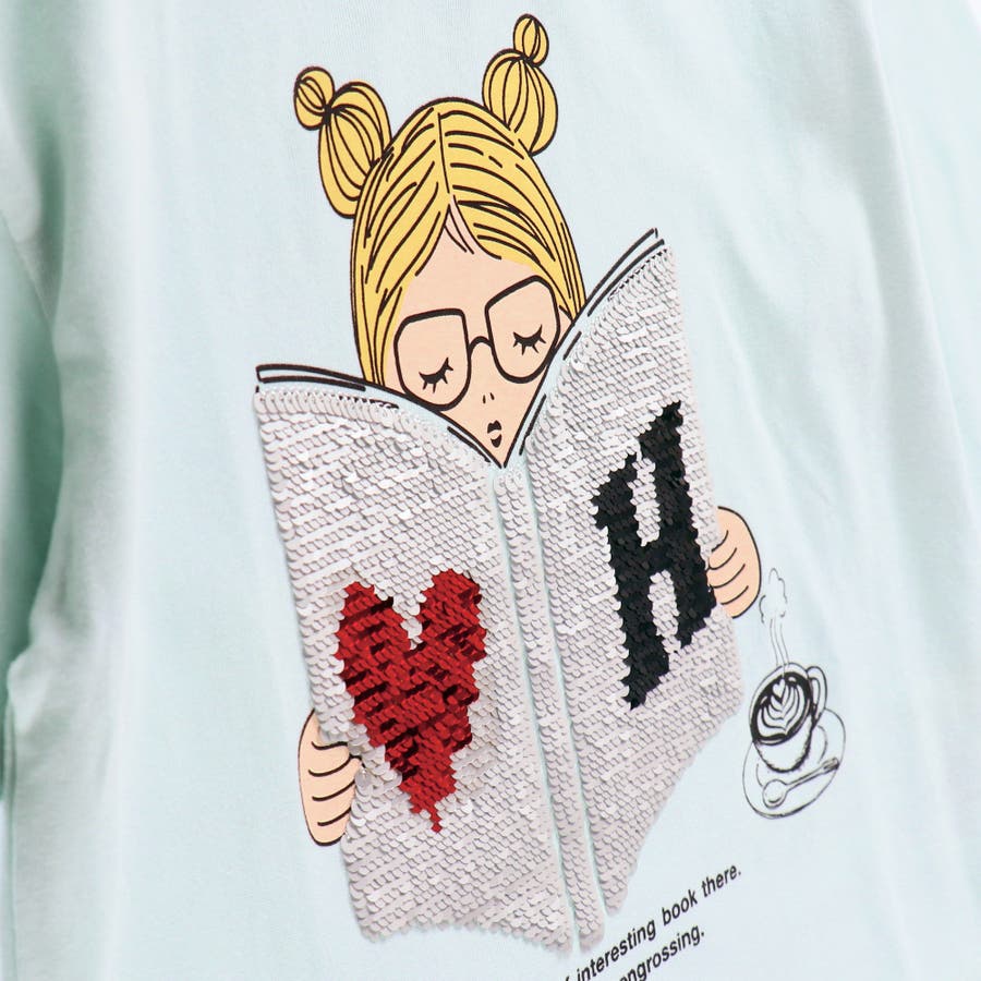 サックスカラーは本を読む女の子がインパクトある1枚。スパンコール部分はリバーシブルで、向きを変えると色や模様が変わる仕掛けになっています。