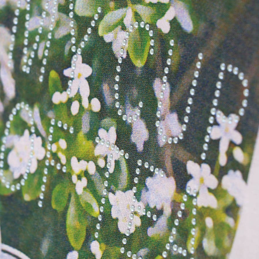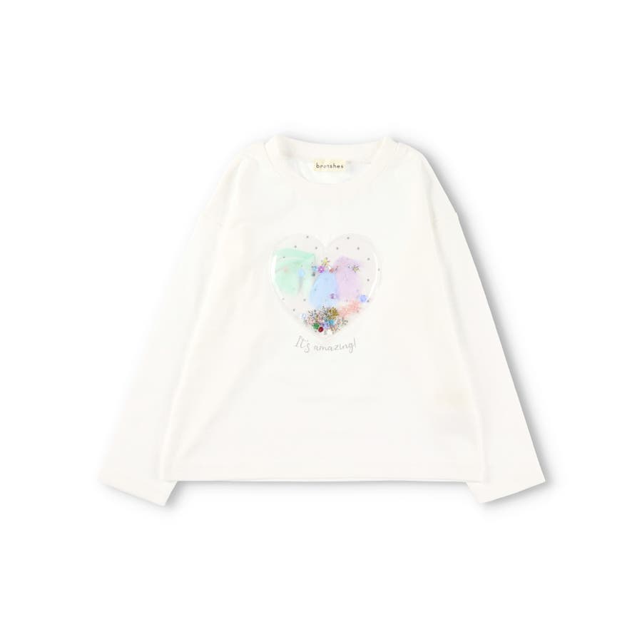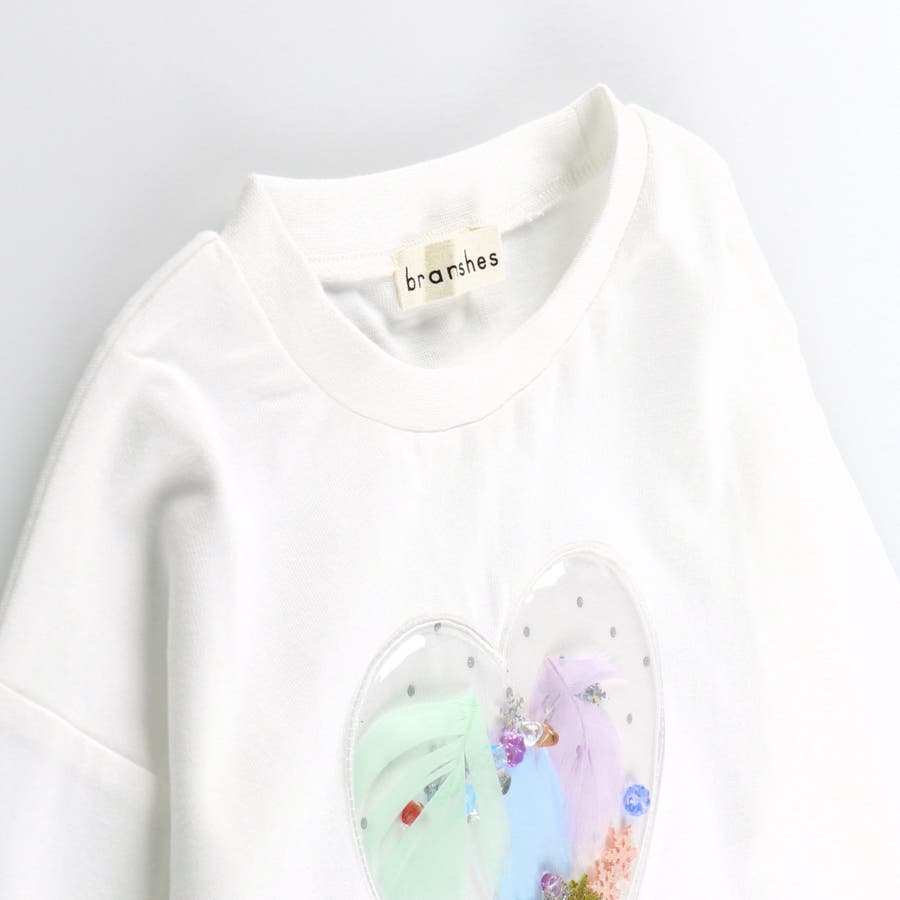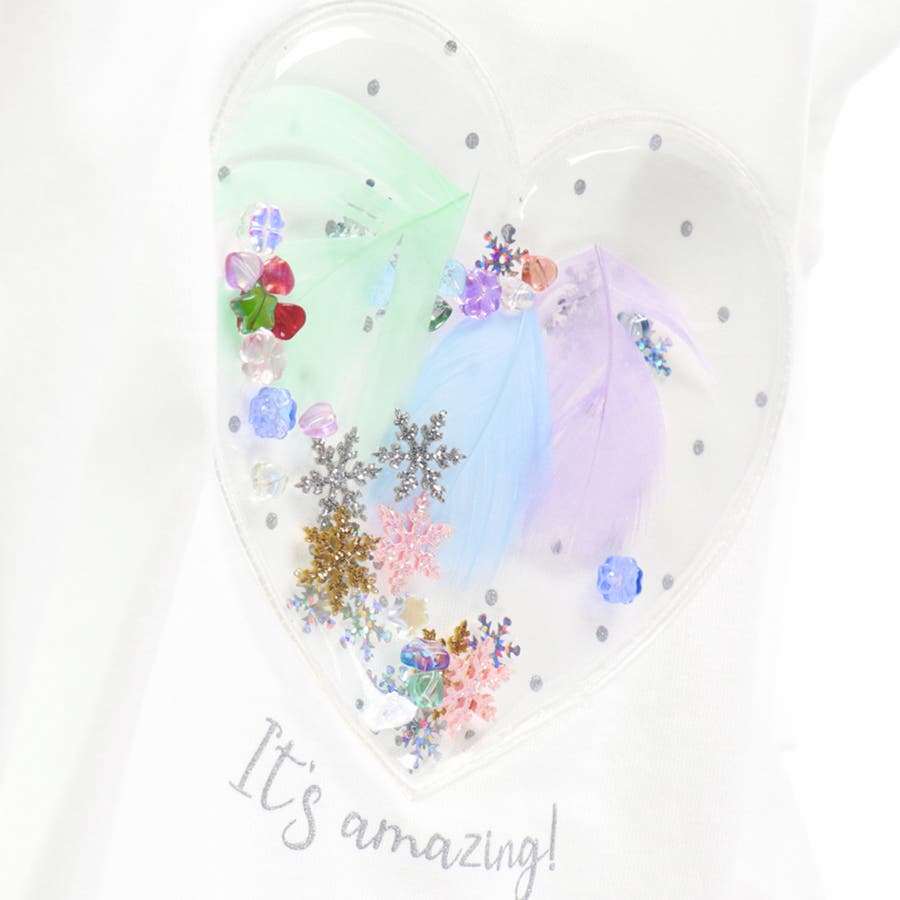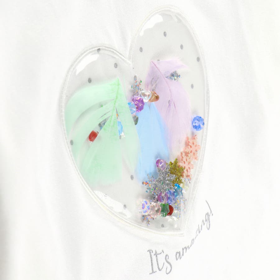 オフカラーはハートの中にビーズや羽を詰め込んだキュートな1枚。