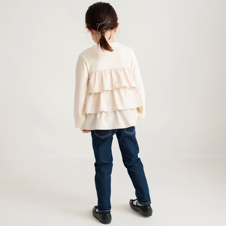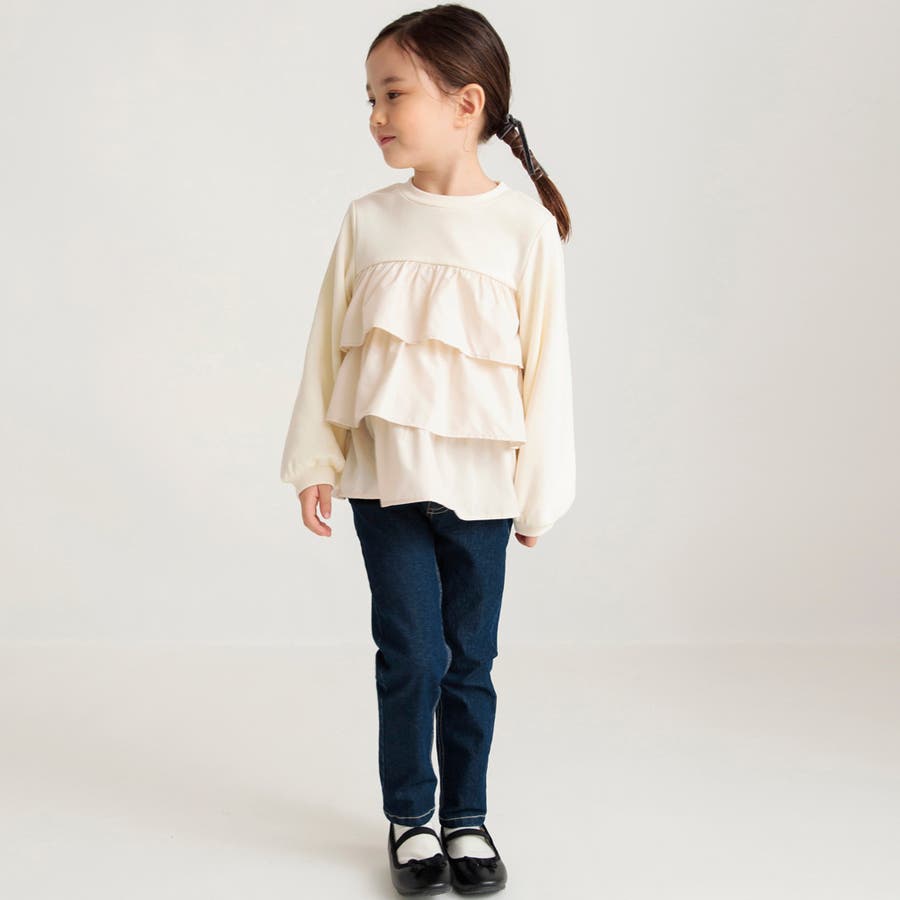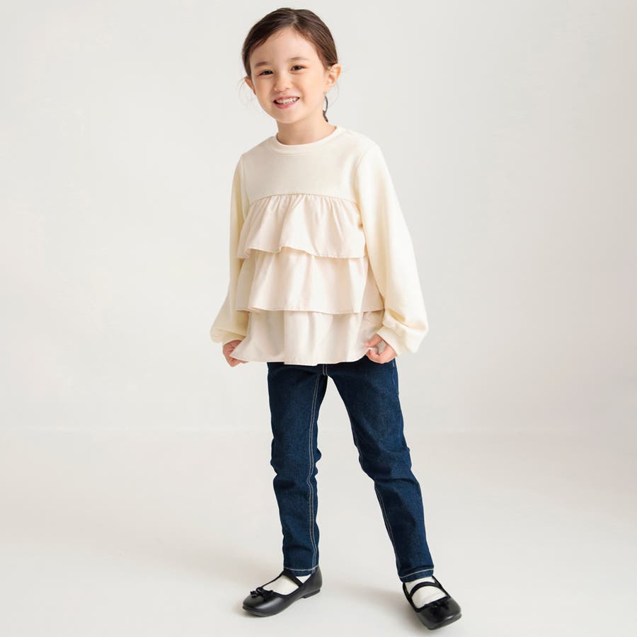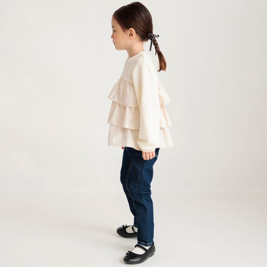 フリル部分に入ったギャザーによって程よいボリューム感が出るので、ボトムスはすっきりラインのパンツが相性◎