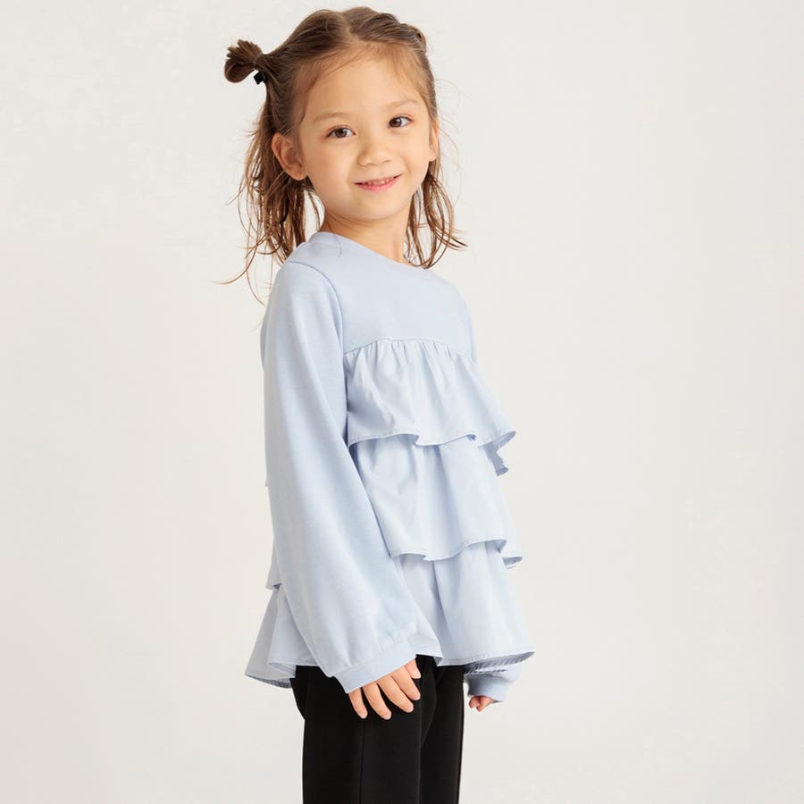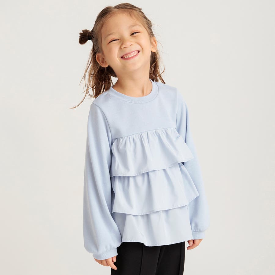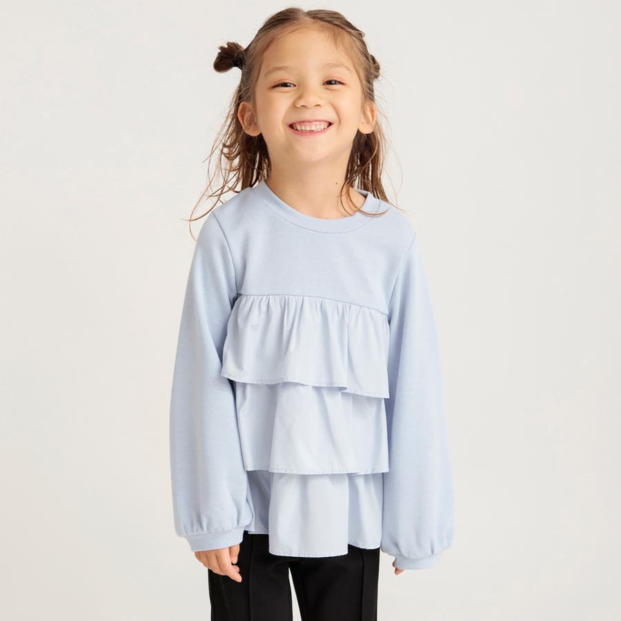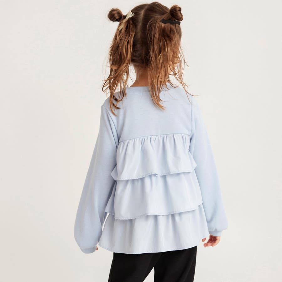 フリル部分に入ったギャザーによって程よいボリューム感が出るので、ボトムスはすっきりラインのパンツが相性◎