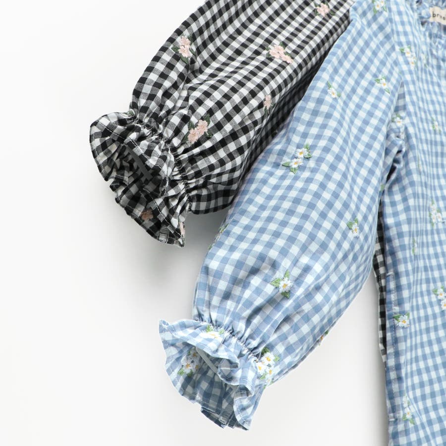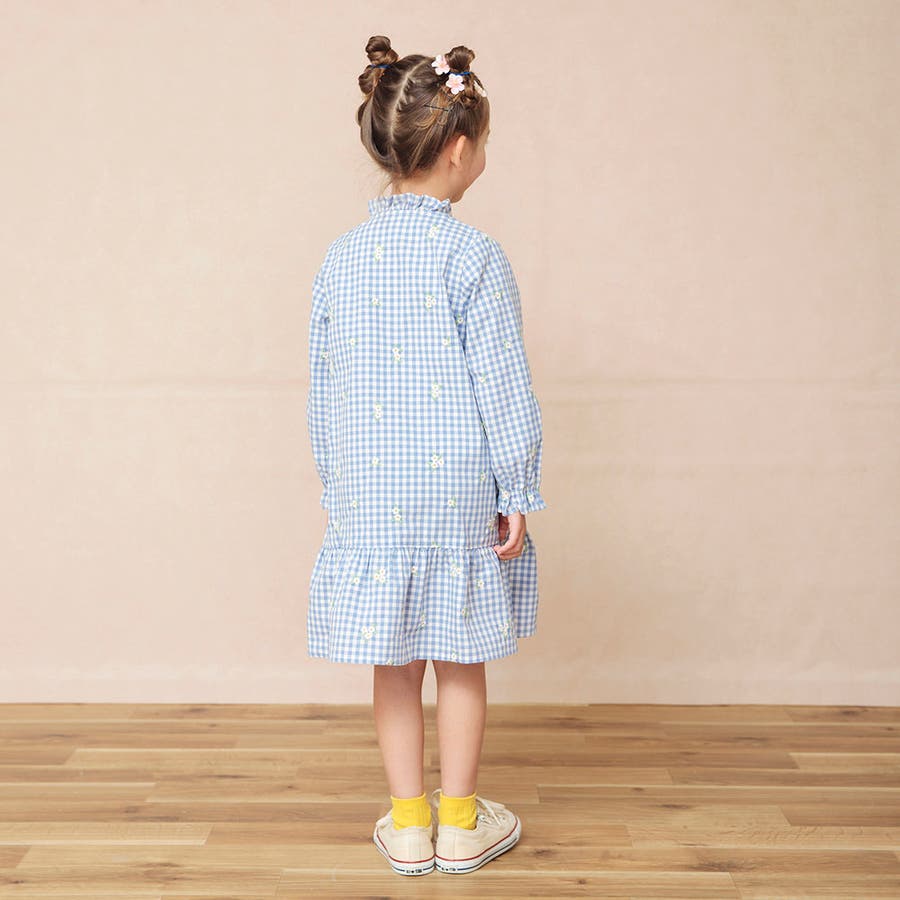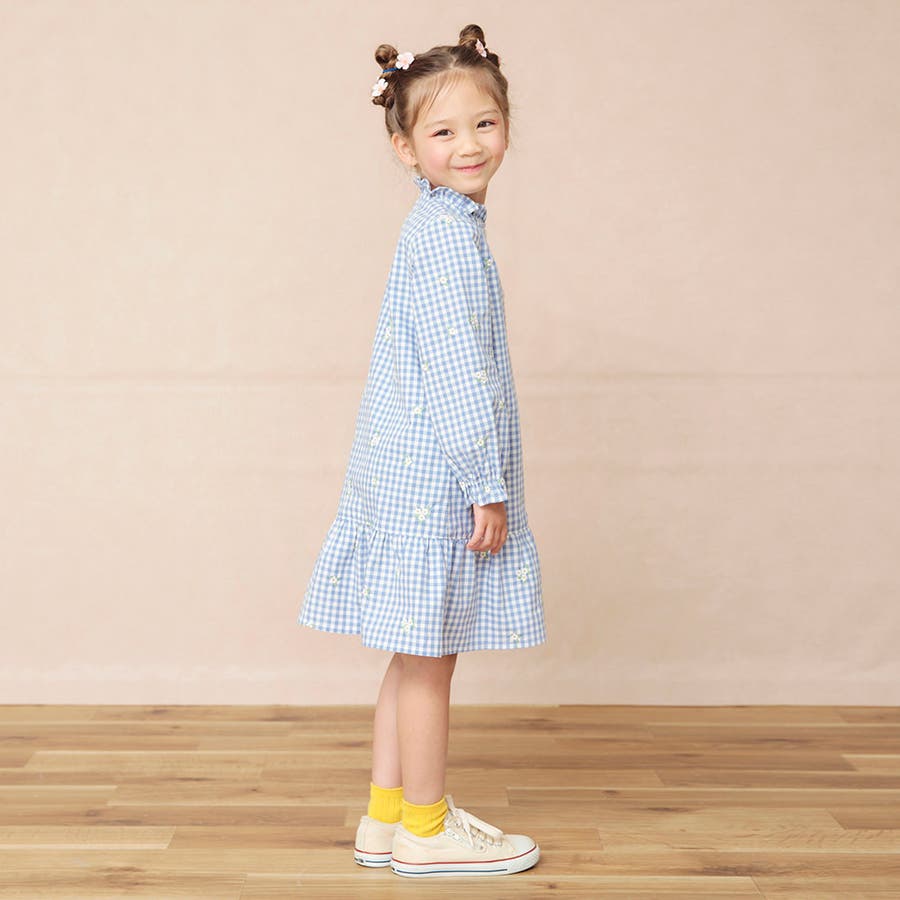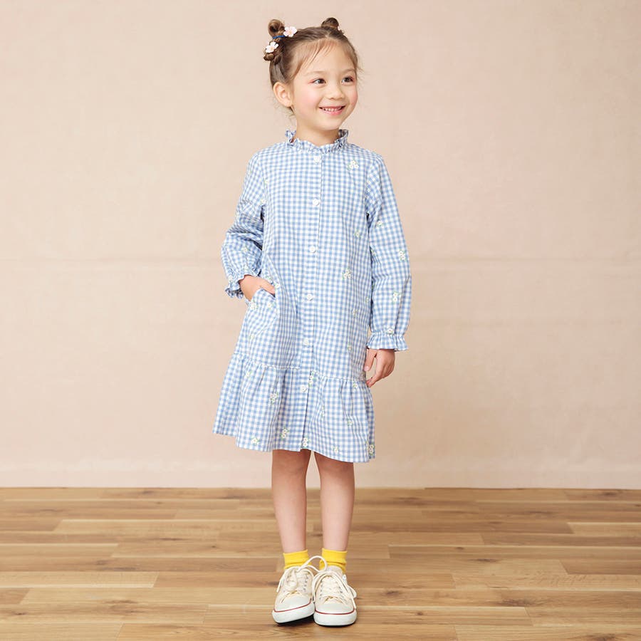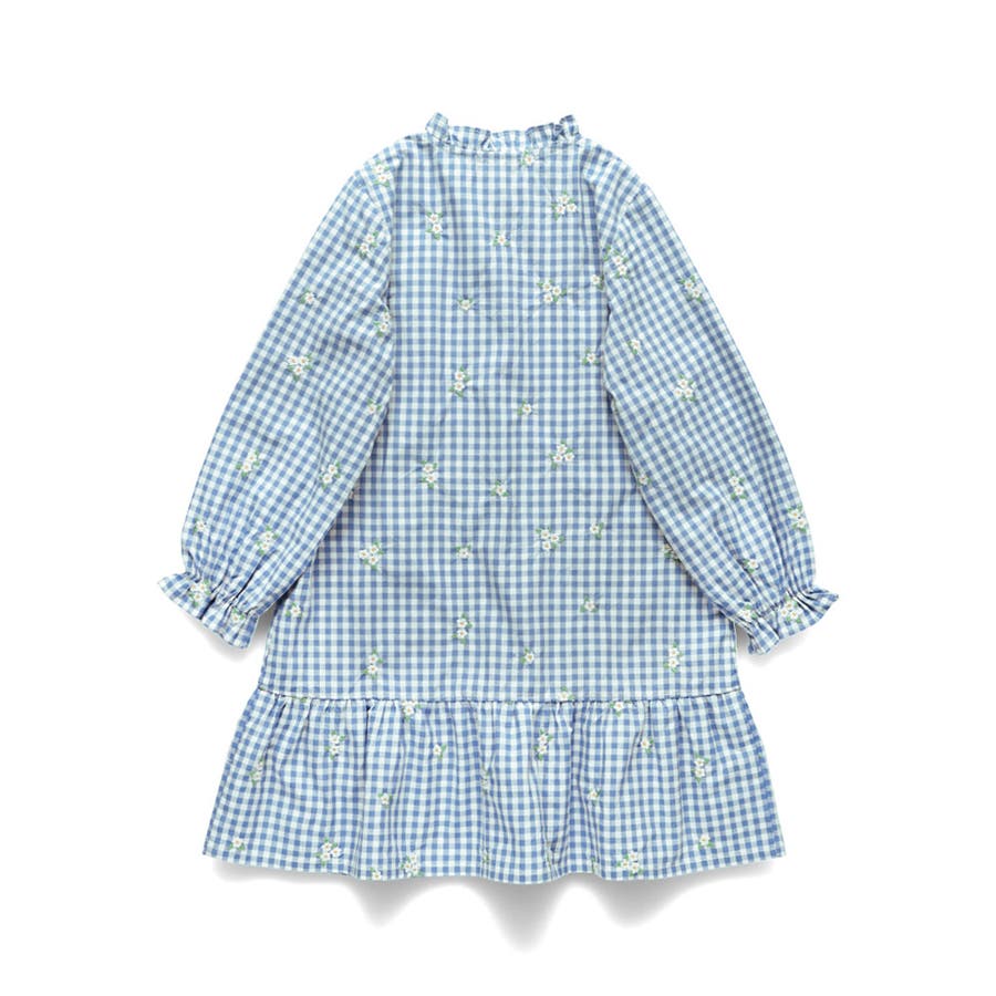 衿ぐりのフリルや裾の切り替えがガーリーさをプラス。