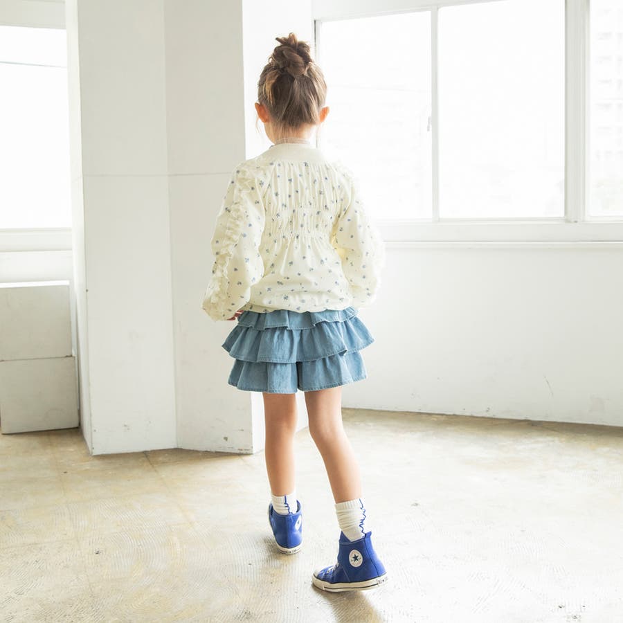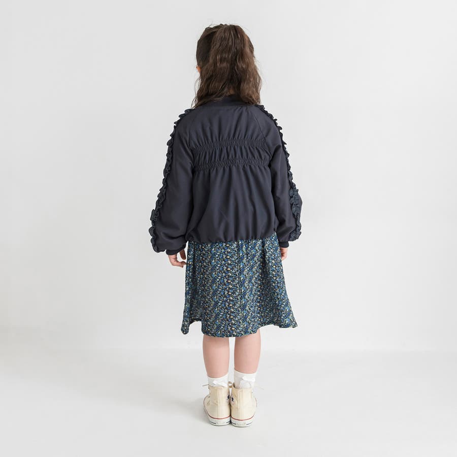 肩フリルや胸元シャーリング、裾ゴムで丸みのある