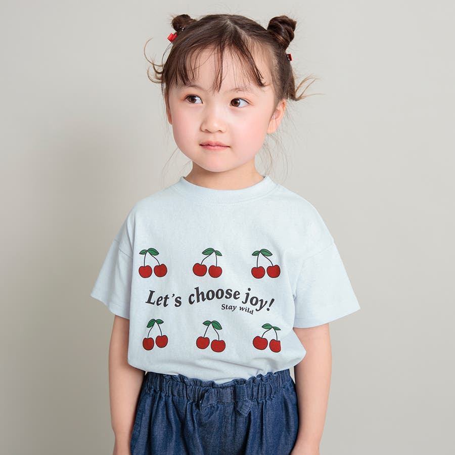 胸元にチェリーが描かれてる可愛らしいデザインTシャツで色も淡い水色で女の子らしいTシャツです。柔らかい生地で着やすいかなって思いました。