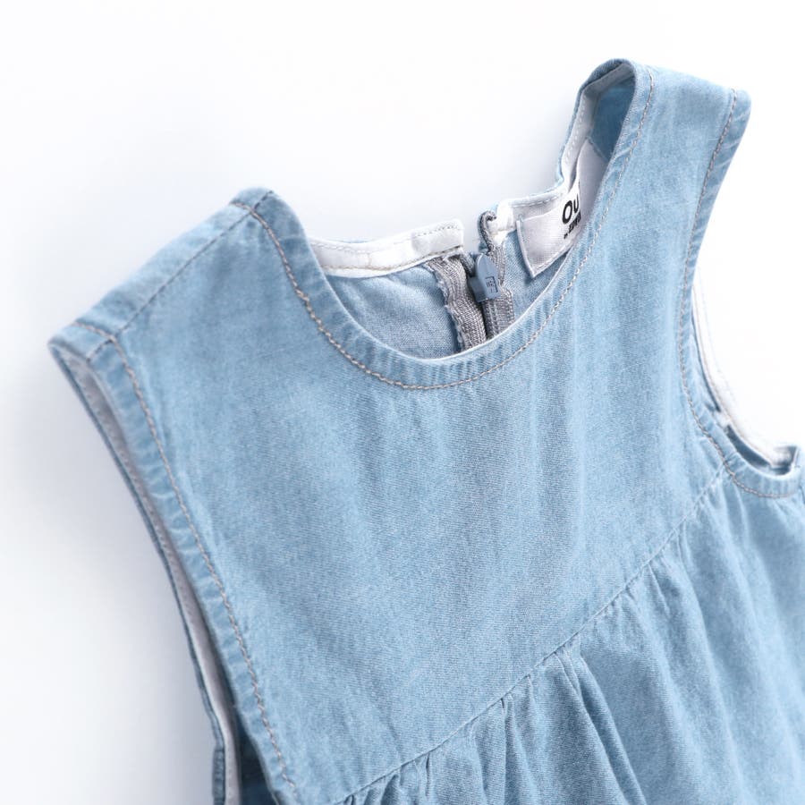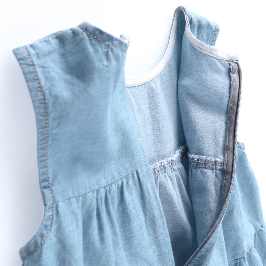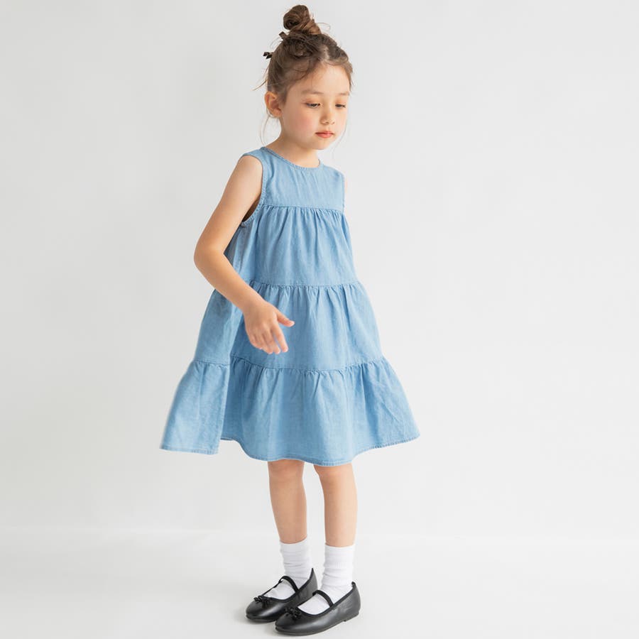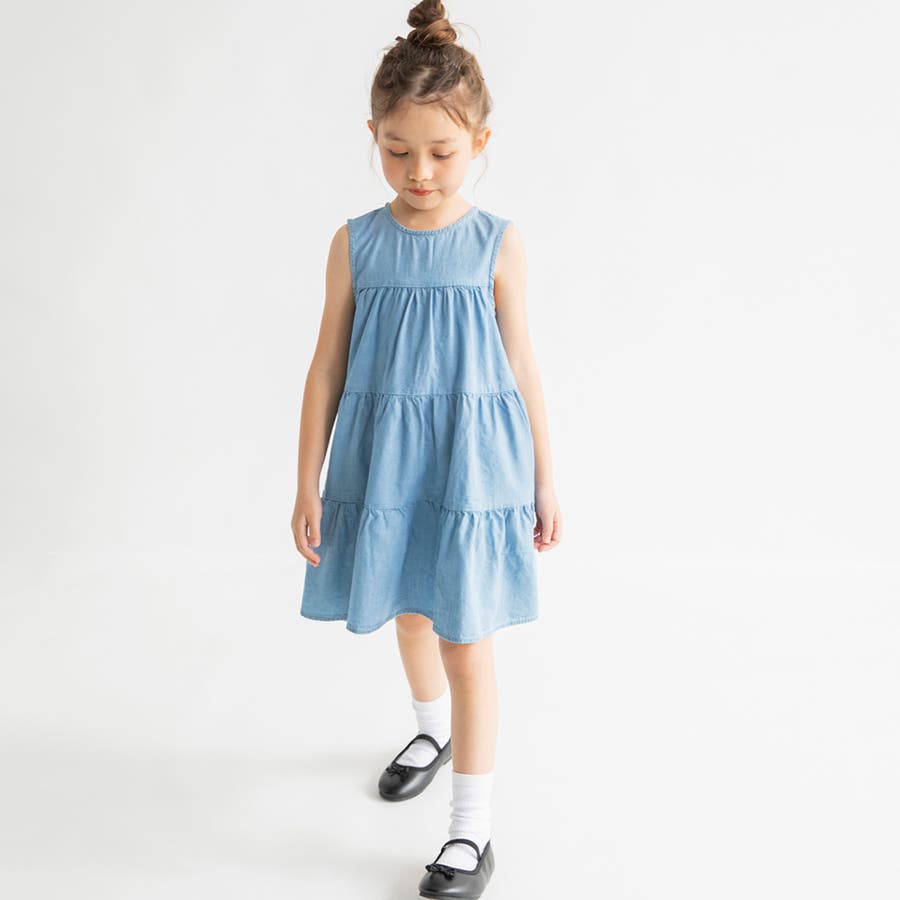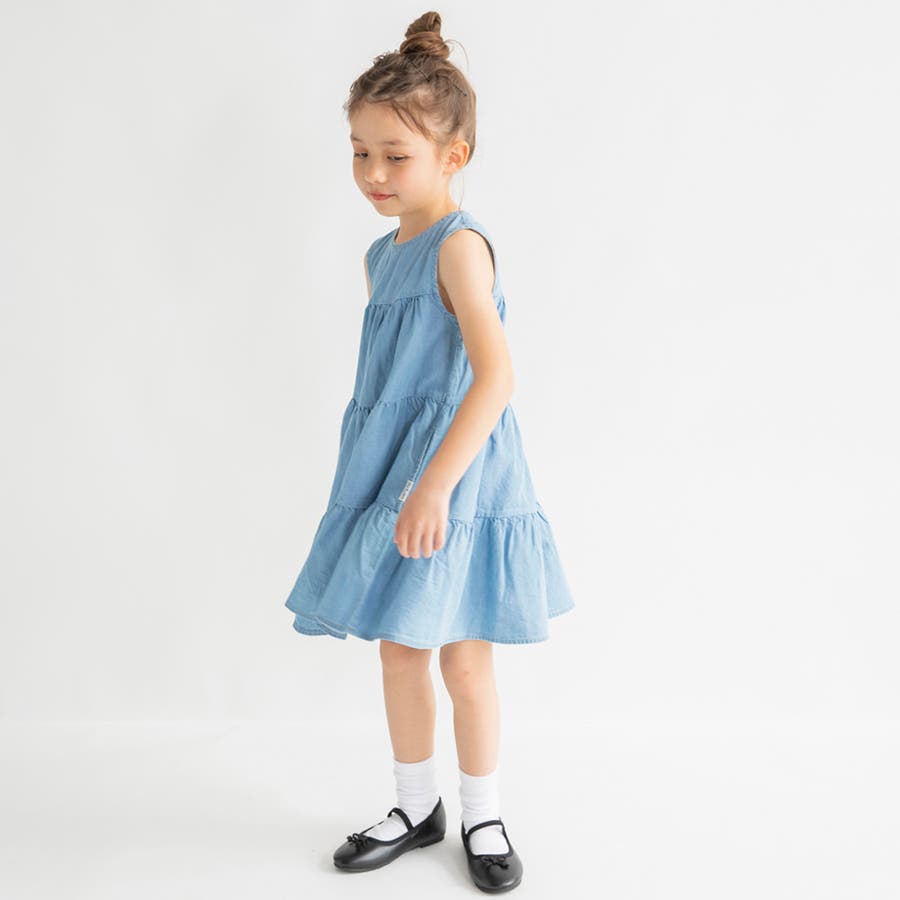 ノースリーブデザインと膝上丈で、デニム素材でも重たく