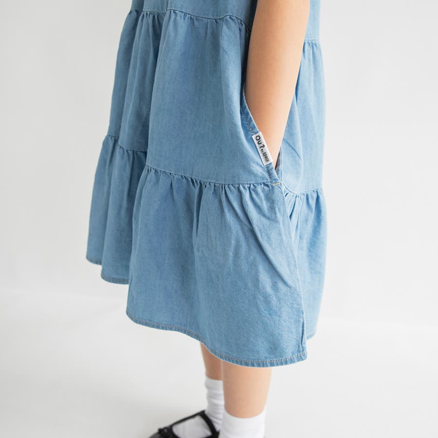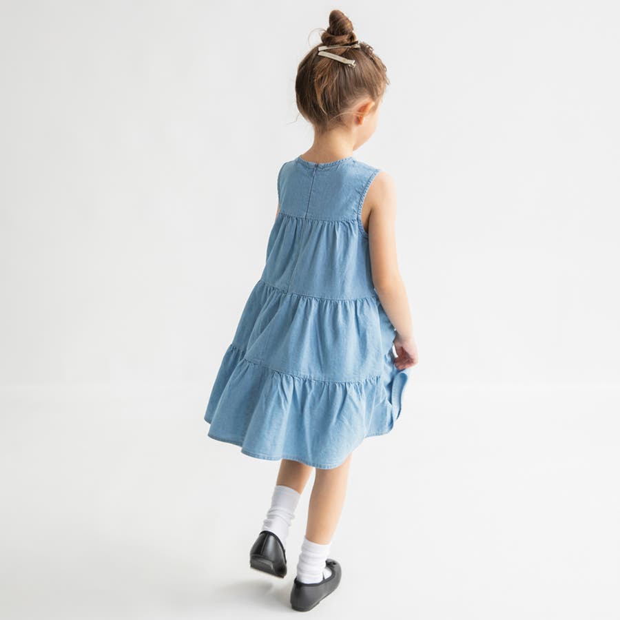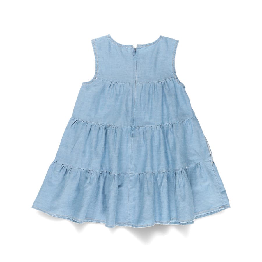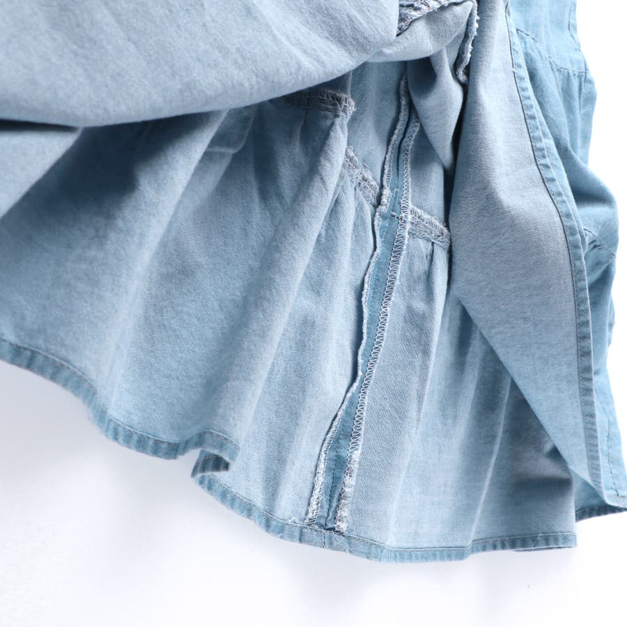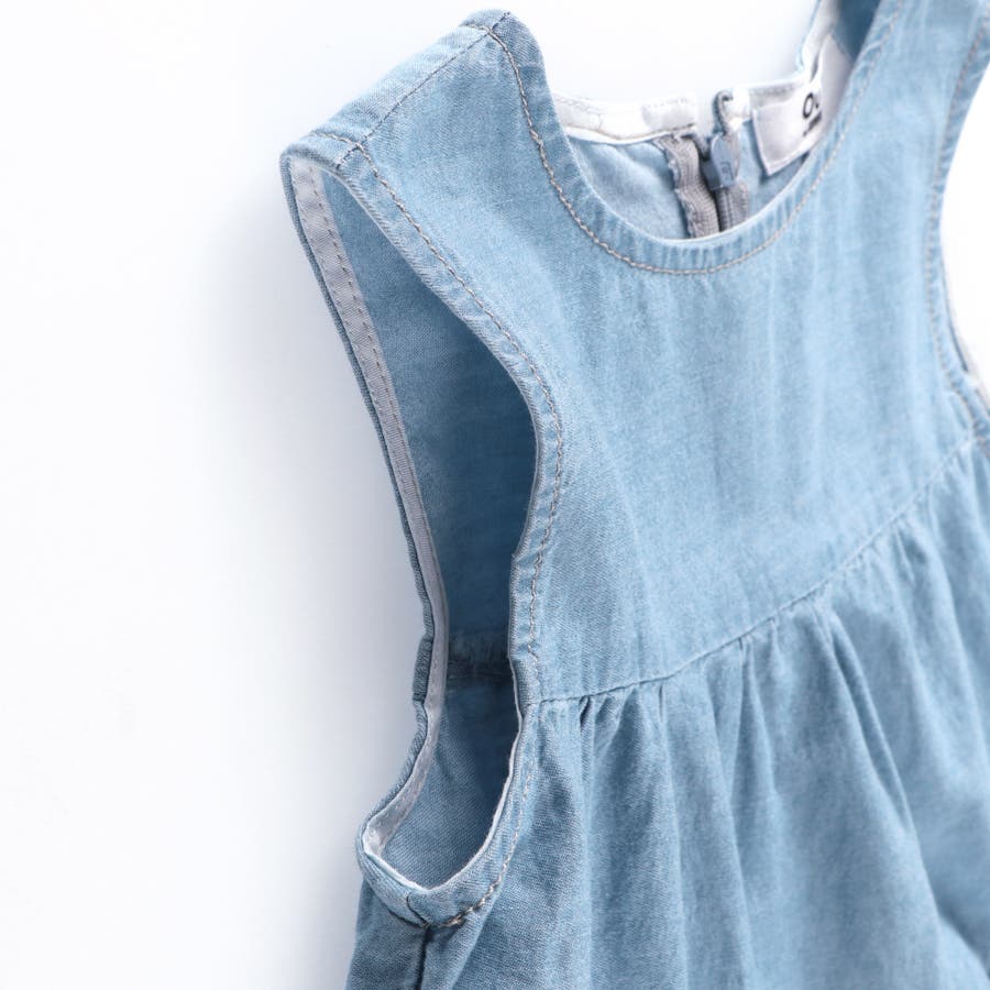 ノースリーブデザインと膝上丈で、デニム素材でも重たく